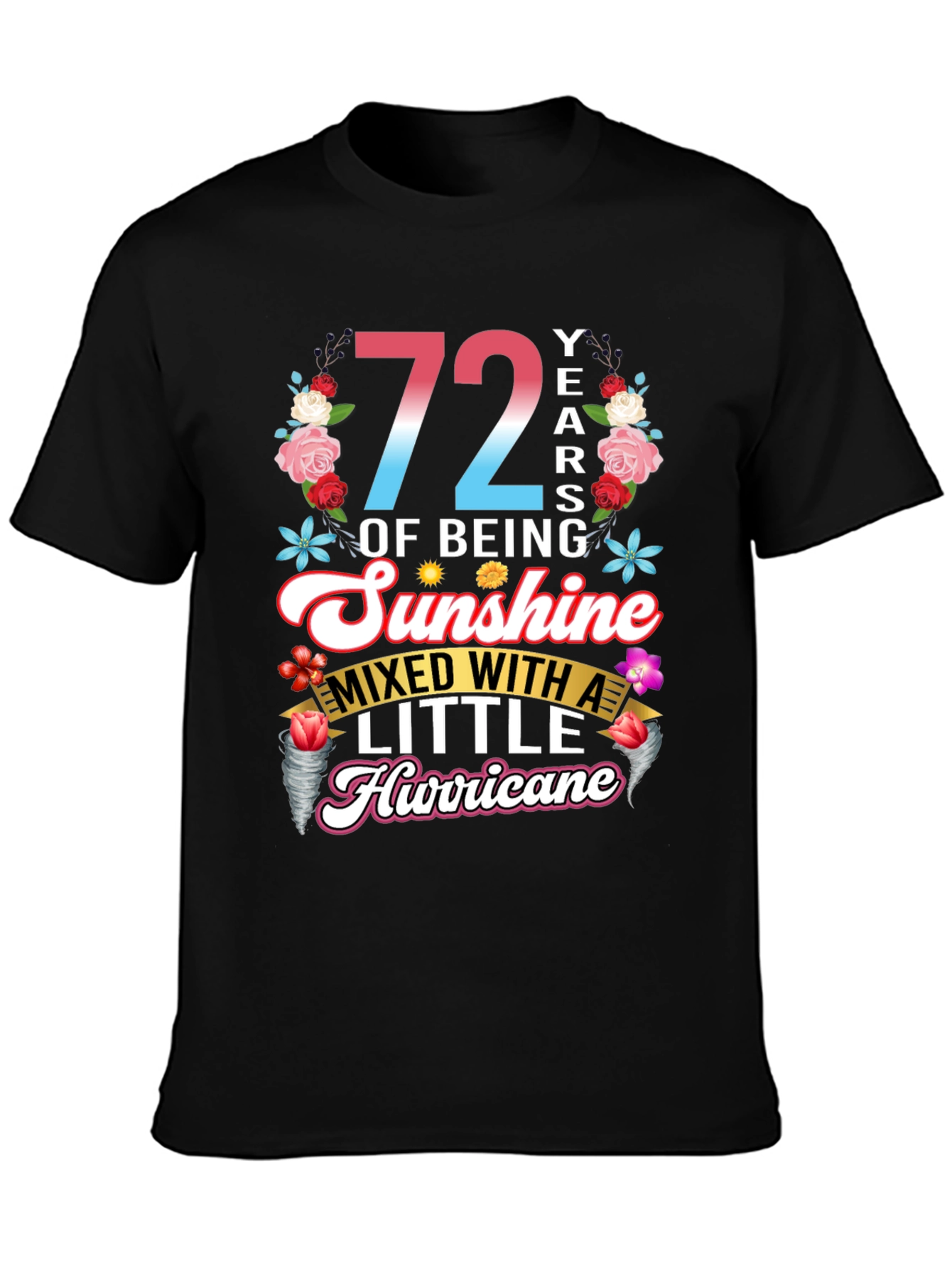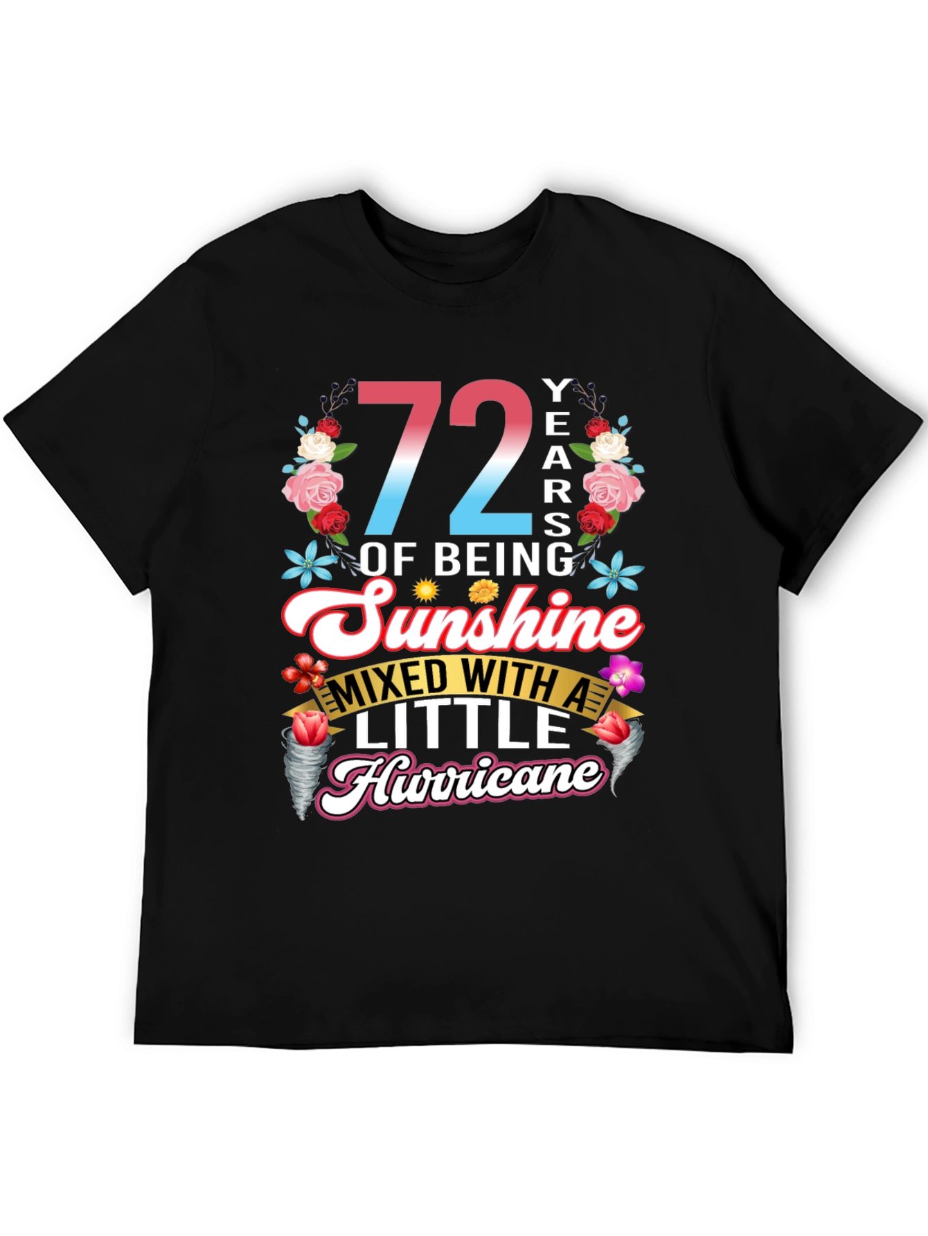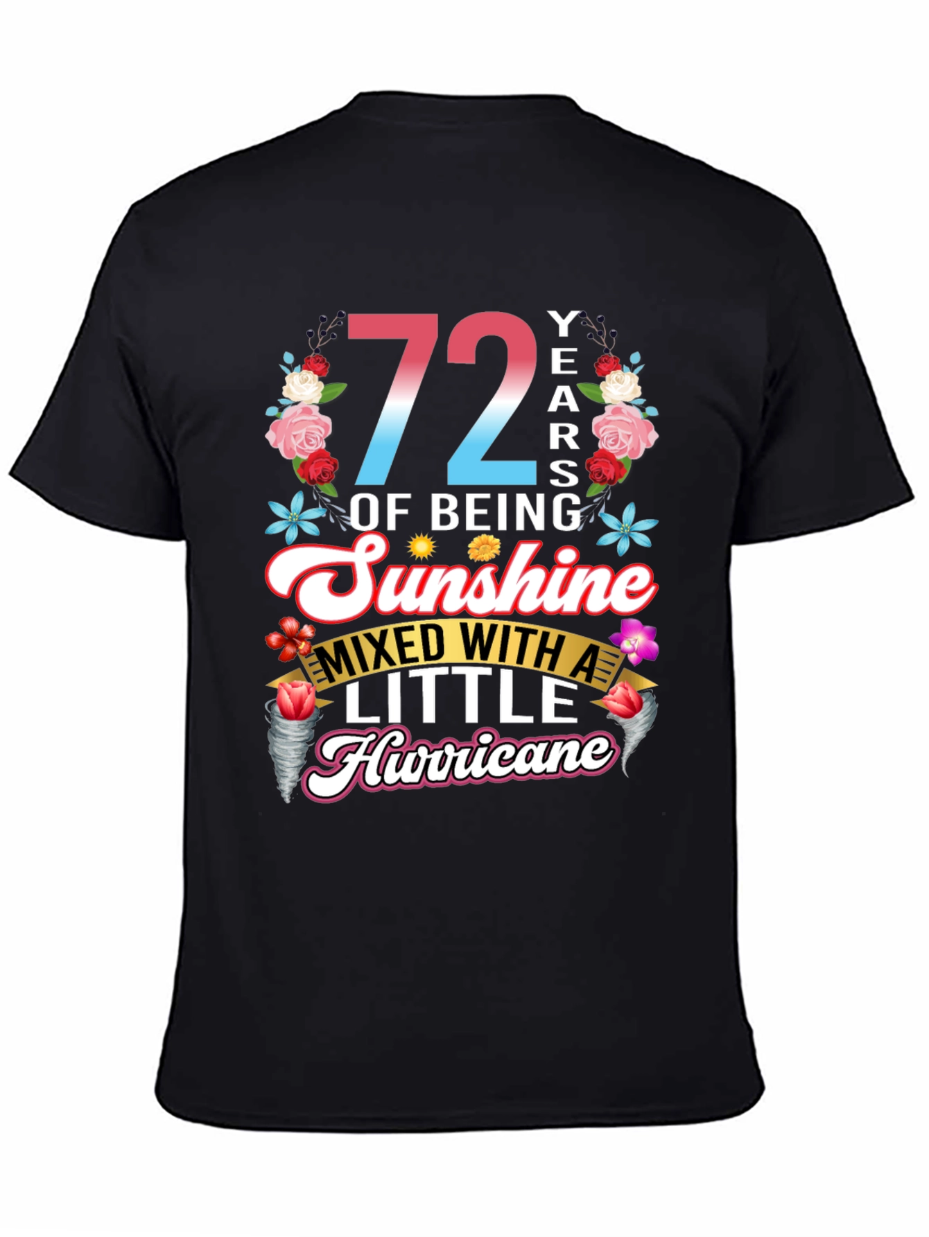 Celebra con estilo con esta camiseta única que celebra 72 años de ser pura alegría, ¡con un toque travieso! La prenda presenta un diseño vibrante con el número '72' en degradado de rosa a azul, rodeado de un alegre arreglo floral. La frase 'OF BEING Sunshine MIXED WITH A LITTLE Hurricane' está elegantemente escrita en fuentes divertidas y llamativas. Perfecta para cumpleaños, esta camiseta de color negro y manga corta es ideal para usar en fiestas, reuniones familiares o simplemente para expresar tu personalidad divertida y enérgica. ¡Un regalo original para alguien especial que ilumina la vida de los demás!