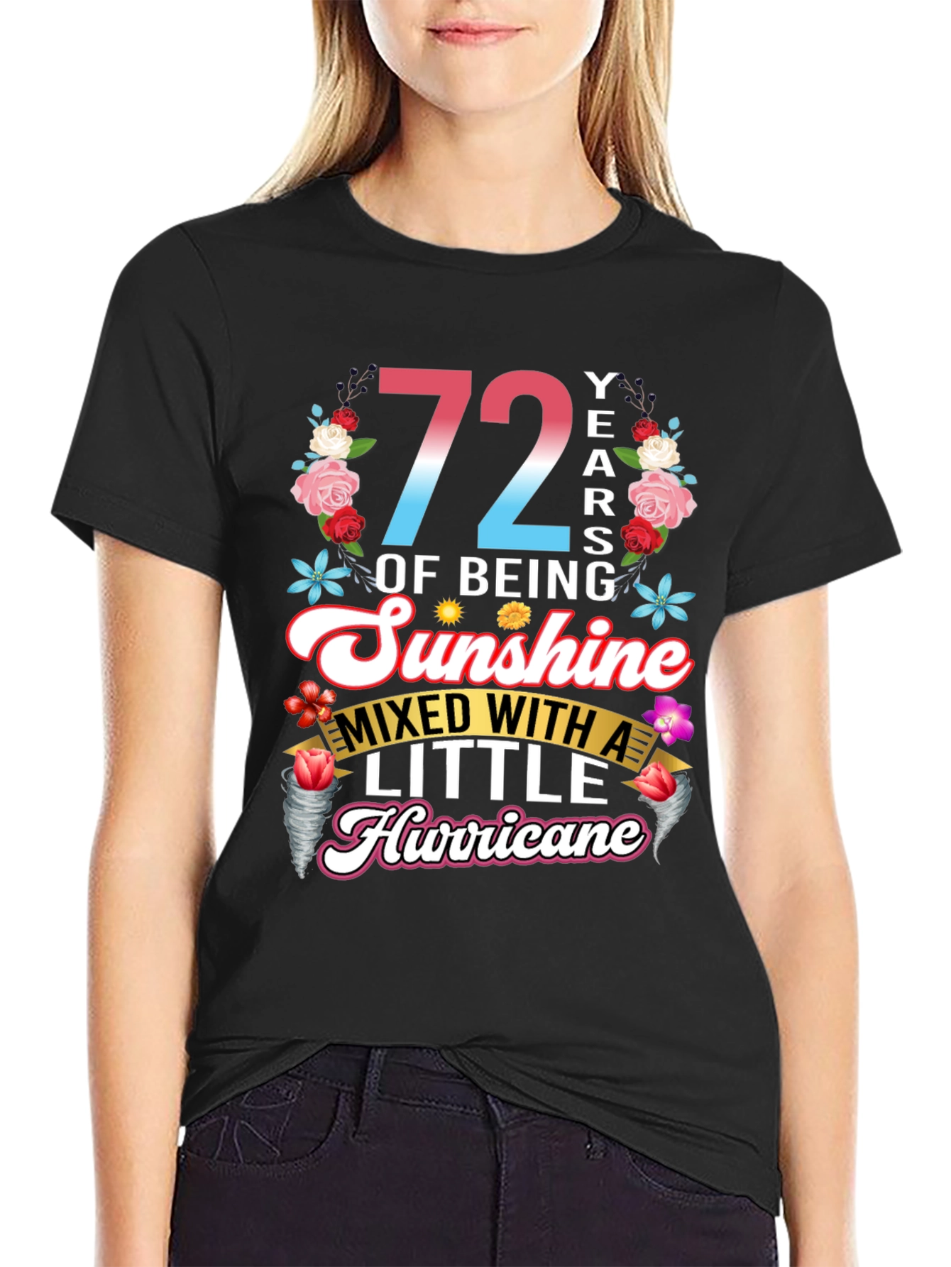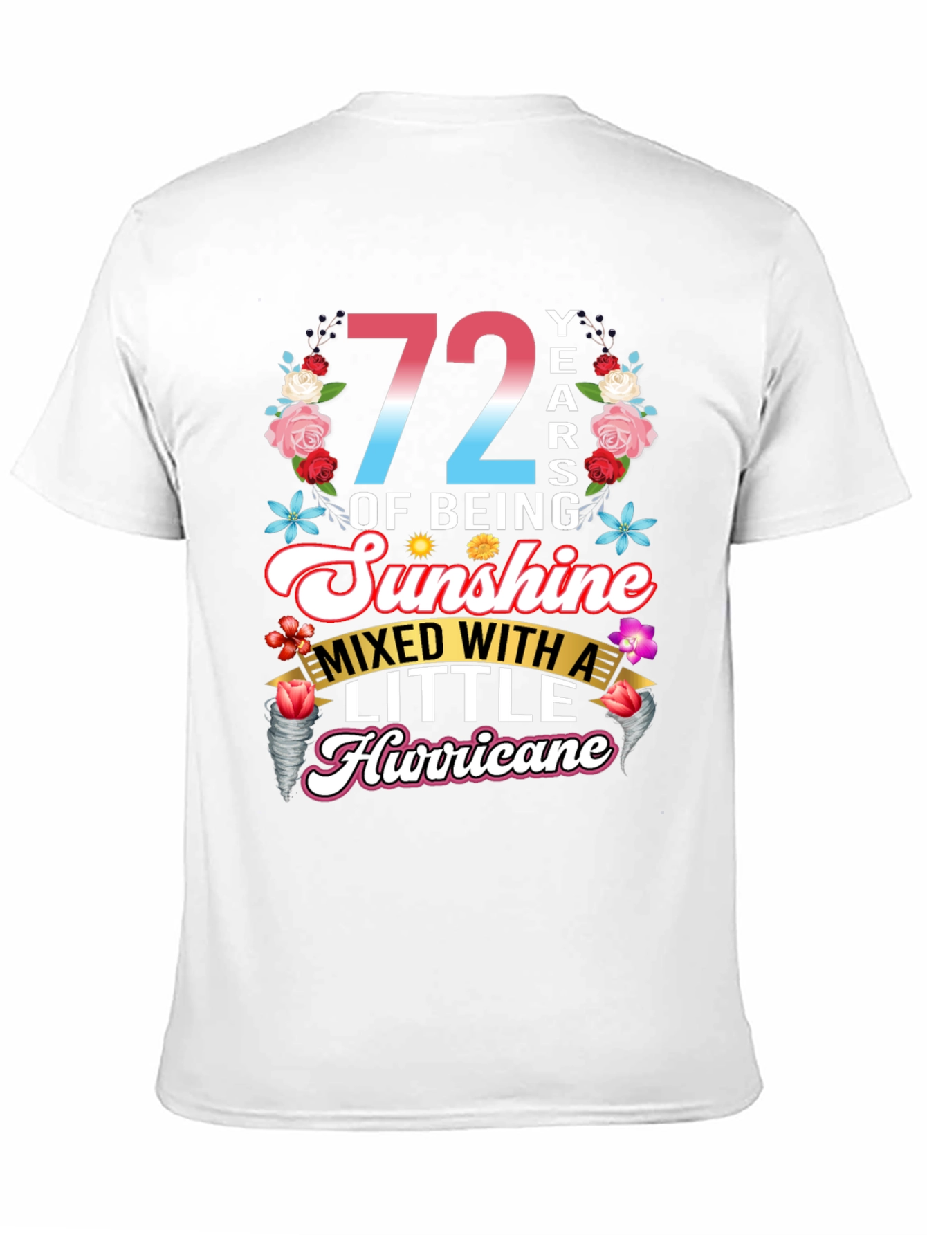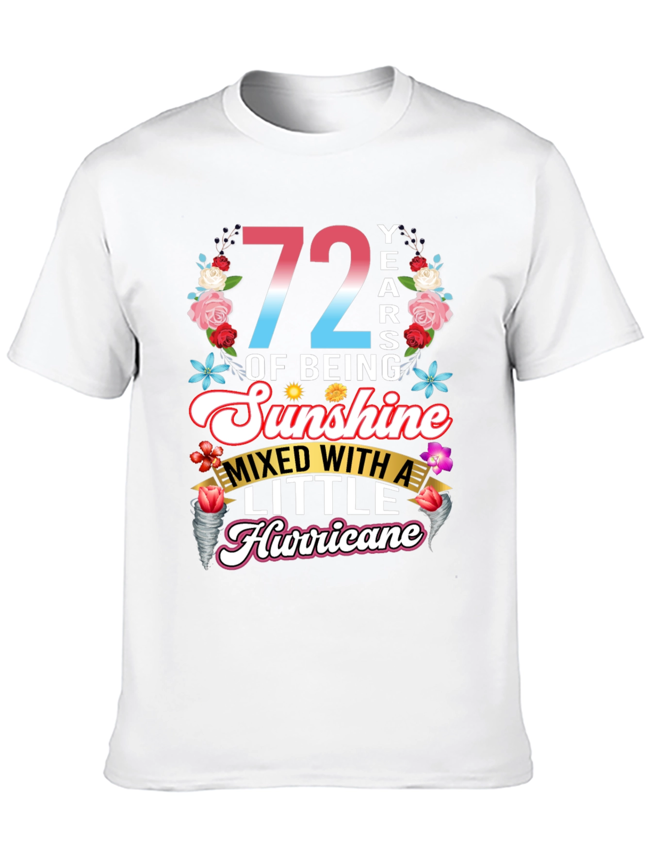 Celebra con estilo con esta camiseta única que celebra 72 años de ser pura alegría, ¡con un toque travieso! La prenda presenta un diseño vibrante con el número '72' en degradado de rosa a azul, rodeado de un alegre arreglo floral. La frase 'OF BEING Sunshine MIXED WITH A LITTLE Hurricane' está elegantemente escrita en fuentes divertidas y llamativas. Perfecta para cumpleaños, esta camiseta de color negro y manga corta es ideal para usar en fiestas, reuniones familiares o simplemente para expresar tu personalidad divertida y enérgica. ¡Un regalo original para alguien especial que ilumina la vida de los demás!