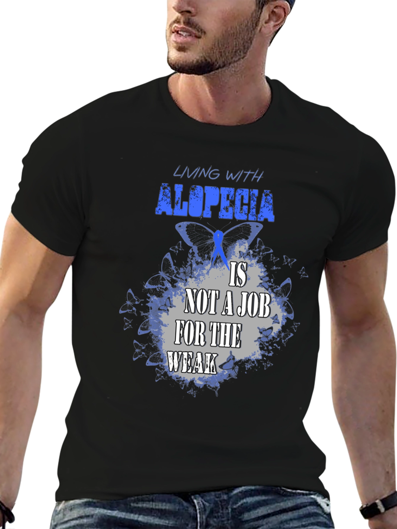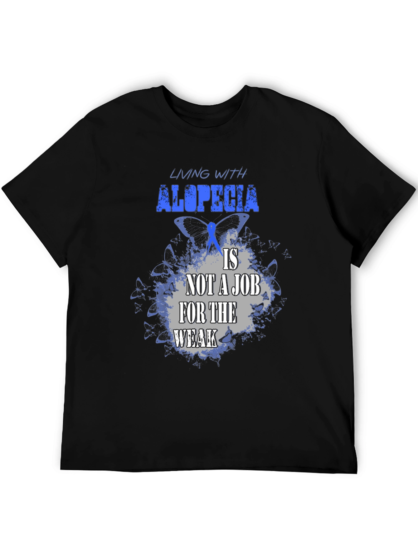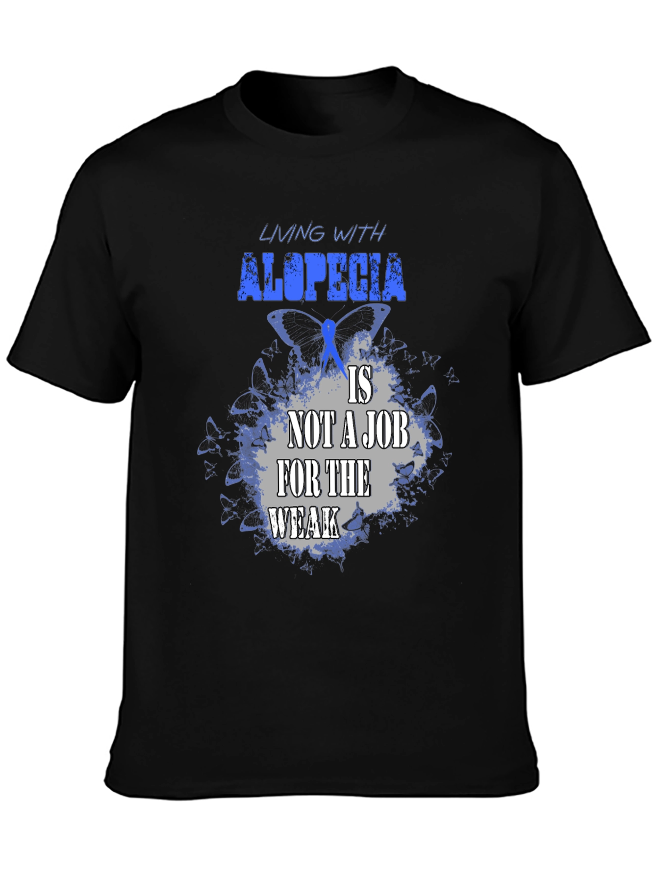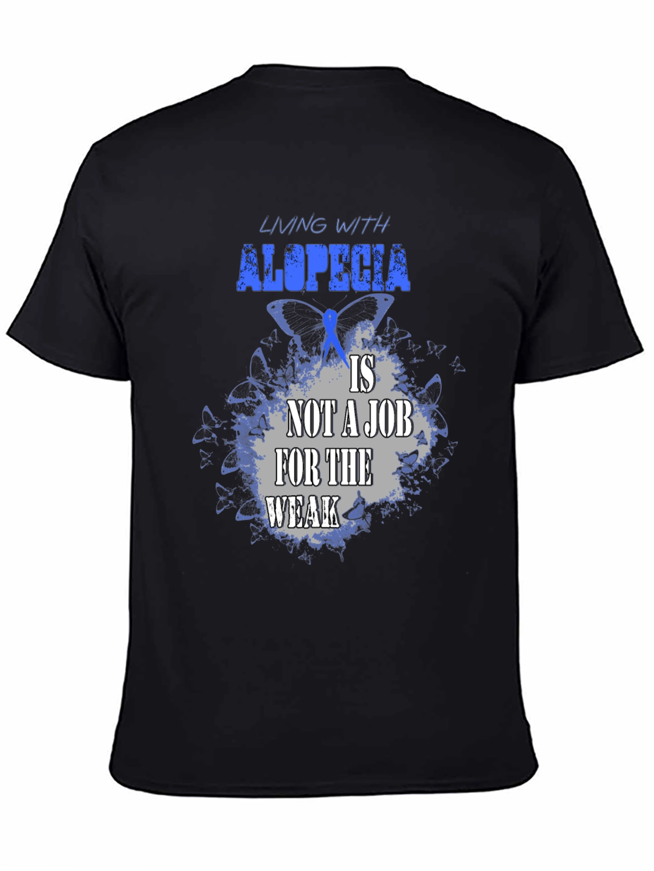 Luce esta impactante camiseta negra con un diseño alusivo a la alopecia. La frase "Living with alopecia is not a job for the weak" (Vivir con alopecia no es un trabajo para débiles) resalta en letras azules y grises sobre un fondo de mariposas azules, simbolizando la fortaleza y resiliencia de quienes conviven con esta condición. Confeccionada en un tejido suave y cómodo, esta camiseta es perfecta para mostrar tu apoyo, crear conciencia o simplemente expresar tu individualidad con estilo. Úsala en eventos benéficos, reuniones con amigos o en tu día a día para transmitir un mensaje poderoso. ¡Muestra tu fuerza con esta camiseta única!