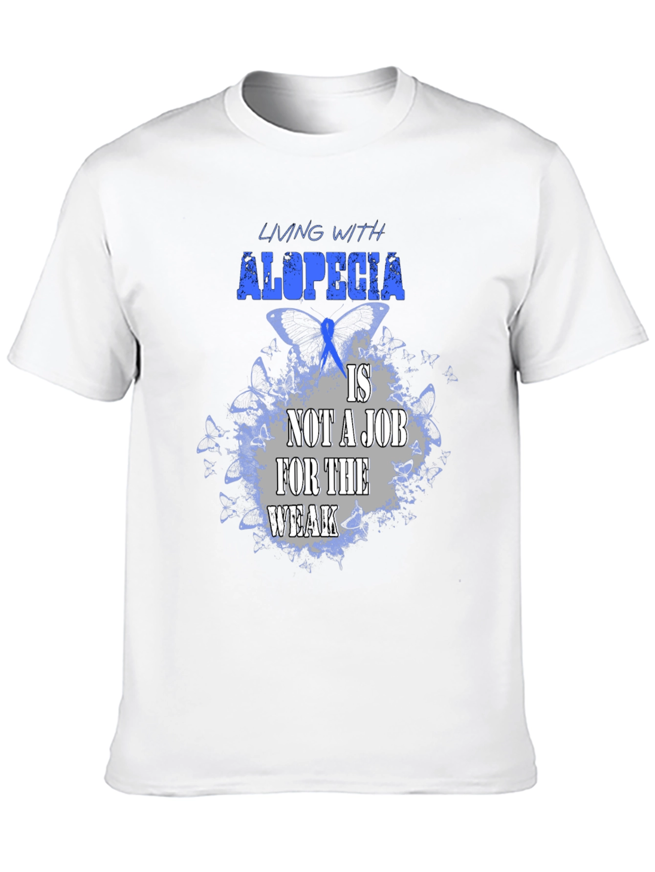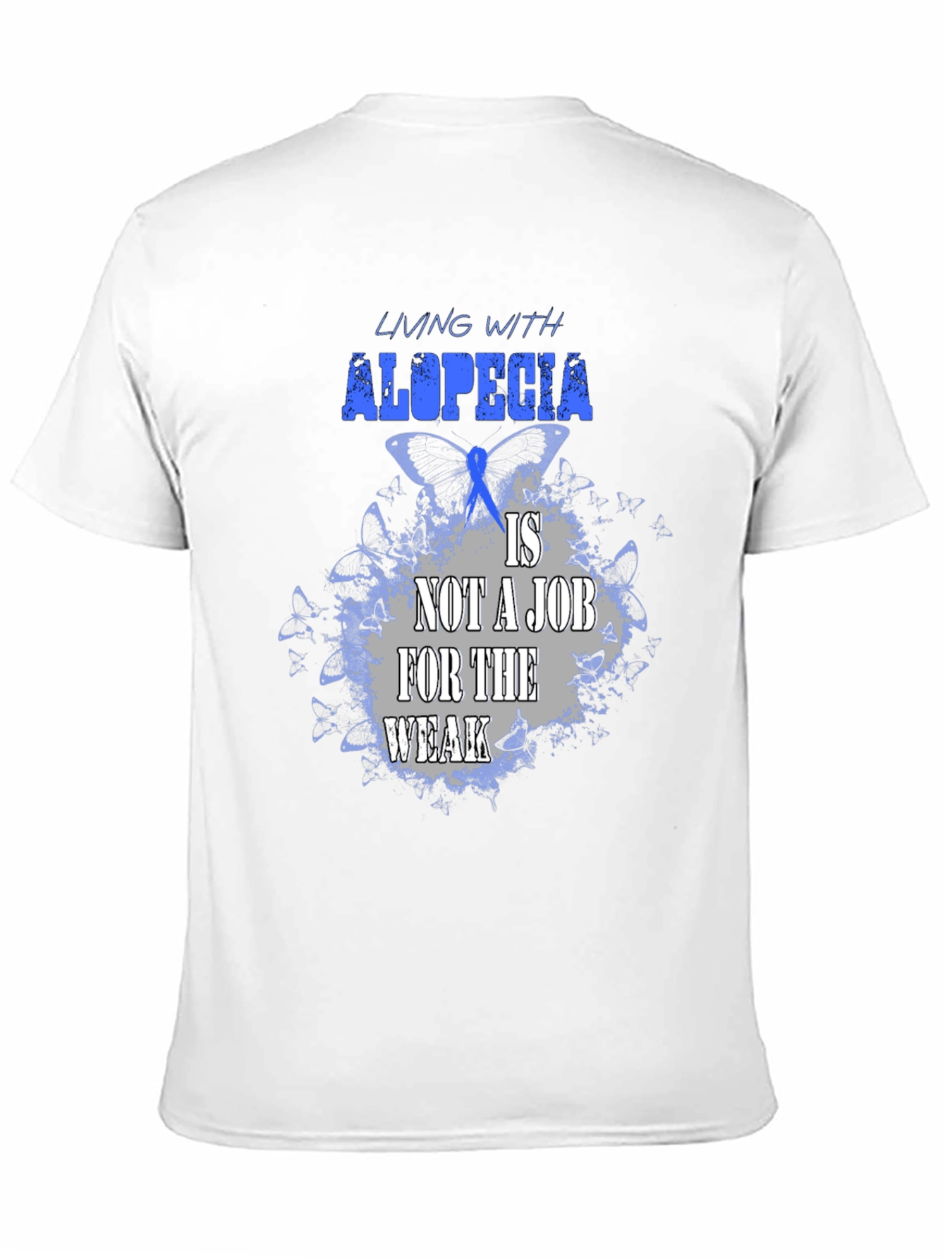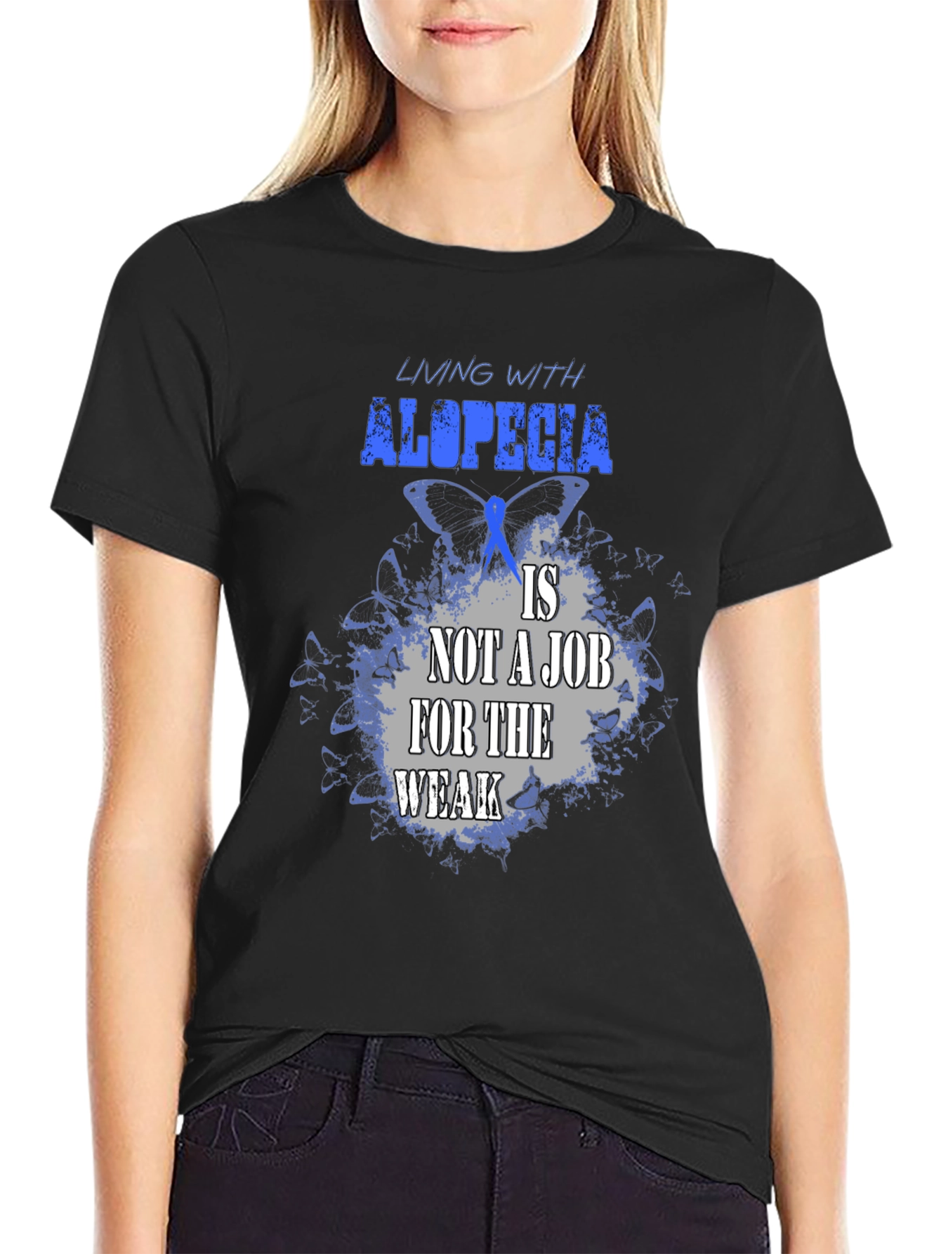 Luce esta impactante camiseta negra con un diseño alusivo a la alopecia. La frase "Living with alopecia is not a job for the weak" (Vivir con alopecia no es un trabajo para débiles) resalta en letras azules y grises sobre un fondo de mariposas azules, simbolizando la fortaleza y resiliencia de quienes conviven con esta condición. Confeccionada en un tejido suave y cómodo, esta camiseta es perfecta para mostrar tu apoyo, crear conciencia o simplemente expresar tu individualidad con estilo. Úsala en eventos benéficos, reuniones con amigos o en tu día a día para transmitir un mensaje poderoso. ¡Muestra tu fuerza con esta camiseta única!
