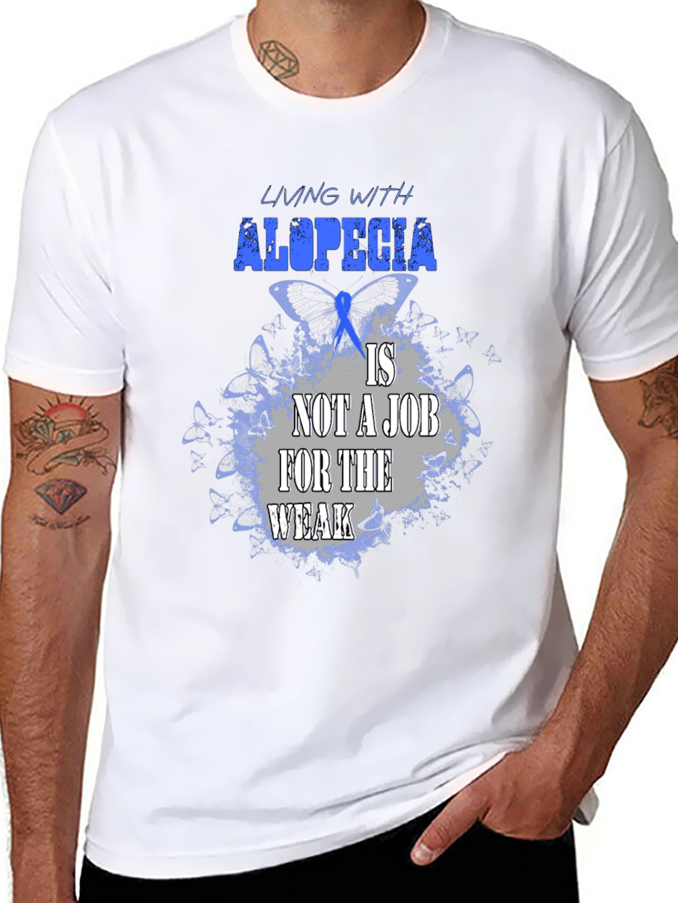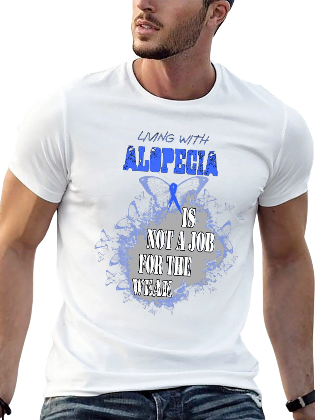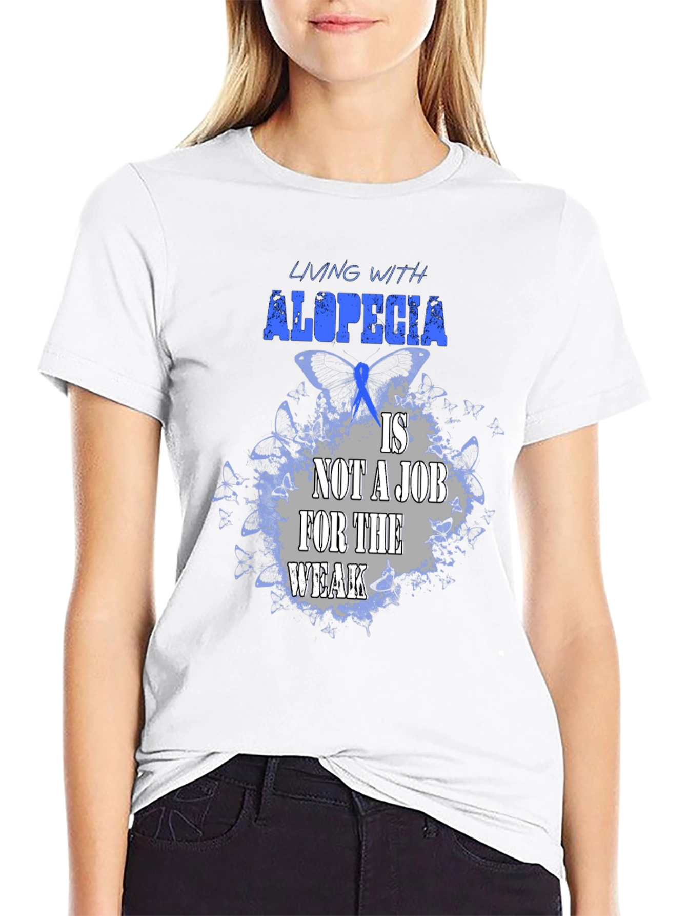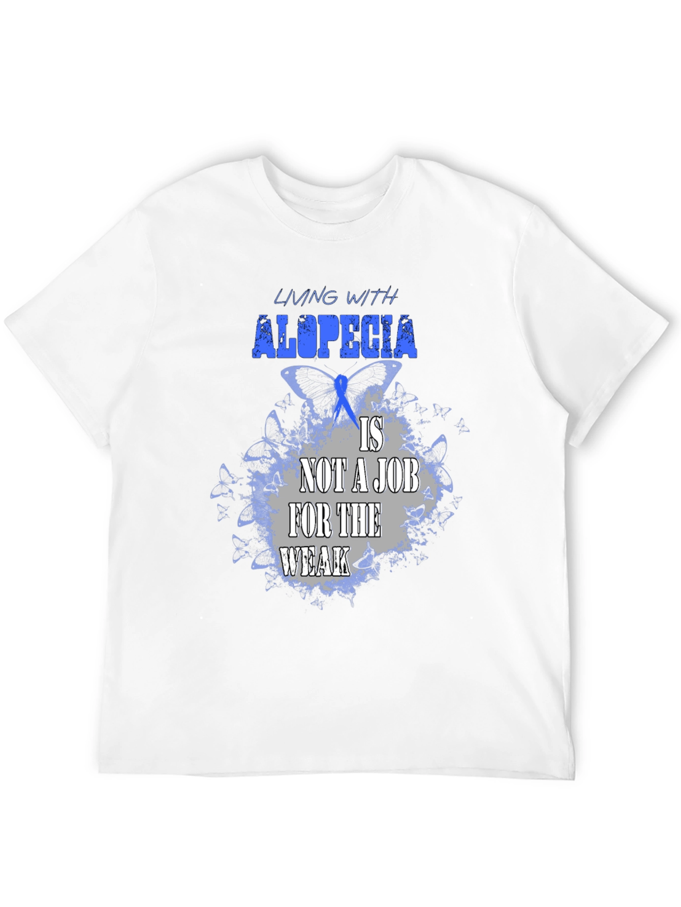 Luce esta impactante camiseta negra con un diseño alusivo a la alopecia. La frase "Living with alopecia is not a job for the weak" (Vivir con alopecia no es un trabajo para débiles) resalta en letras azules y grises sobre un fondo de mariposas azules, simbolizando la fortaleza y resiliencia de quienes conviven con esta condición. Confeccionada en un tejido suave y cómodo, esta camiseta es perfecta para mostrar tu apoyo, crear conciencia o simplemente expresar tu individualidad con estilo. Úsala en eventos benéficos, reuniones con amigos o en tu día a día para transmitir un mensaje poderoso. ¡Muestra tu fuerza con esta camiseta única!