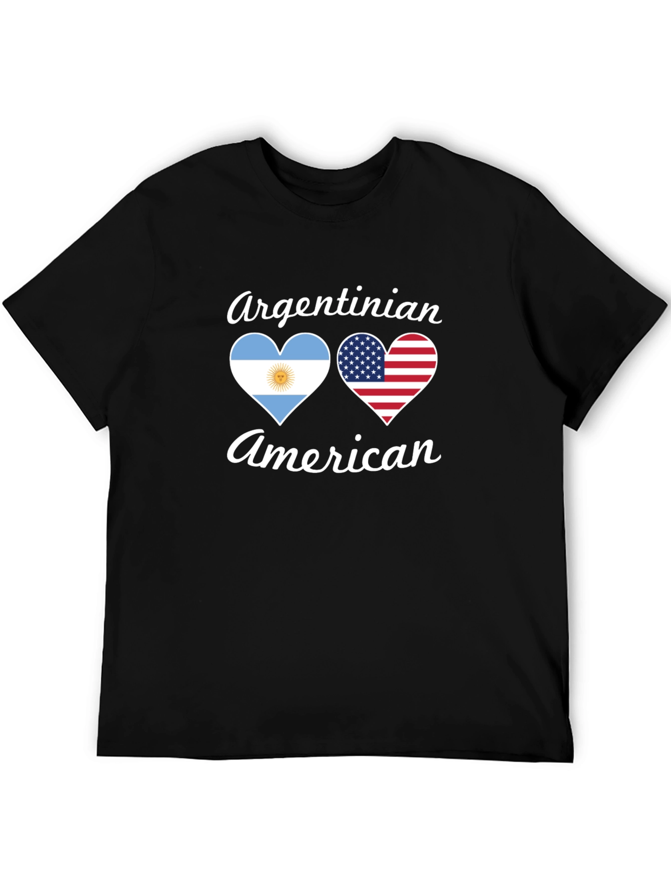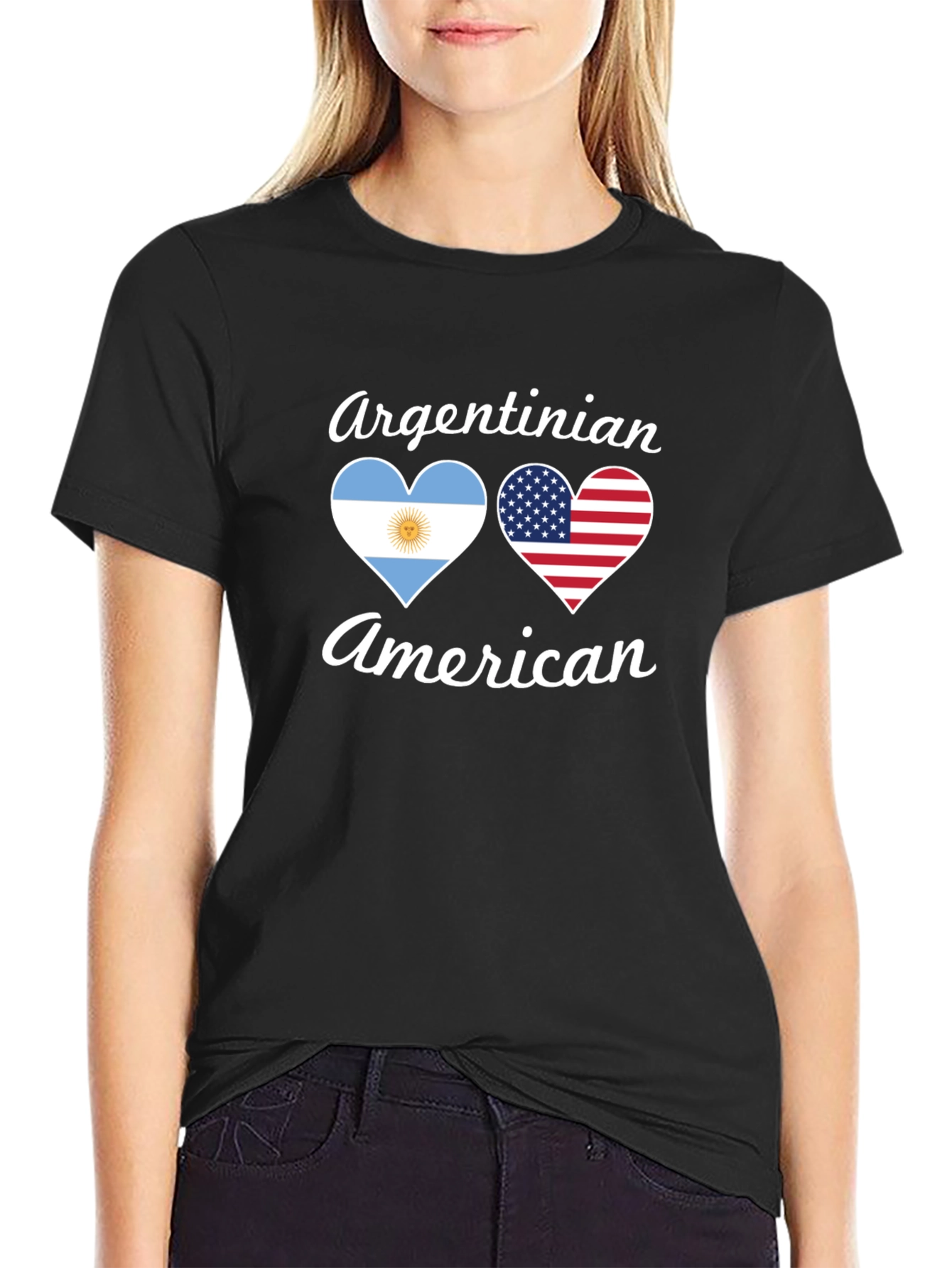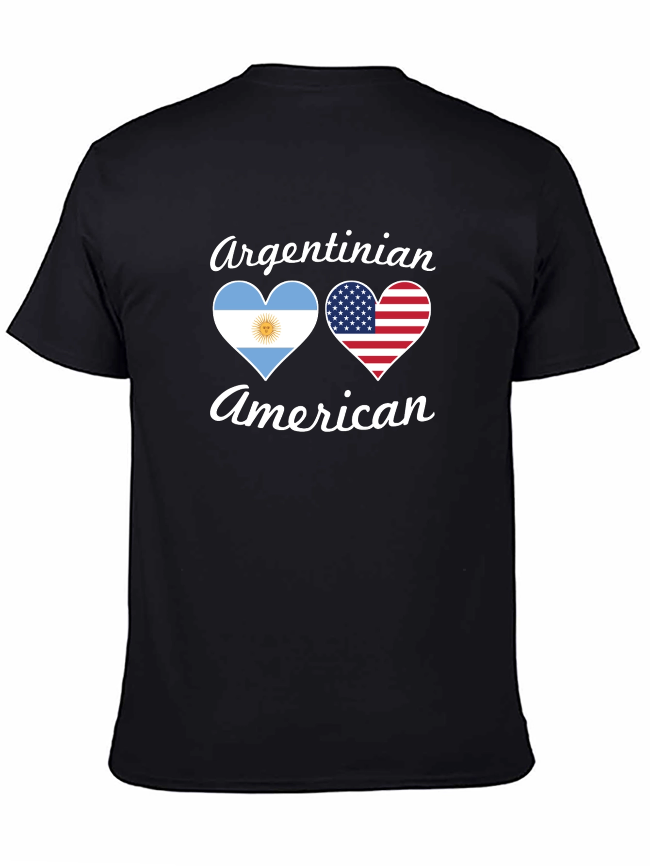 Muestra tu orgullo dual con esta elegante camiseta negra. Presenta un diseño único con las palabras "Argentinian American" dispuestas artísticamente sobre dos corazones, cada uno adornado con las banderas de Argentina y Estados Unidos respectivamente. Ideal para celebrar tu herencia mixta, esta camiseta es perfecta para eventos culturales, reuniones familiares o simplemente para expresar tu identidad única. Fabricada con materiales suaves y cómodos, esta camiseta de corte clásico te asegura estilo y confort durante todo el día. Un regalo perfecto para aquellos que aprecian sus raíces tanto argentinas como americanas.