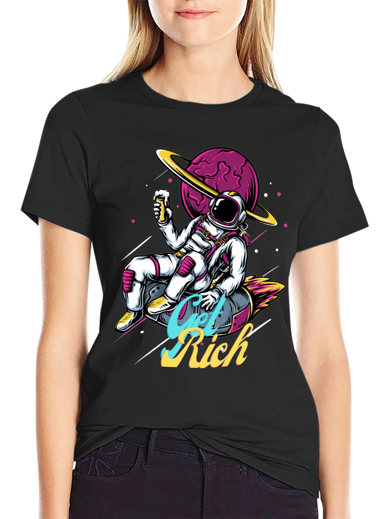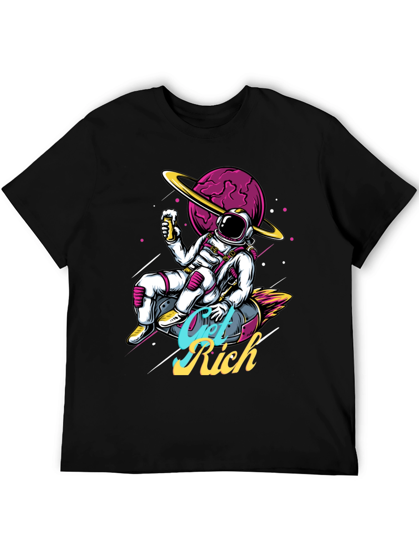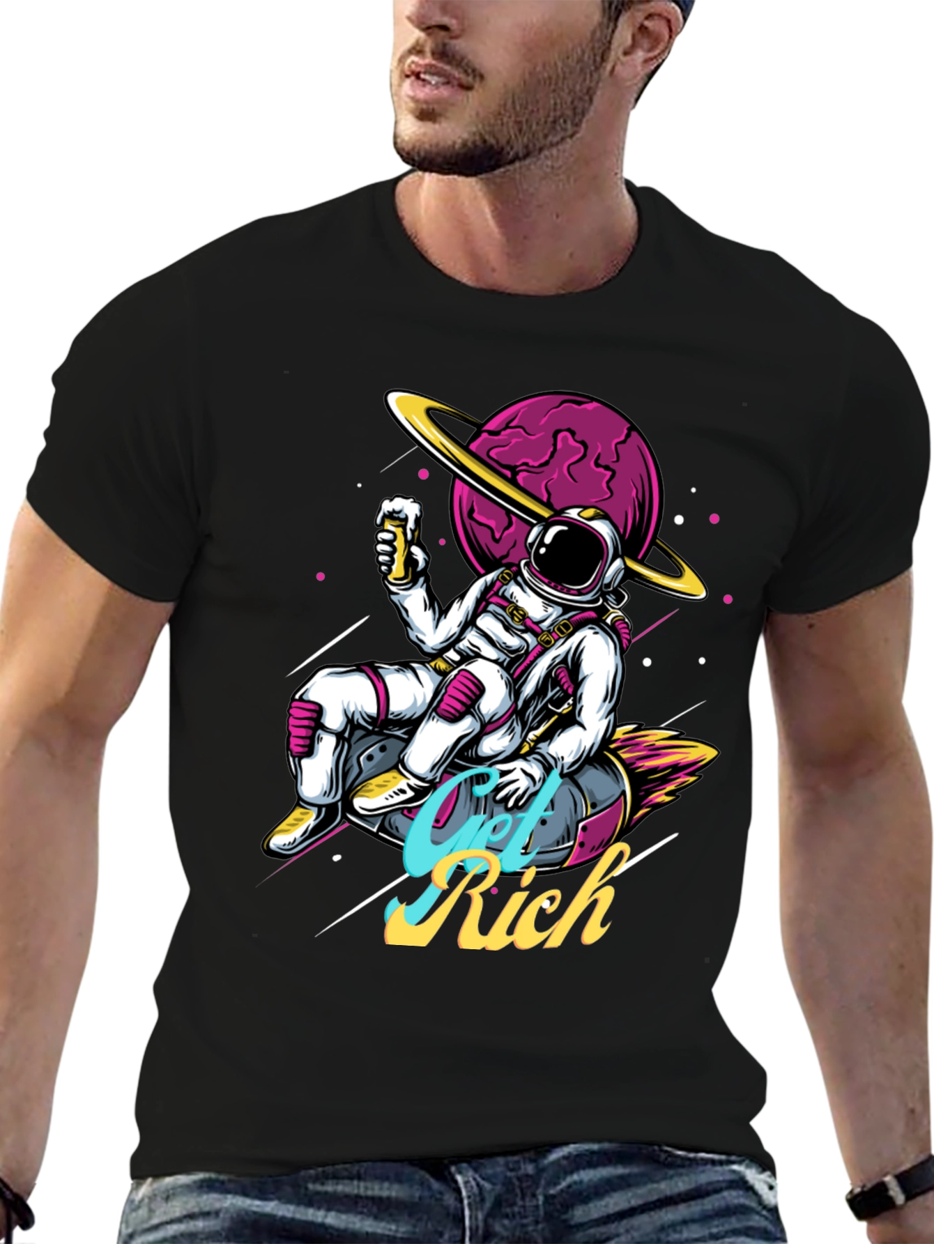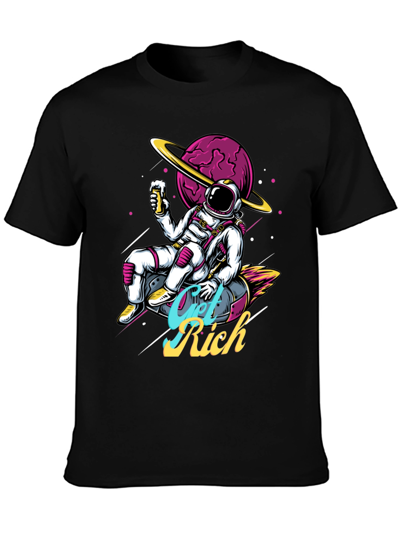 Esta camiseta negra presenta un diseño llamativo de un astronauta relajado, disfrutando de una bebida mientras vuela sobre un cohete. Un planeta con anillos sirve de telón de fondo, creando una atmósfera cósmica y divertida. La frase "Get Rich" añade un toque audaz y ambicioso al diseño. Perfecta para quienes aman el espacio, la moda urbana y quieren expresar su espíritu emprendedor. Ideal para usar en eventos informales, salidas con amigos o simplemente para añadir un toque único a tu estilo diario. Fabricada con materiales suaves y cómodos para un uso prolongado.
