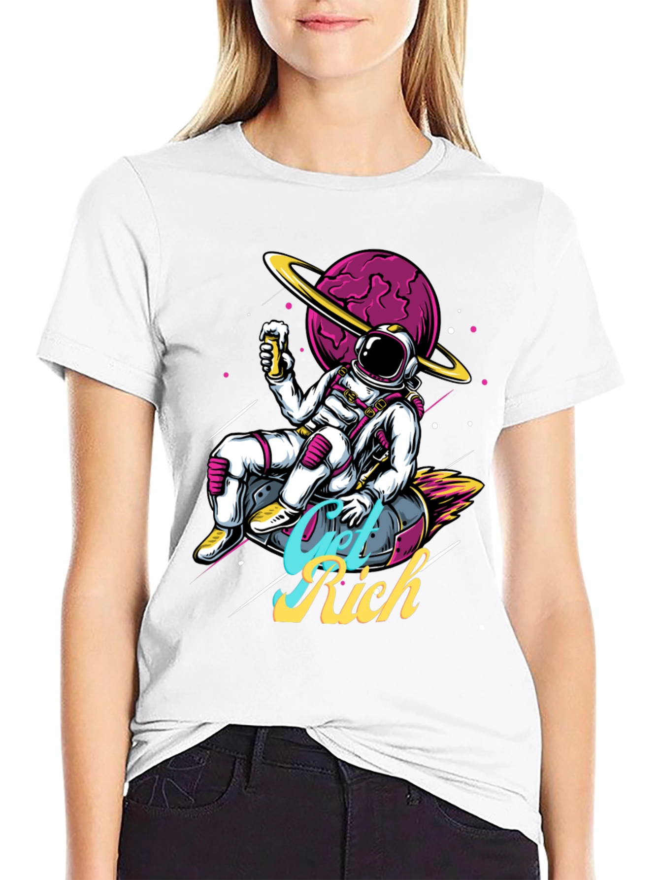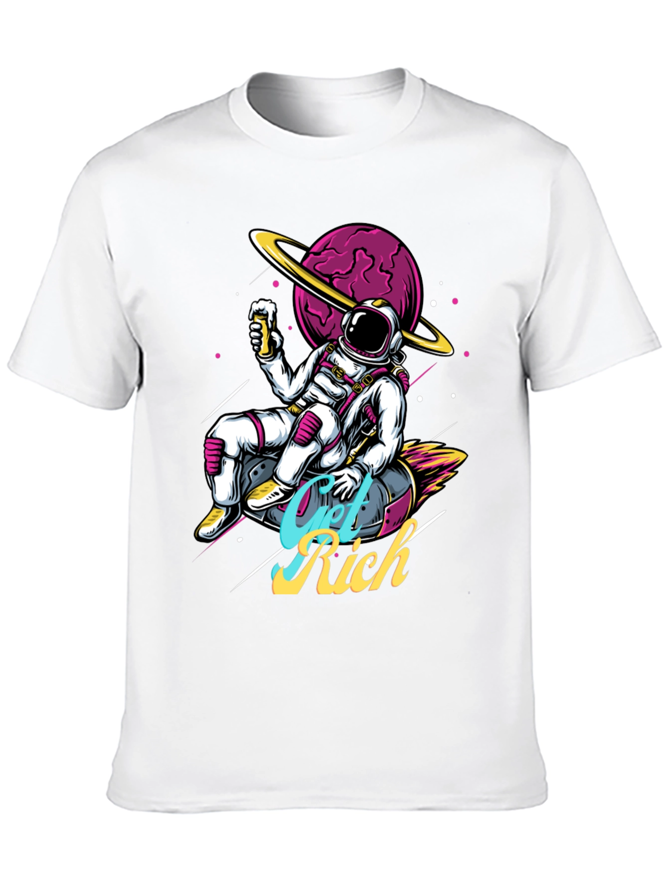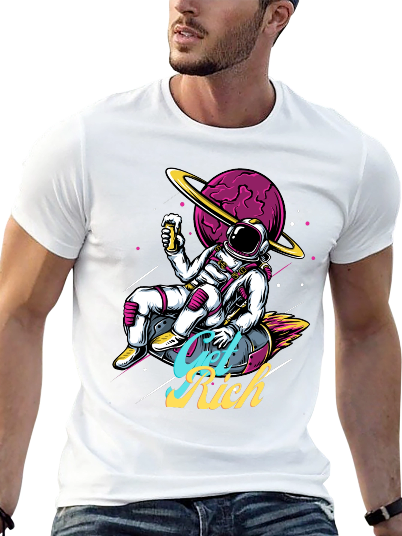 Esta camiseta negra presenta un diseño llamativo de un astronauta relajado, disfrutando de una bebida mientras vuela sobre un cohete. Un planeta con anillos sirve de telón de fondo, creando una atmósfera cósmica y divertida. La frase "Get Rich" añade un toque audaz y ambicioso al diseño. Perfecta para quienes aman el espacio, la moda urbana y quieren expresar su espíritu emprendedor. Ideal para usar en eventos informales, salidas con amigos o simplemente para añadir un toque único a tu estilo diario. Fabricada con materiales suaves y cómodos para un uso prolongado.