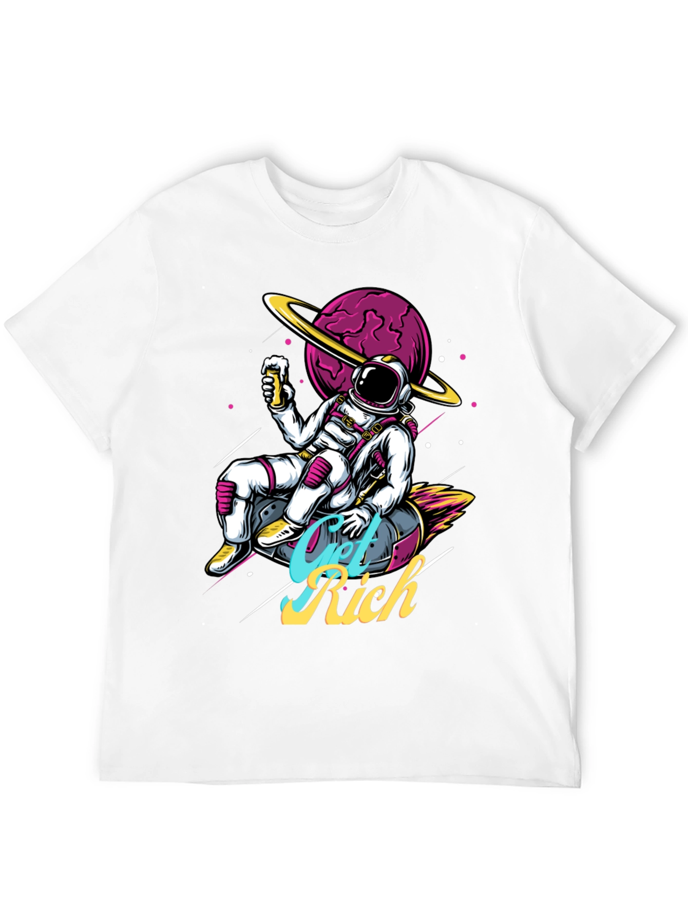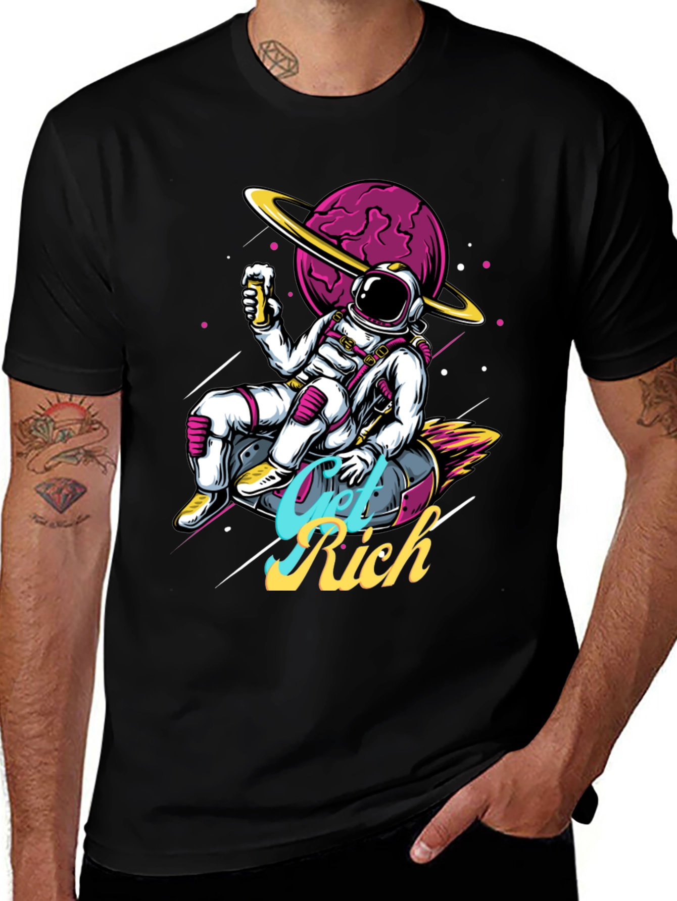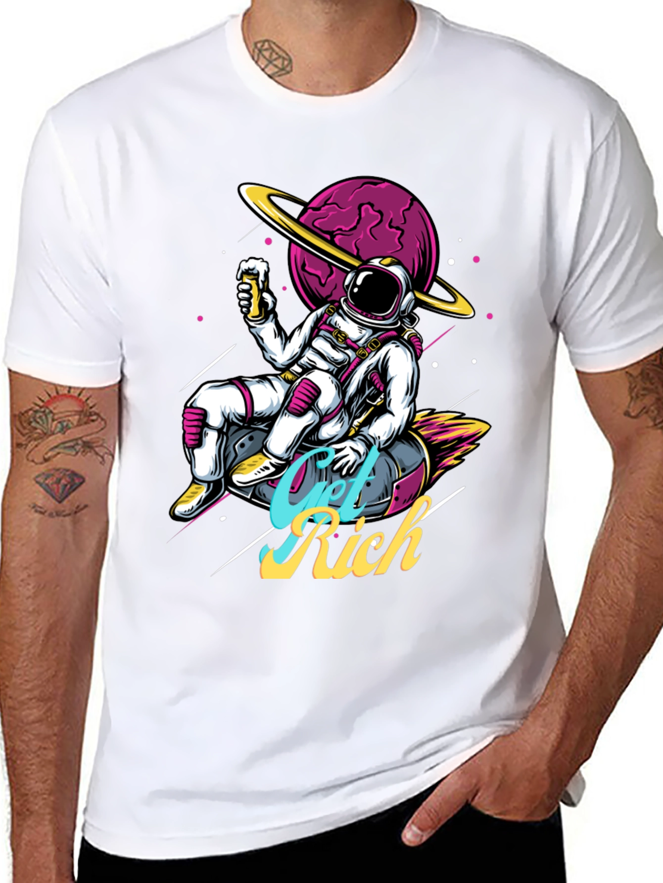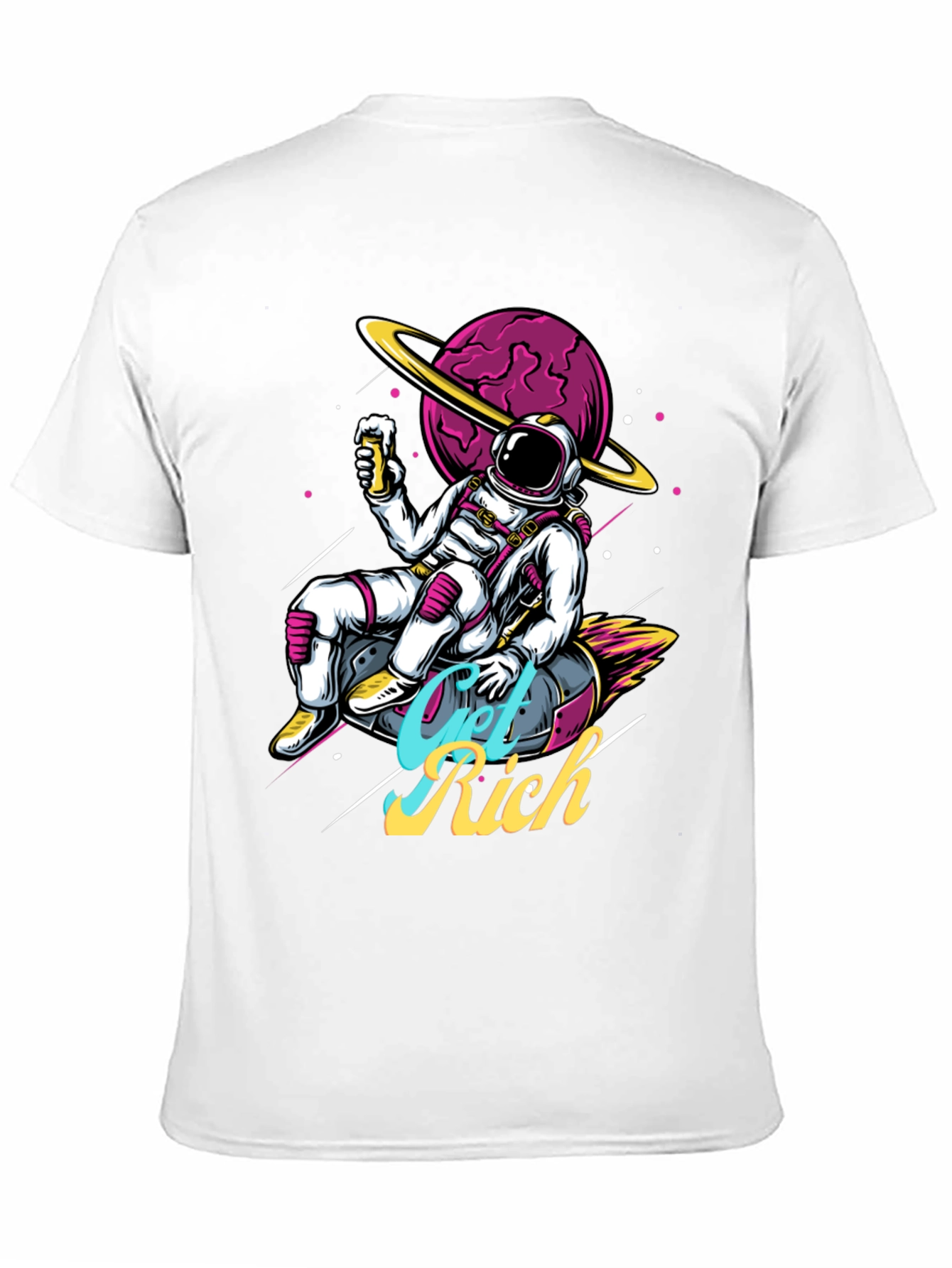 Esta camiseta negra presenta un diseño llamativo de un astronauta relajado, disfrutando de una bebida mientras vuela sobre un cohete. Un planeta con anillos sirve de telón de fondo, creando una atmósfera cósmica y divertida. La frase "Get Rich" añade un toque audaz y ambicioso al diseño. Perfecta para quienes aman el espacio, la moda urbana y quieren expresar su espíritu emprendedor. Ideal para usar en eventos informales, salidas con amigos o simplemente para añadir un toque único a tu estilo diario. Fabricada con materiales suaves y cómodos para un uso prolongado.