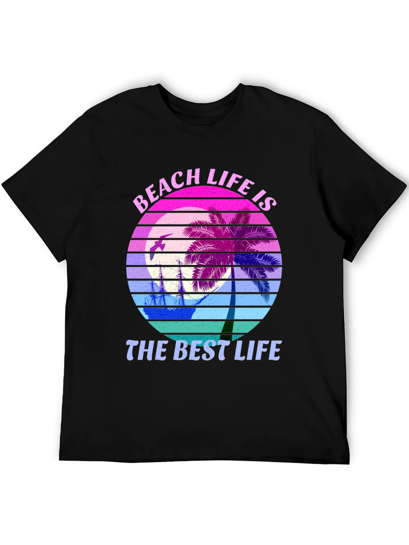 Vive el espíritu del verano con esta camiseta negra de diseño único. Presenta una ilustración vibrante de una puesta de sol tropical con palmeras, un velero y una gaviota, todo enmarcado en un círculo con los lemas "Beach Life is the Best Life". Los colores son intensos, con degradados de rosa, morado y azul, creando un ambiente relajante y divertido. Perfecta para usar en la playa, en una fiesta veraniega o simplemente para expresar tu amor por el estilo de vida playero. ¡Consigue la tuya y lleva el verano contigo a donde vayas!