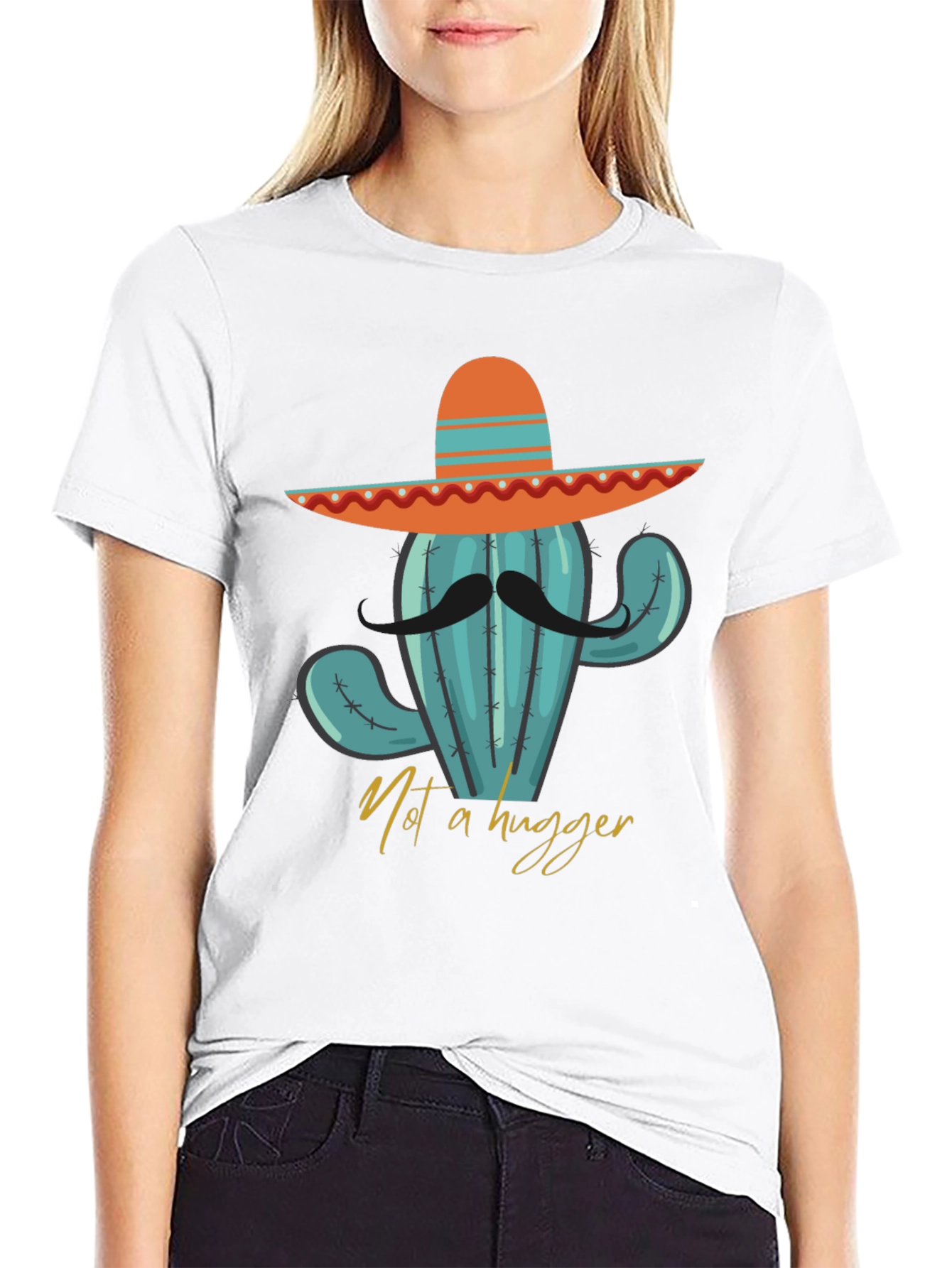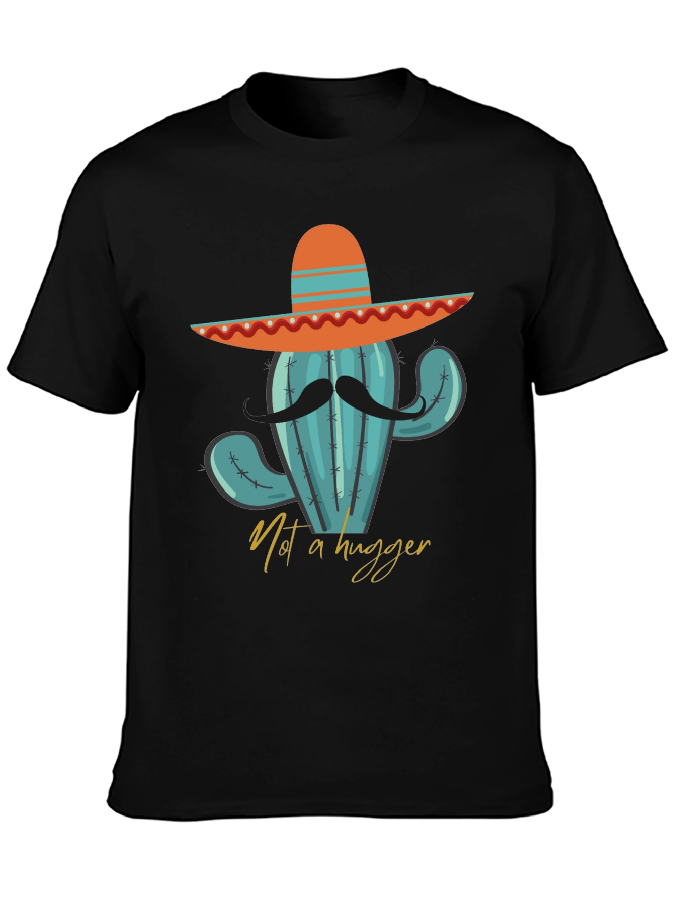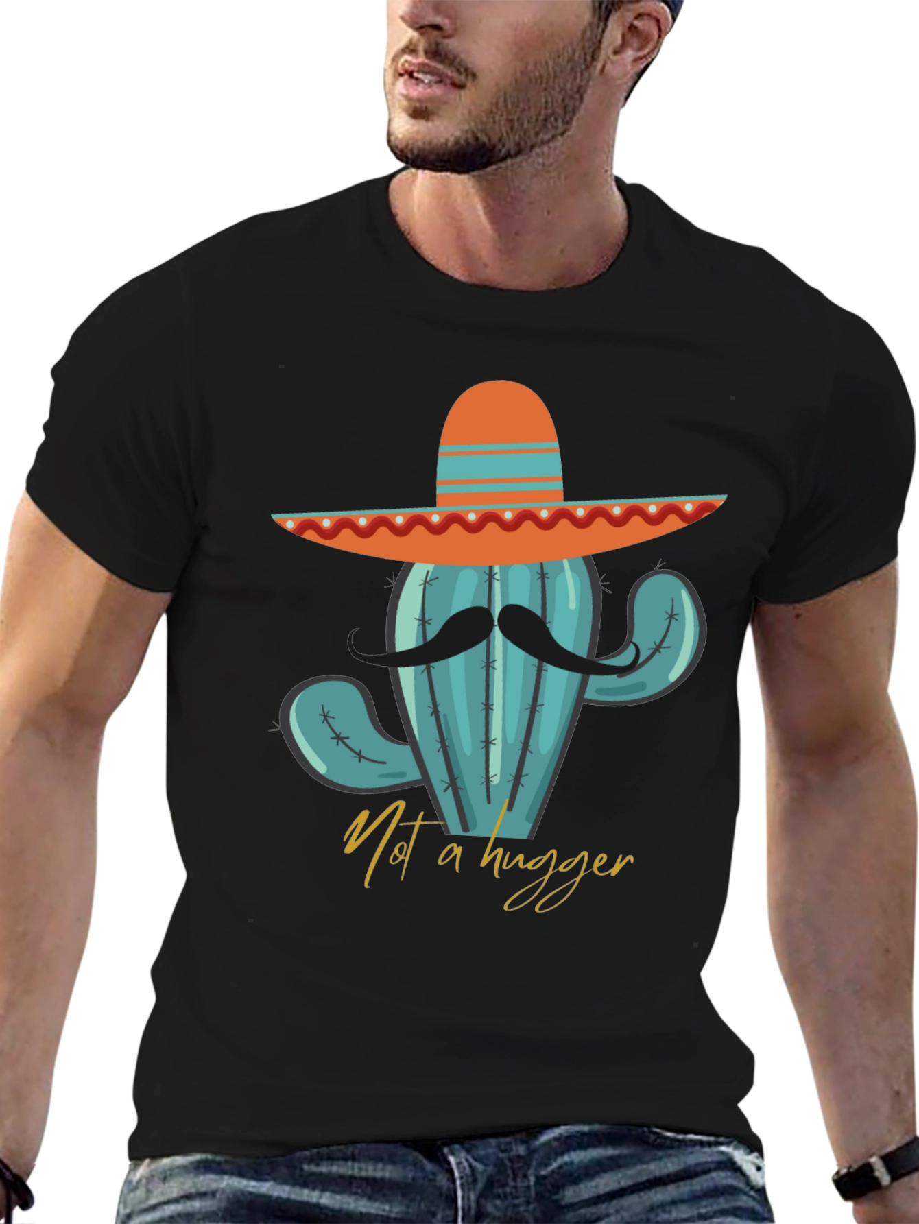 ¡Luce esta divertida camiseta negra con un toque mexicano! Presenta un adorable cactus azul verdoso con un sombrero naranja y rayas turquesas, acompañado de un elegante bigote negro. La frase "Not a hugger" (No soy abrazador) impresa en una tipografía cursiva de color dorado, añade un toque de humor. Perfecta para aquellos con un sentido del humor seco y un estilo único. Ideal para llevar en salidas informales, fiestas temáticas o simplemente para expresar tu personalidad de una manera divertida. ¡Esta camiseta es la elección perfecta para destacar entre la multitud con un estilo relajado pero llamativo!