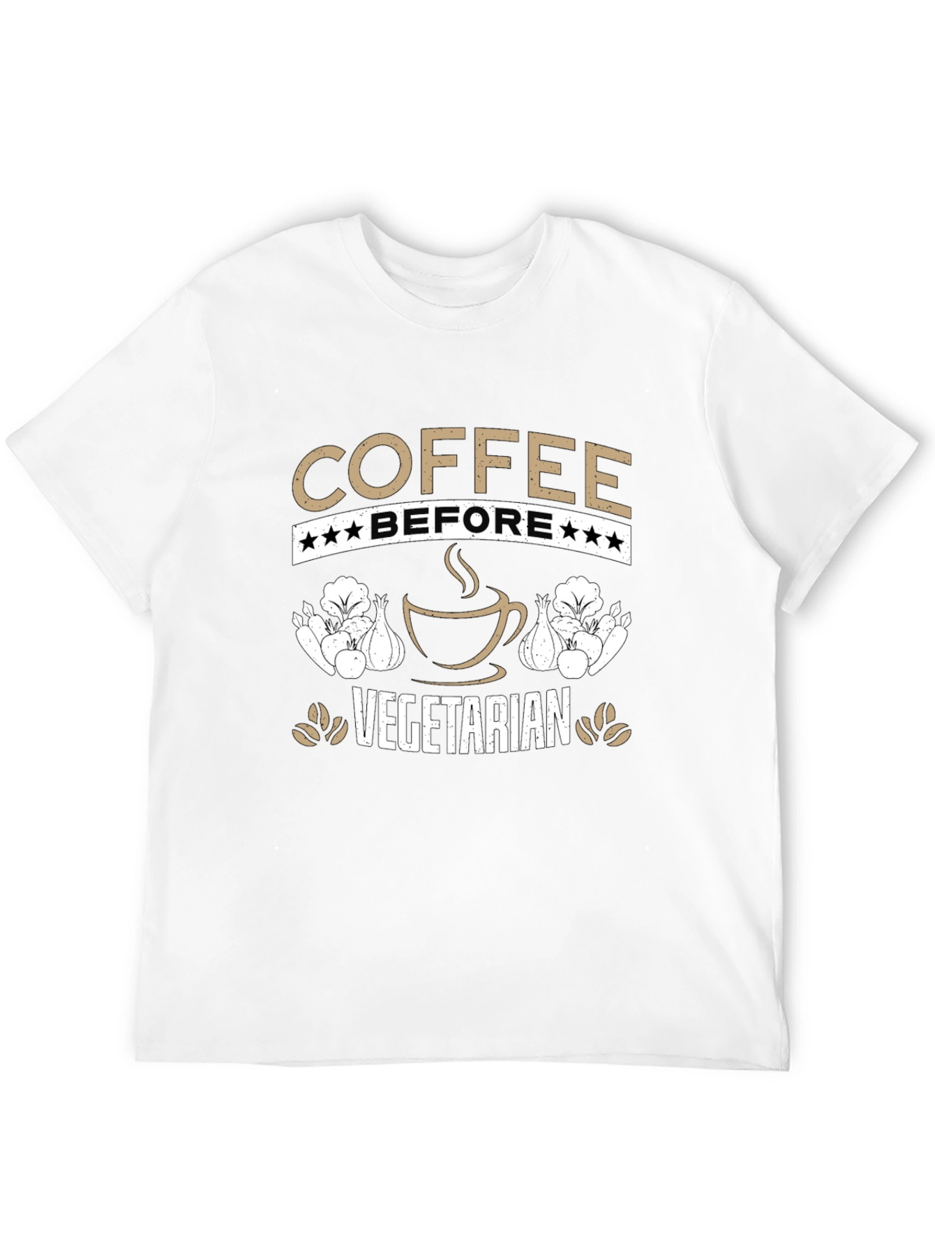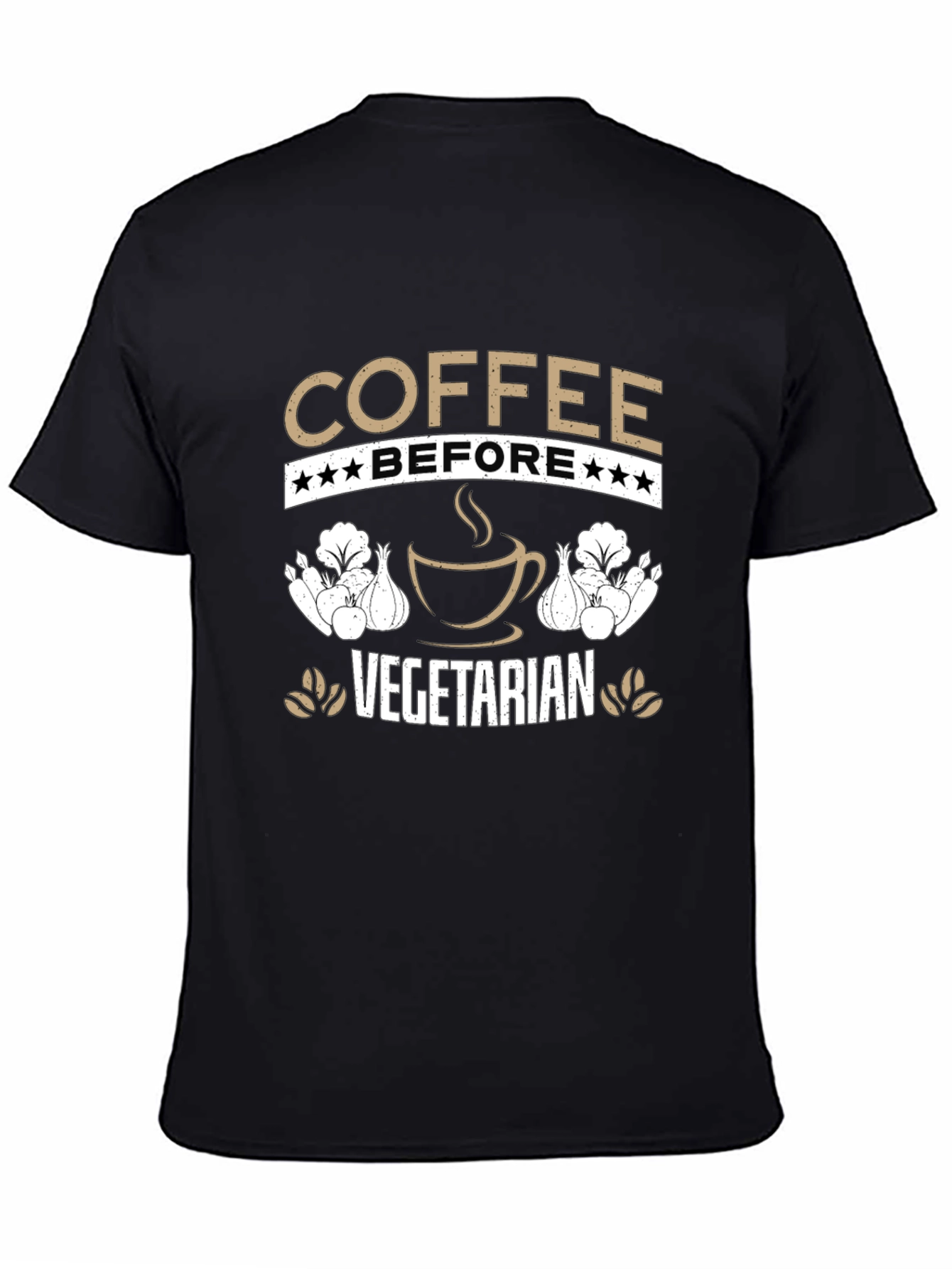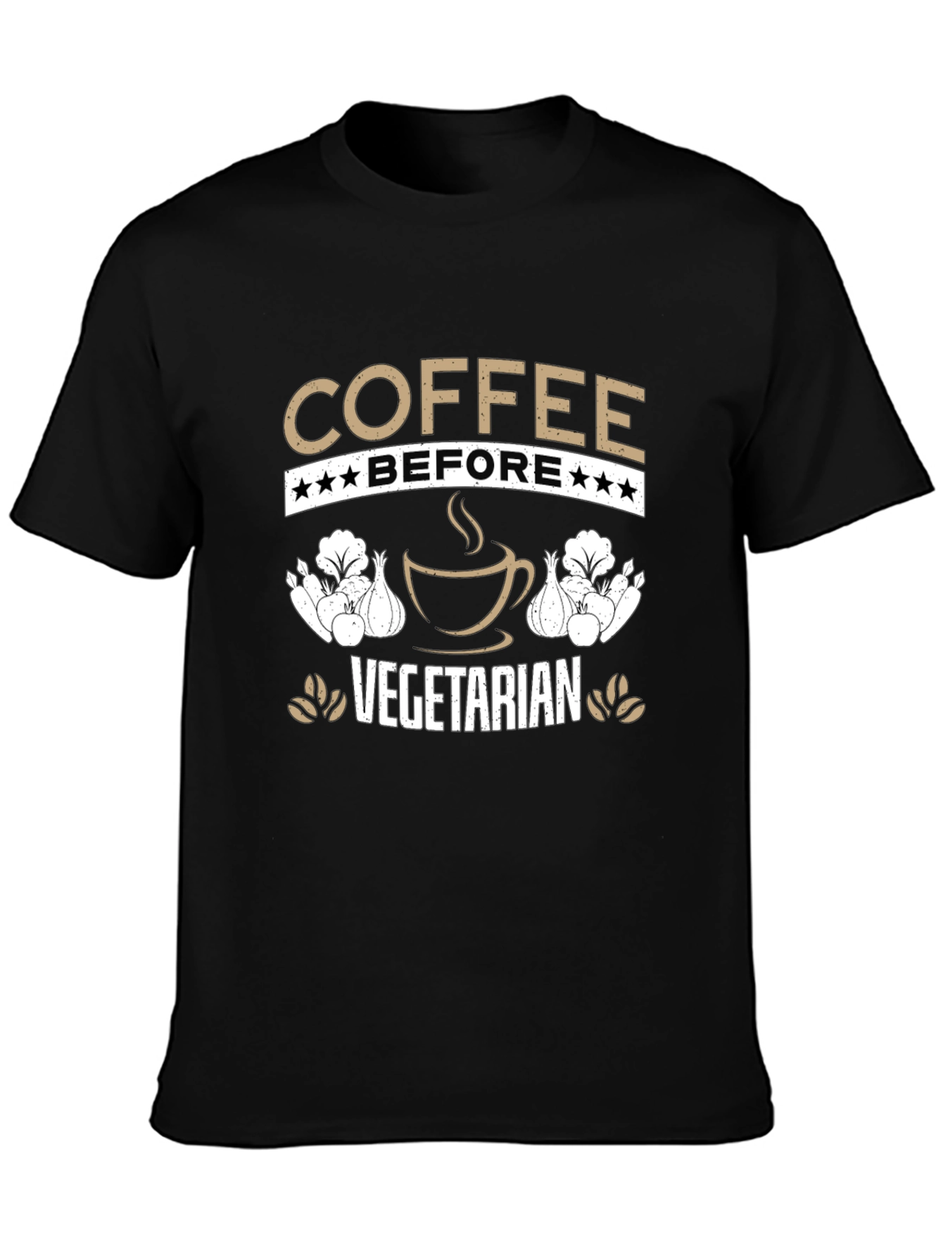 Esta camiseta negra presenta un diseño ingenioso para los amantes del café y aquellos con inclinaciones vegetarianas. El texto "COFFEE BEFORE VEGETARIAN" está prominentemente mostrado en letras de color tostado, con estrellas que adornan la palabra "BEFORE". Una imagen estilizada de una taza de café humeante añade un toque visual atractivo. A ambos lados de la taza de café, se ven ilustraciones de verduras, posiblemente cebollas y lechugas, que refuerzan el tema vegetariano. Perfecta para uso casual, esta camiseta permite expresar tu amor por el café y tu estilo de vida con humor y estilo. Ideal para usar en cafeterías, reuniones informales o simplemente para un día relajado.