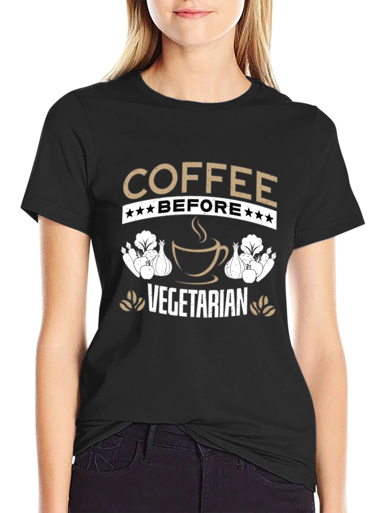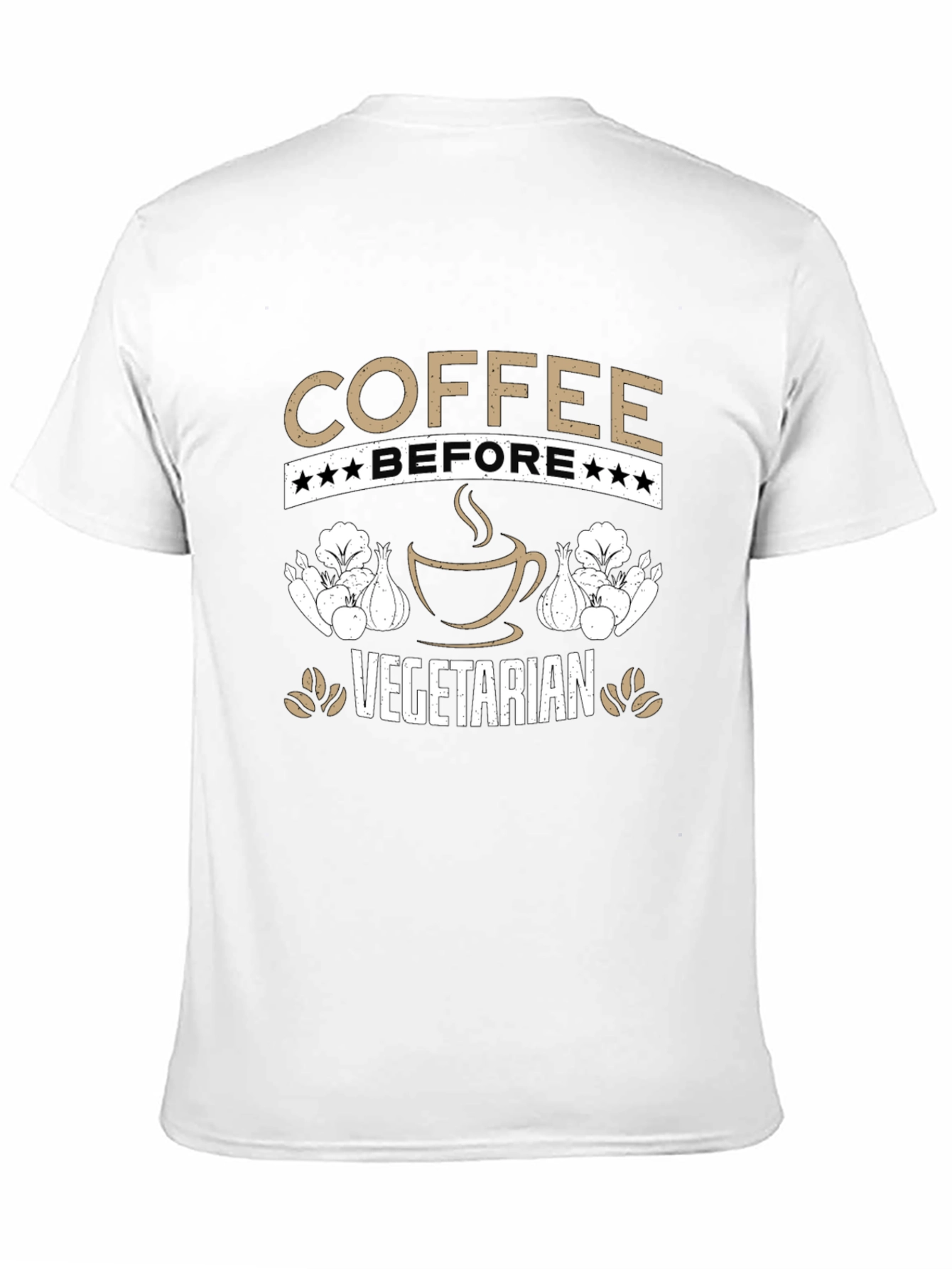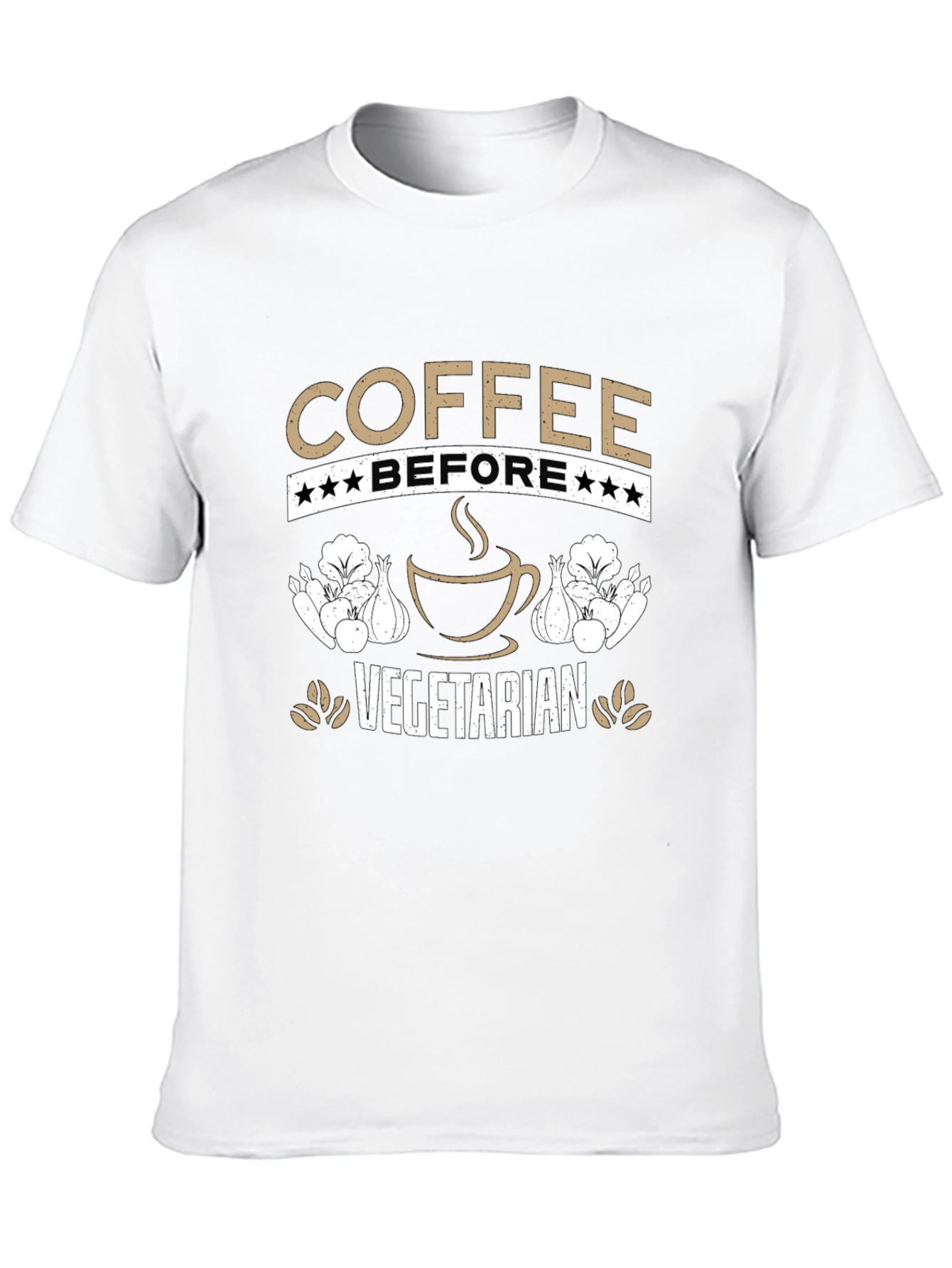 Esta camiseta negra presenta un diseño ingenioso para los amantes del café y aquellos con inclinaciones vegetarianas. El texto "COFFEE BEFORE VEGETARIAN" está prominentemente mostrado en letras de color tostado, con estrellas que adornan la palabra "BEFORE". Una imagen estilizada de una taza de café humeante añade un toque visual atractivo. A ambos lados de la taza de café, se ven ilustraciones de verduras, posiblemente cebollas y lechugas, que refuerzan el tema vegetariano. Perfecta para uso casual, esta camiseta permite expresar tu amor por el café y tu estilo de vida con humor y estilo. Ideal para usar en cafeterías, reuniones informales o simplemente para un día relajado.