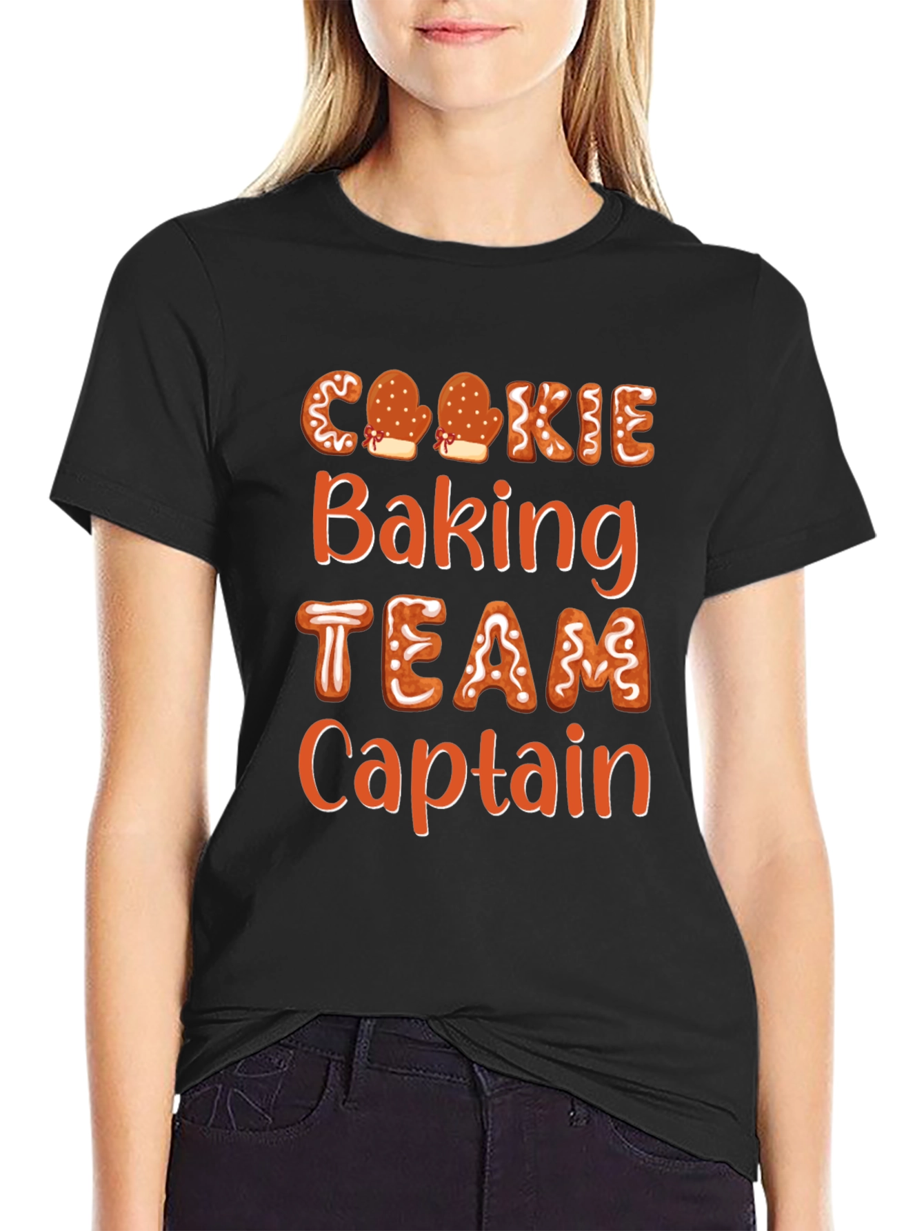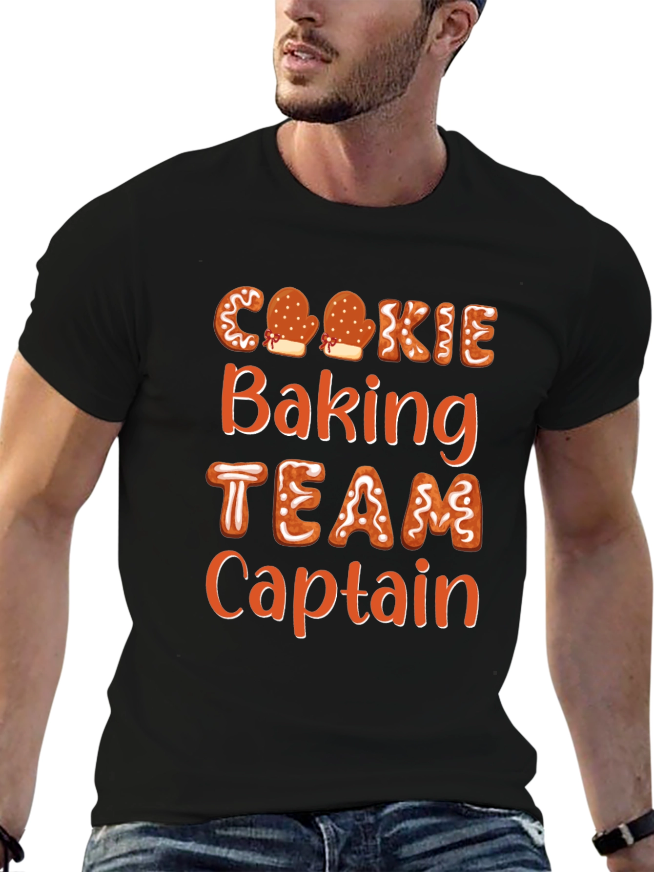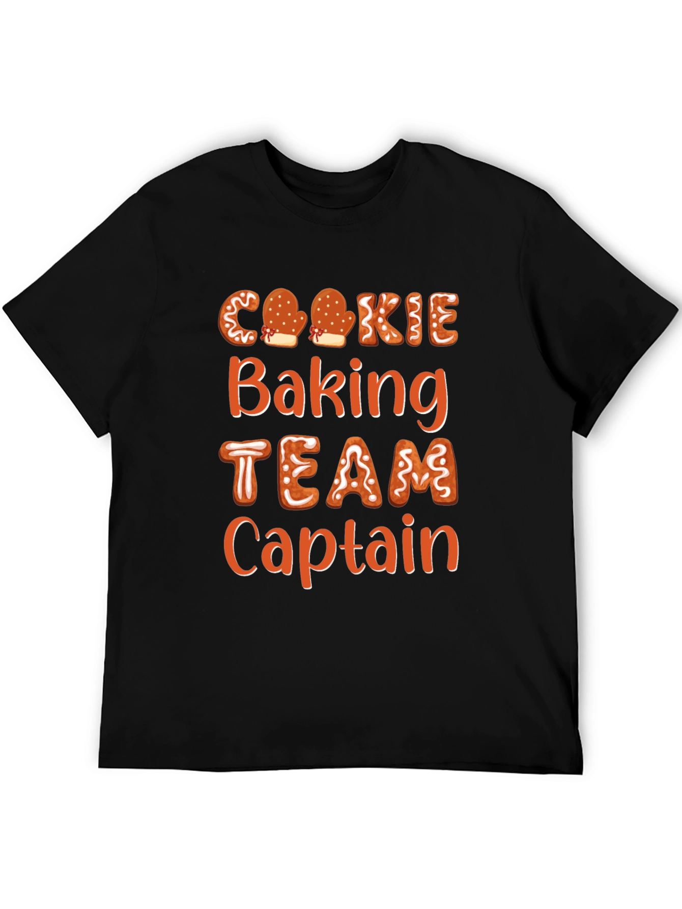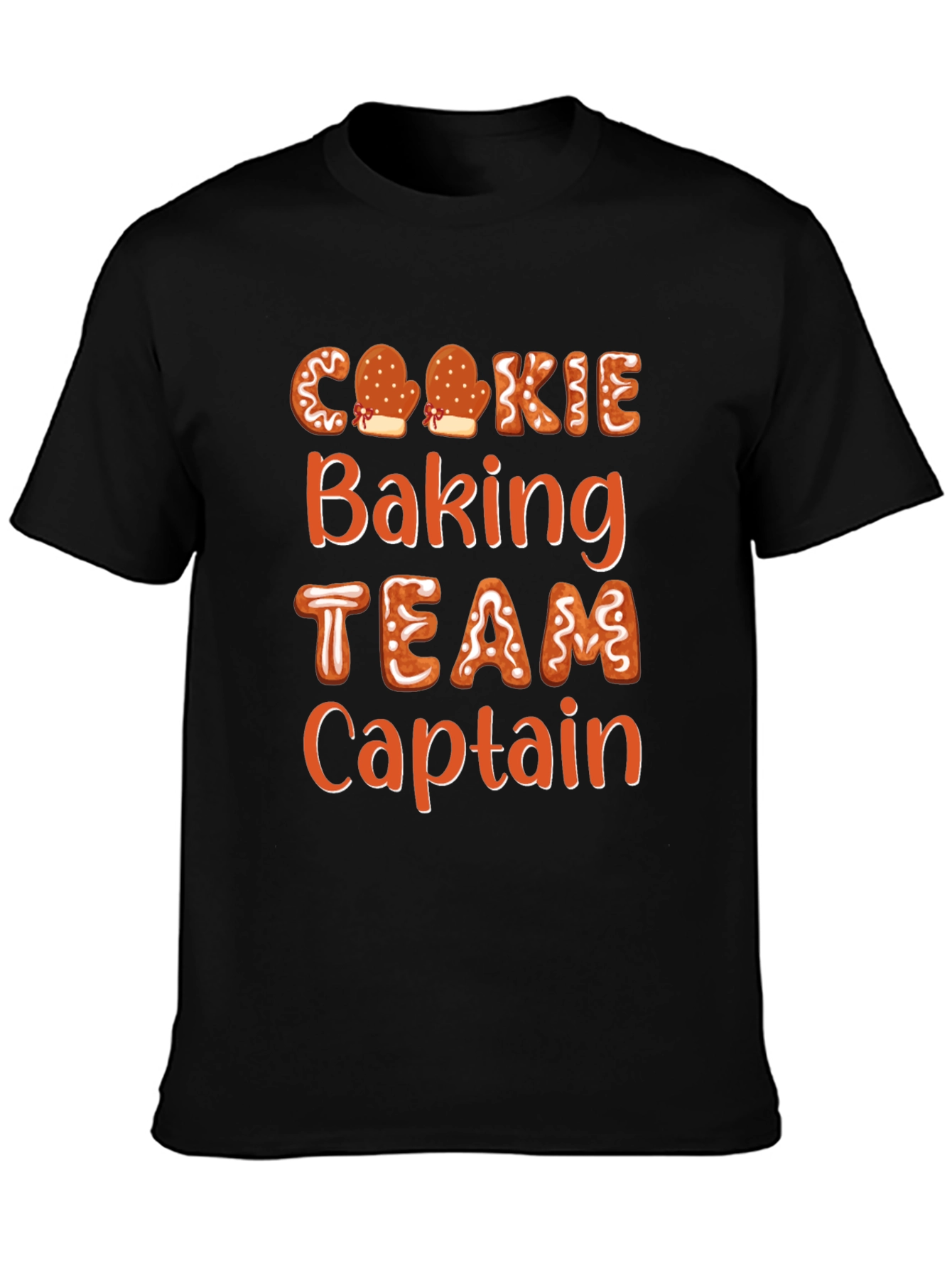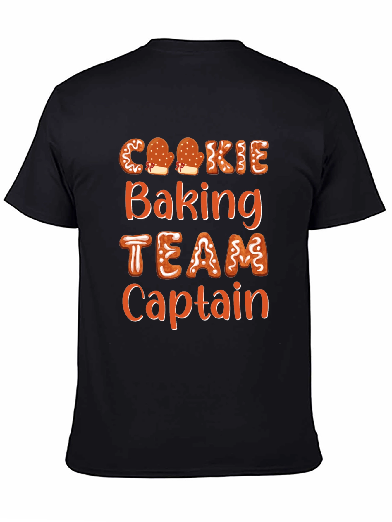 Celebra la temporada navideña con esta divertida camiseta negra. Presenta un diseño de letras con motivos de galletas de jengibre que dice 'Cookie Baking TEAM Captain'. Perfecta para los amantes de la repostería y para llevar en reuniones familiares, fiestas de Navidad o mientras horneas deliciosas galletas. La camiseta es de manga corta y corte estándar, ideal para lucir un estilo casual y festivo al mismo tiempo. ¡Demuestra tu espíritu navideño y tu amor por la repostería con esta prenda original y atractiva! Ideal para regalar a los capitanes del equipo de horneado.