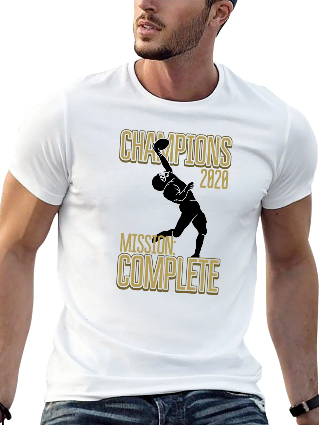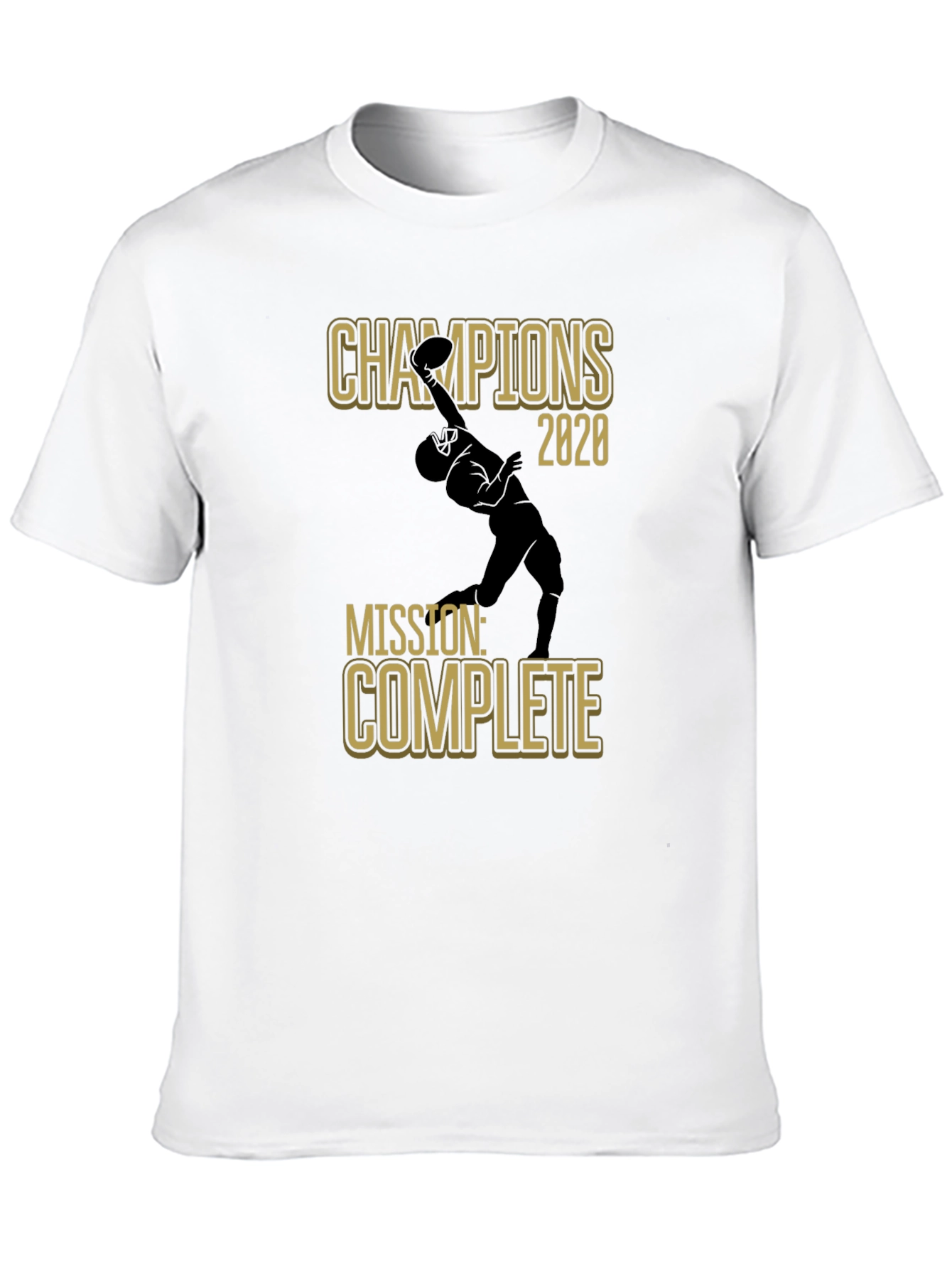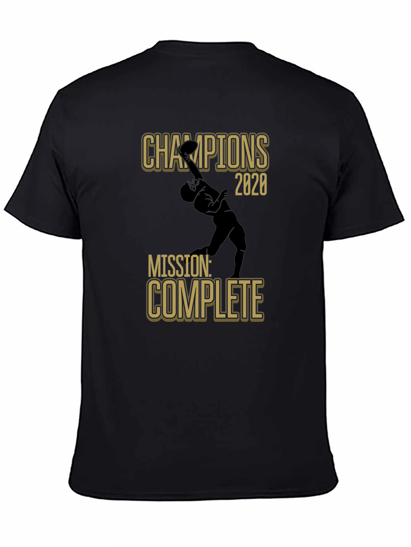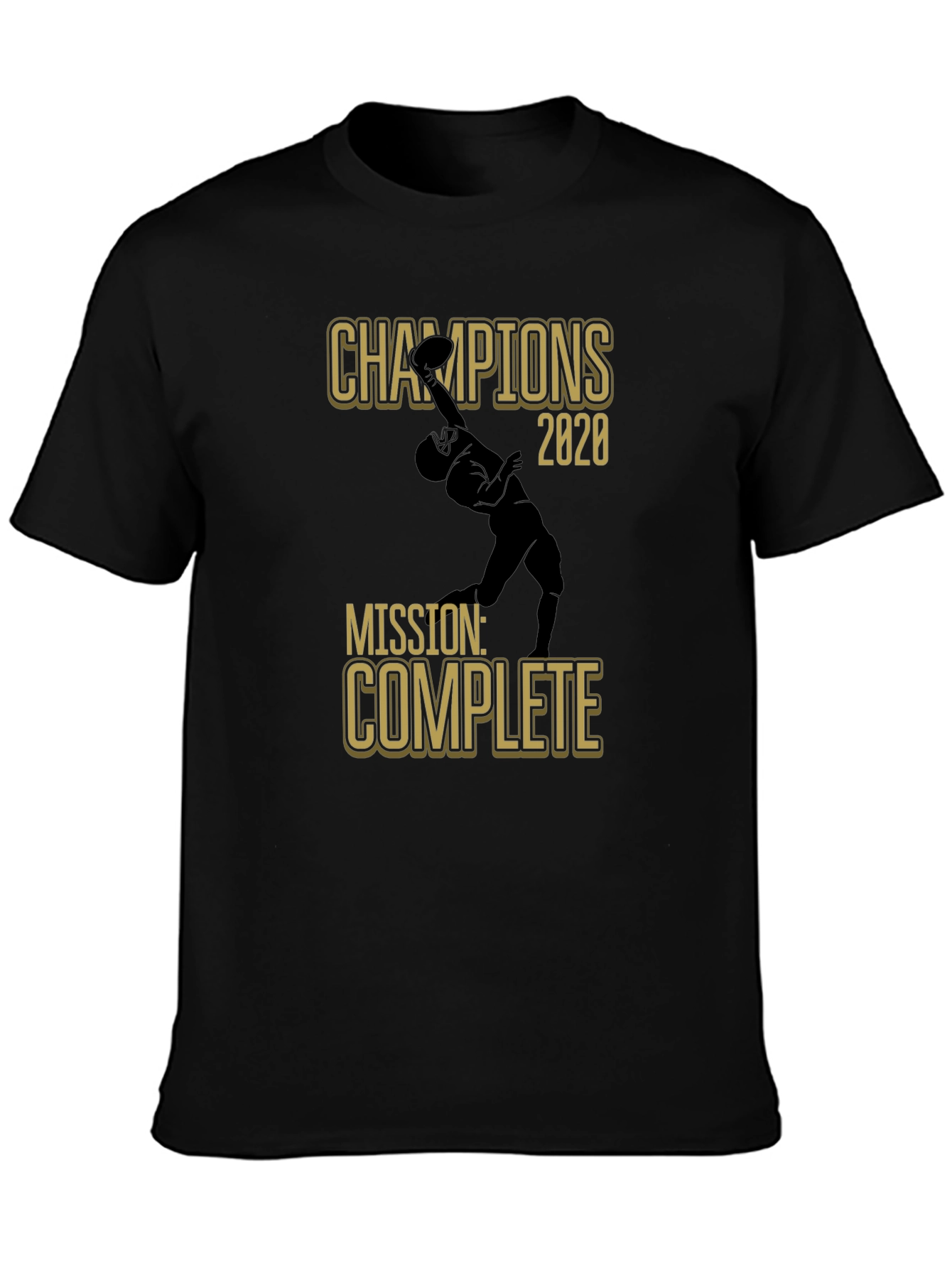 ¡Celebra la victoria con esta camiseta de campeones! Esta camiseta negra presenta un diseño llamativo con la inscripción "Champions 2020" y "Mission Complete" en un elegante color dorado. Una silueta de jugador de fútbol americano añade un toque deportivo y dinámico. Perfecta para mostrar tu orgullo y pasión por el equipo ganador. Su tejido suave y cómodo la hace ideal para usar a diario, ya sea en el estadio, en casa o con amigos. ¡Demuestra que eres parte del equipo campeón con esta prenda única!