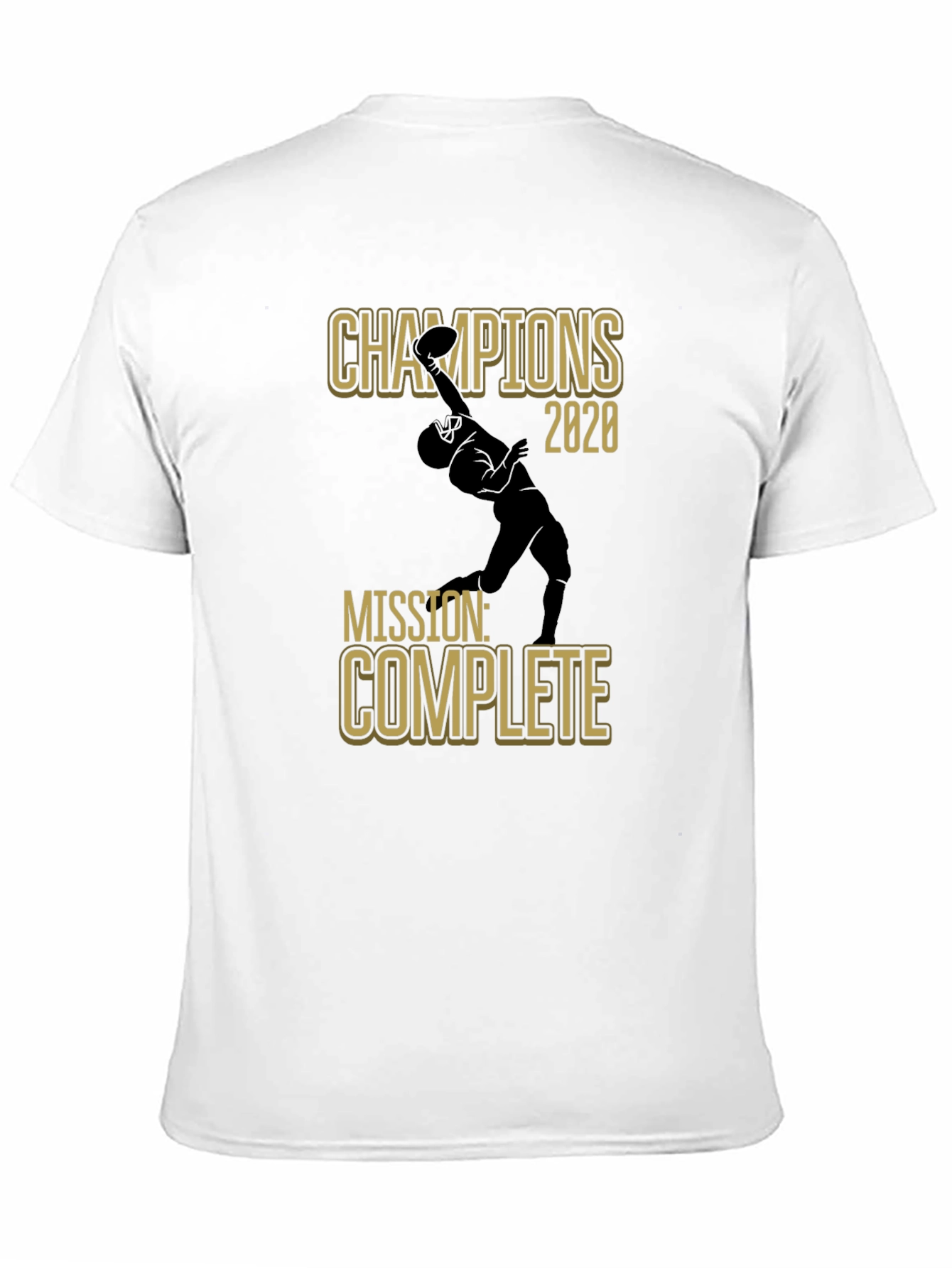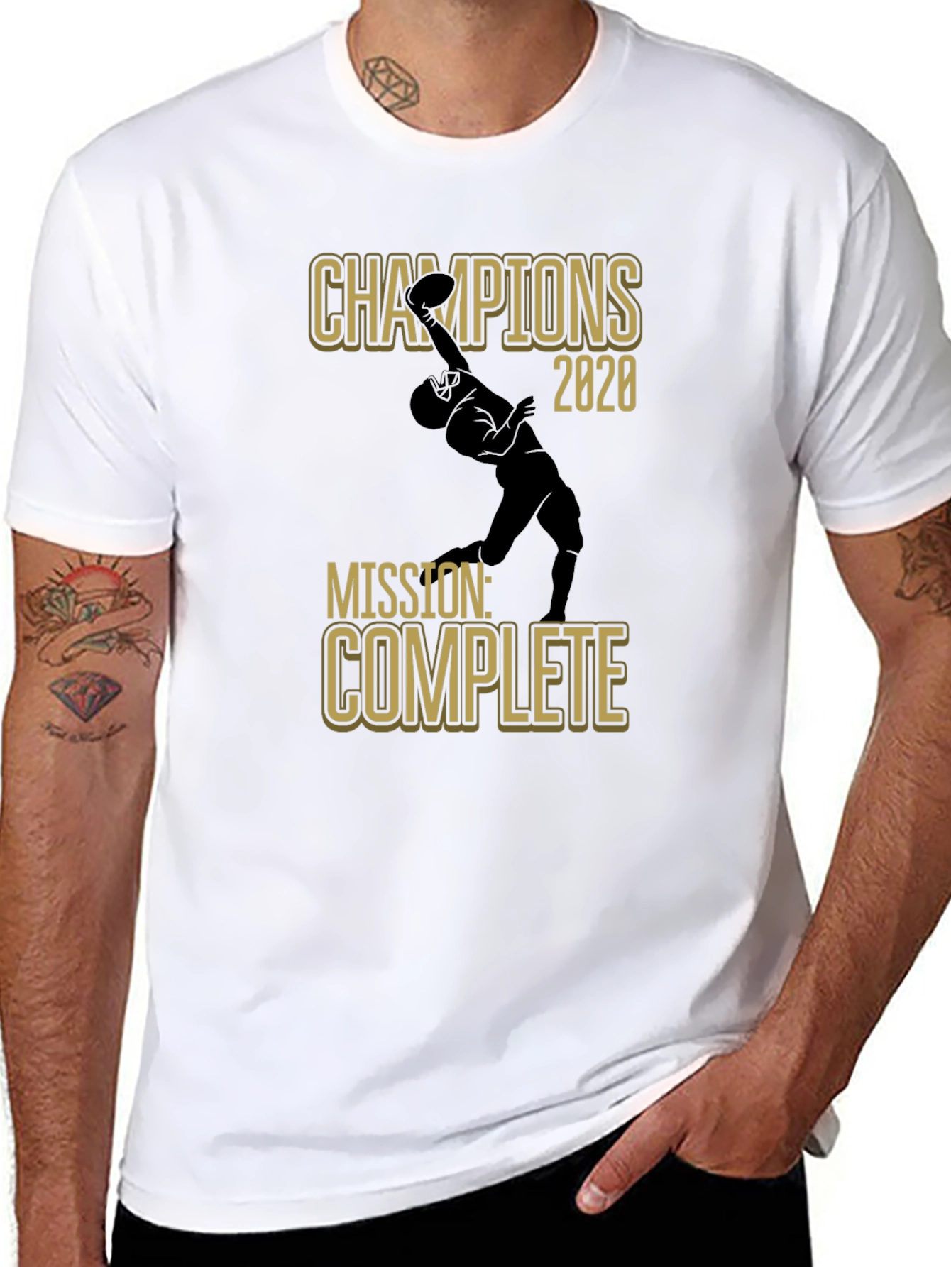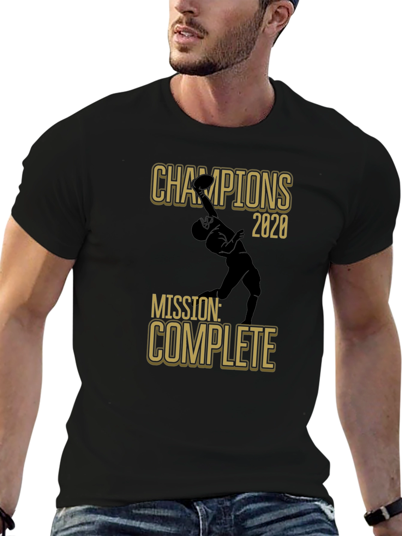 ¡Celebra la victoria con esta camiseta de campeones! Esta camiseta negra presenta un diseño llamativo con la inscripción "Champions 2020" y "Mission Complete" en un elegante color dorado. Una silueta de jugador de fútbol americano añade un toque deportivo y dinámico. Perfecta para mostrar tu orgullo y pasión por el equipo ganador. Su tejido suave y cómodo la hace ideal para usar a diario, ya sea en el estadio, en casa o con amigos. ¡Demuestra que eres parte del equipo campeón con esta prenda única!