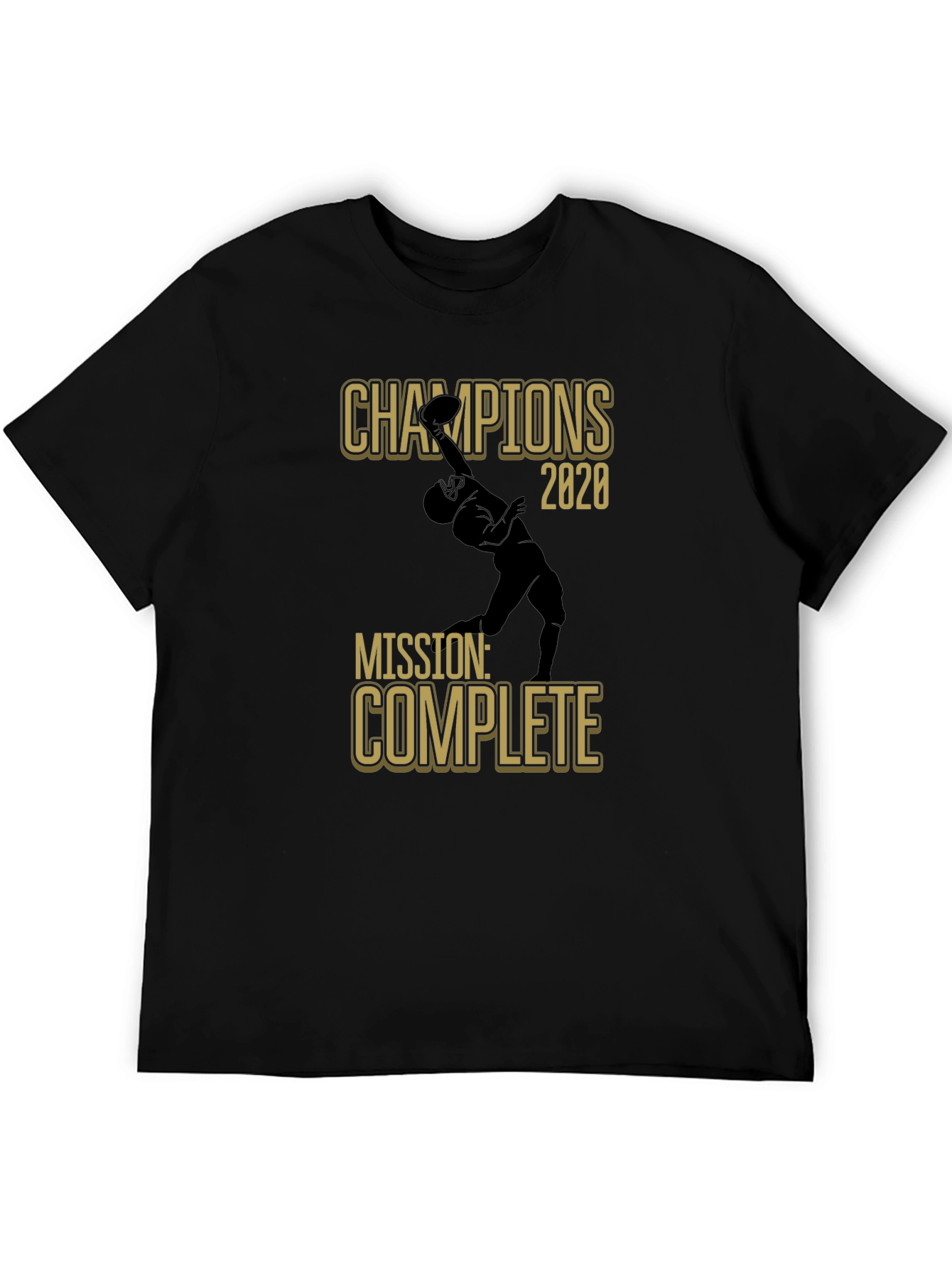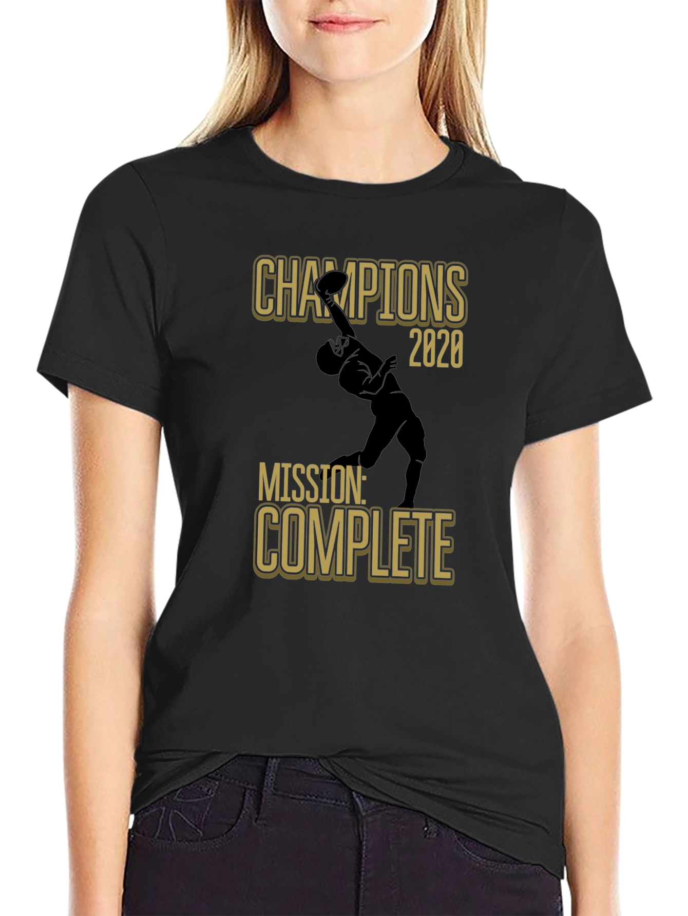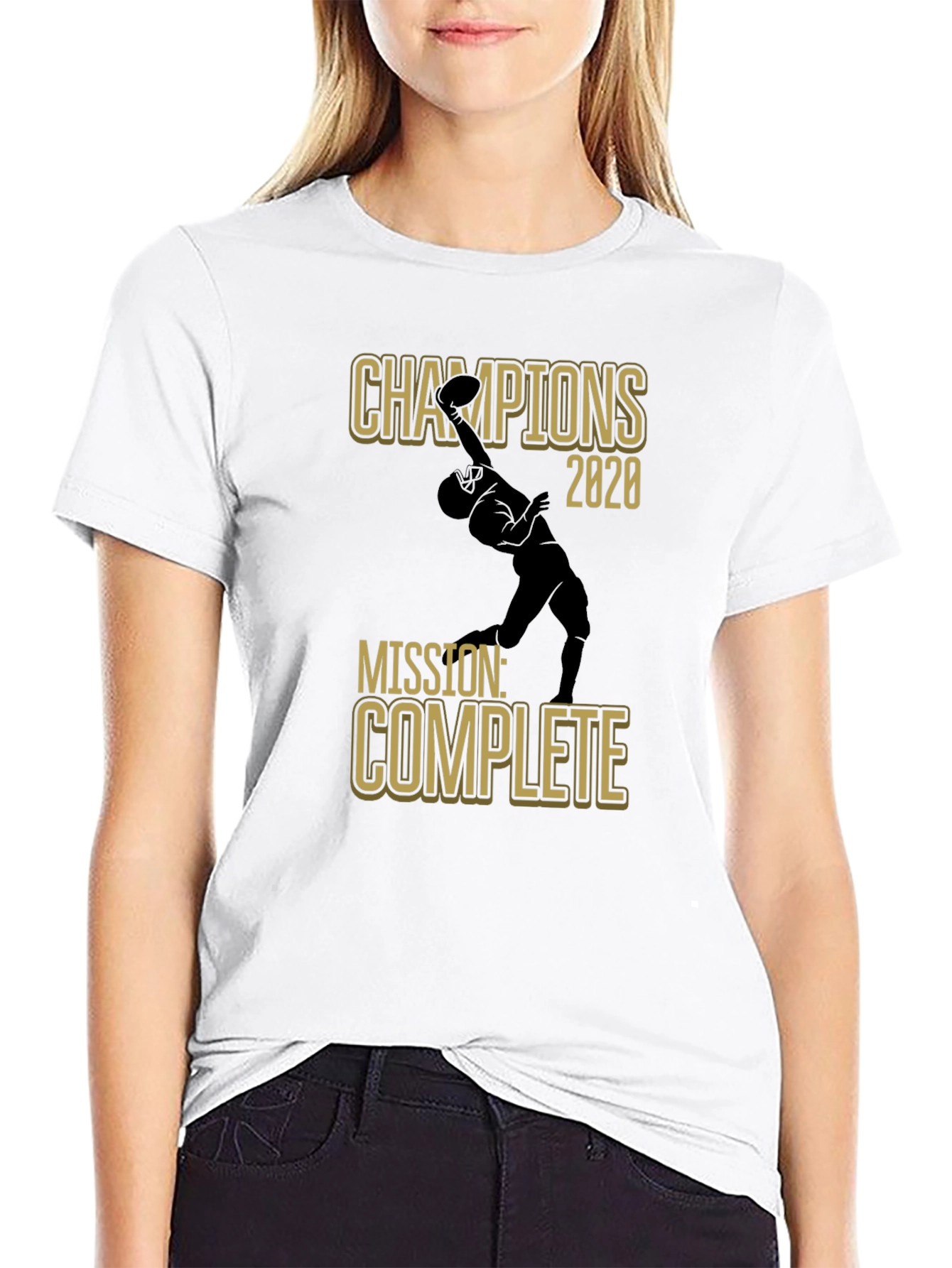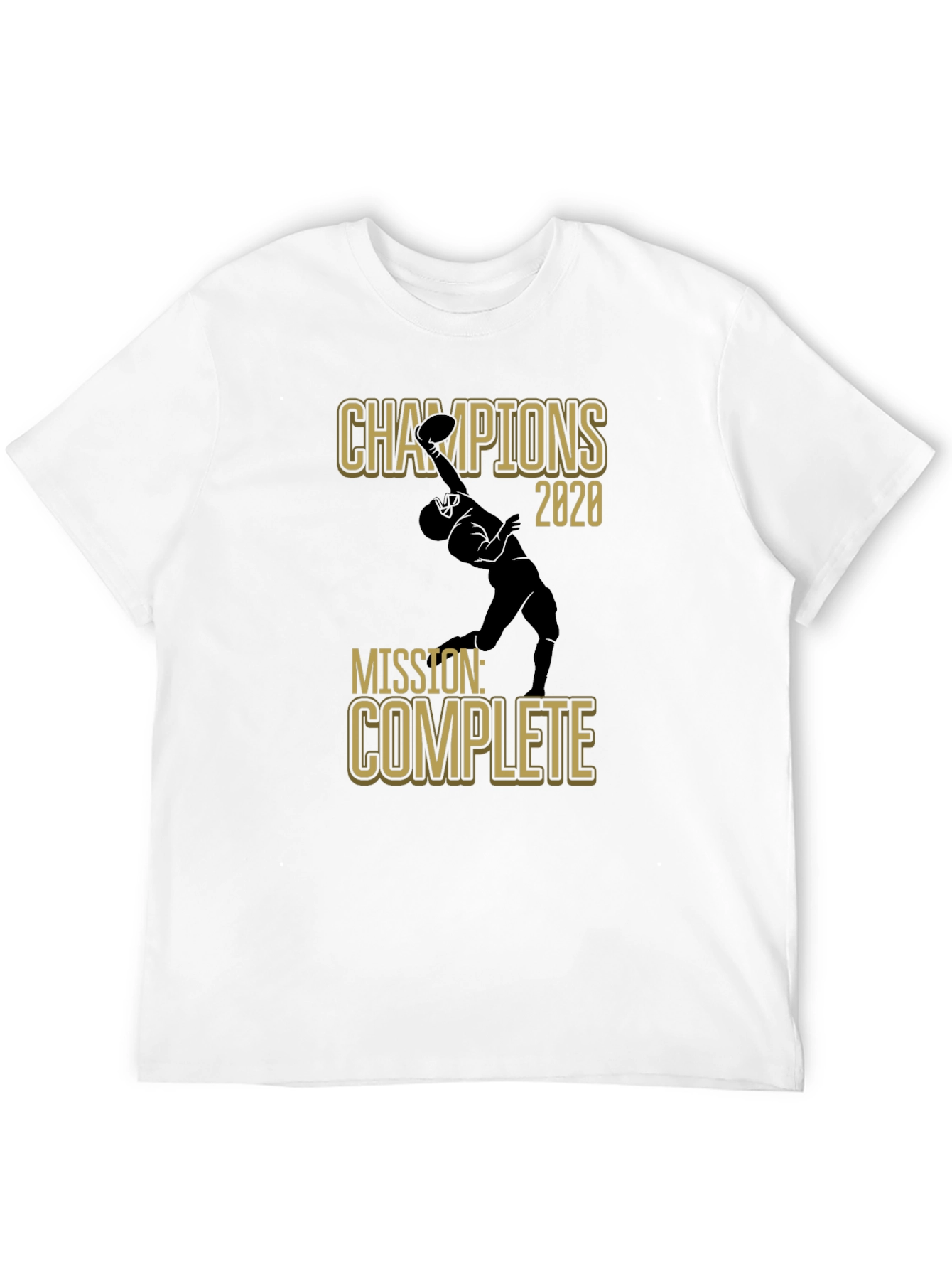 ¡Celebra la victoria con esta camiseta de campeones! Esta camiseta negra presenta un diseño llamativo con la inscripción "Champions 2020" y "Mission Complete" en un elegante color dorado. Una silueta de jugador de fútbol americano añade un toque deportivo y dinámico. Perfecta para mostrar tu orgullo y pasión por el equipo ganador. Su tejido suave y cómodo la hace ideal para usar a diario, ya sea en el estadio, en casa o con amigos. ¡Demuestra que eres parte del equipo campeón con esta prenda única!