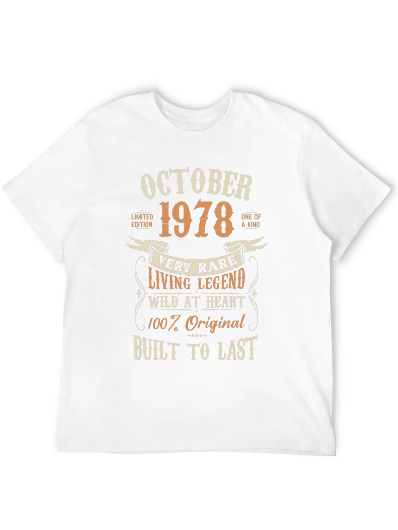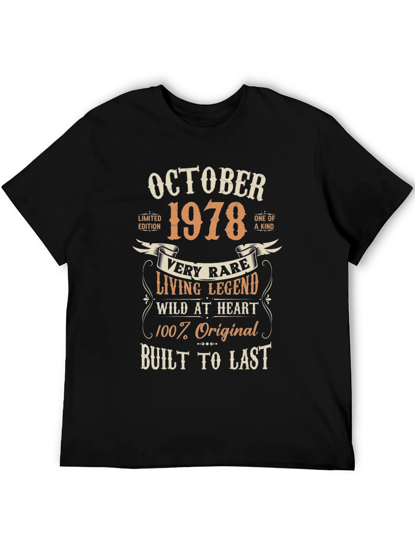 Esta camiseta negra de manga corta presenta un diseño retro y llamativo, ideal para aquellos nacidos en octubre de 1978. El texto "OCTOBER 1978" destaca en una tipografía vintage, junto con las leyendas "LIMITED EDITION", "VERY RARE", "LIVING LEGEND", "WILD AT HEART", "100% ORIGINAL" y "BUILT TO LAST". Con un estilo clásico y un toque nostálgico, esta camiseta es perfecta para celebrar un cumpleaños o simplemente para expresar tu individualidad. Su diseño único la convierte en una prenda versátil para usar en el día a día o en ocasiones especiales. Fabricada con materiales de alta calidad para asegurar su durabilidad y comodidad, esta camiseta se convertirá en una pieza esencial de tu guardarropa.