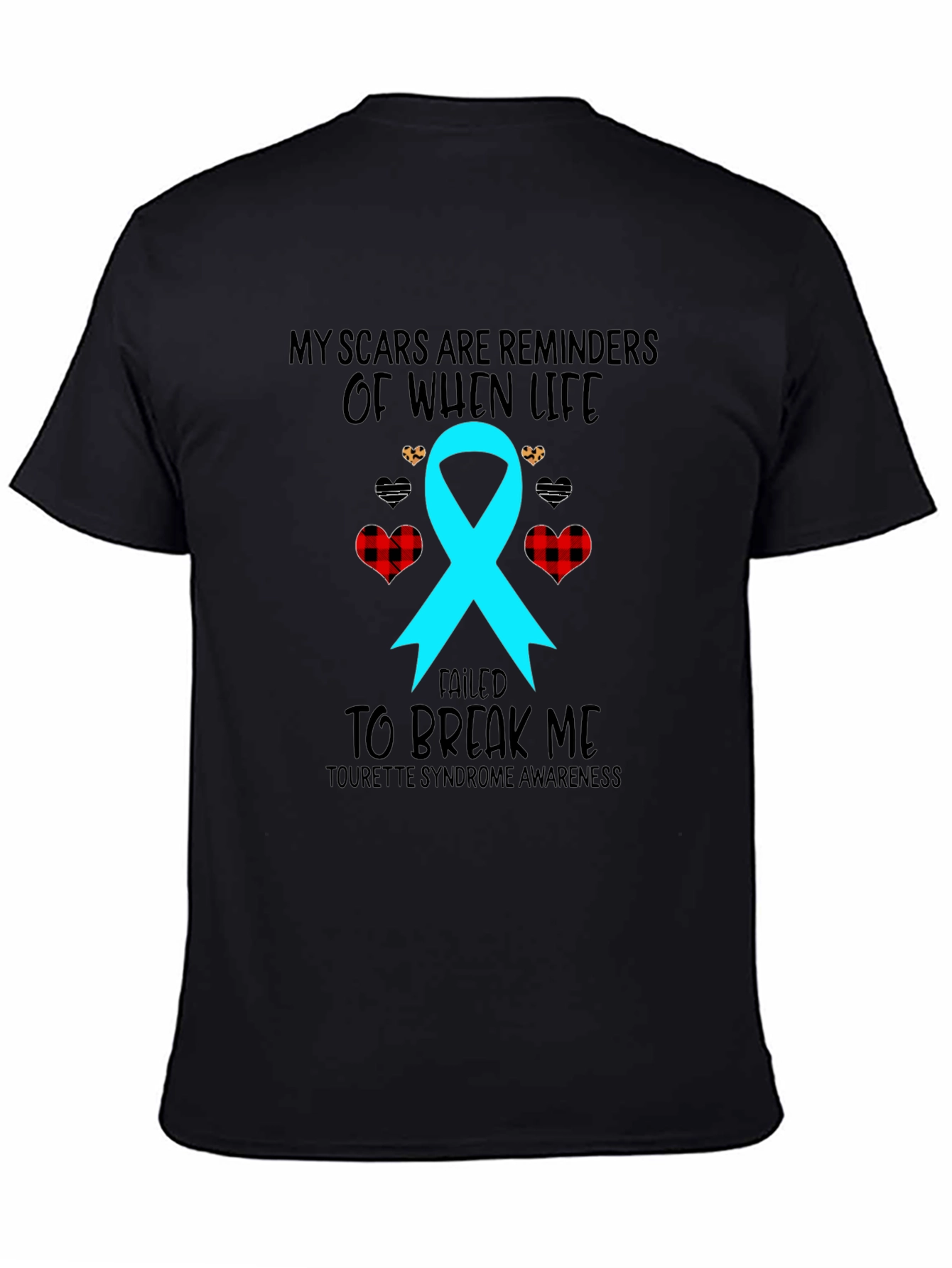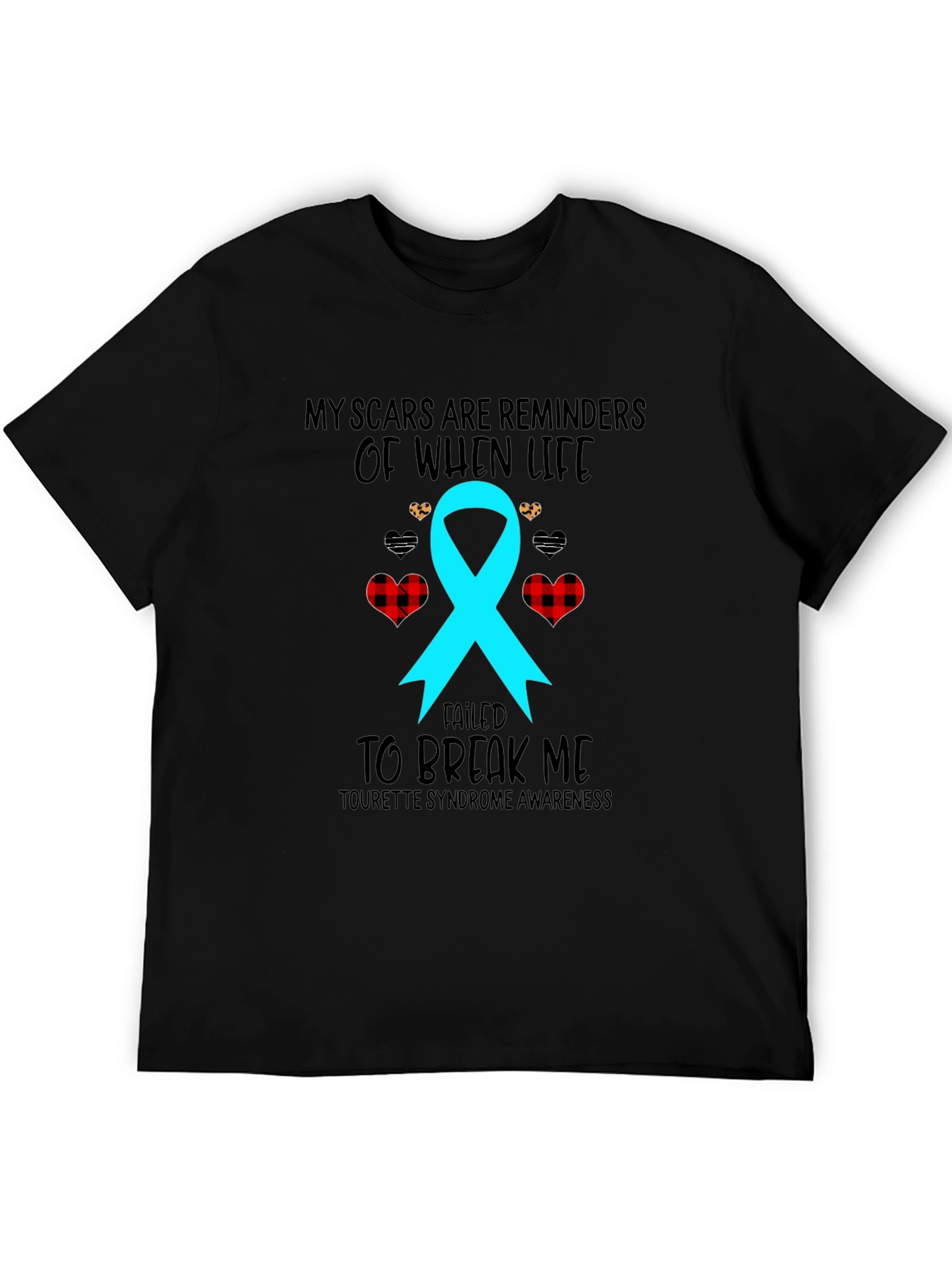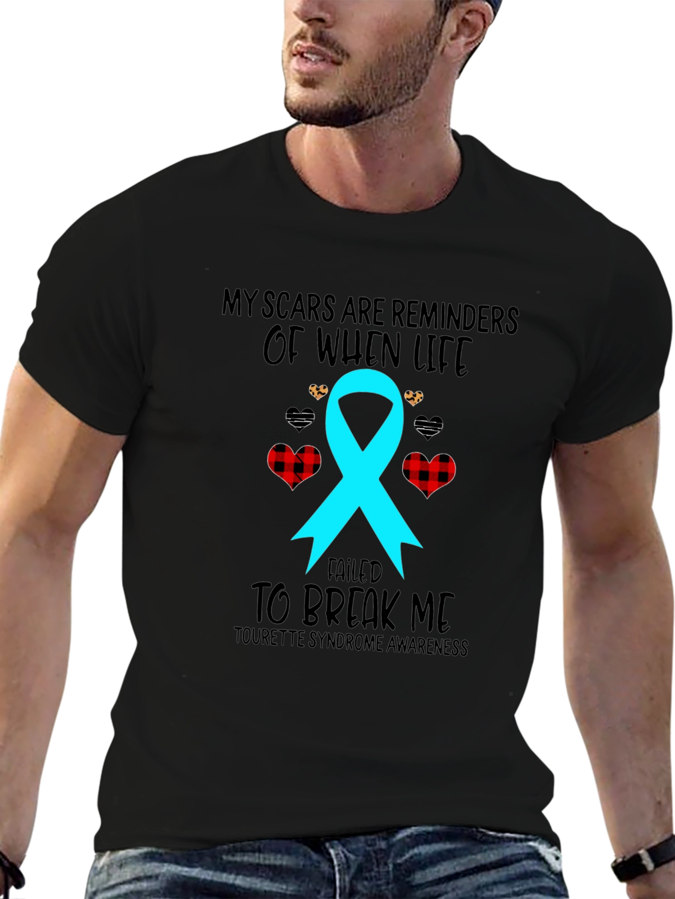 Luce esta elegante camiseta negra que muestra apoyo a la concientización del Síndrome de Tourette. El diseño presenta la frase inspiradora "Mis cicatrices son recordatorios de cuando la vida falló en quebrarme", adornada con un lazo turquesa, corazones a cuadros y detalles sutiles. Perfecta para crear conciencia o simplemente mostrar tu solidaridad. Fabricada con materiales suaves y cómodos, ideal para uso diario. Demuestra tu apoyo con esta prenda significativa y estilizada.