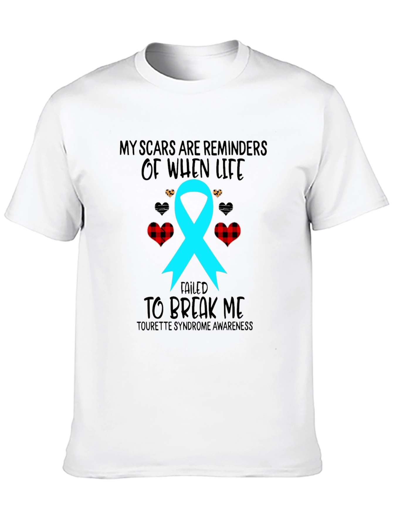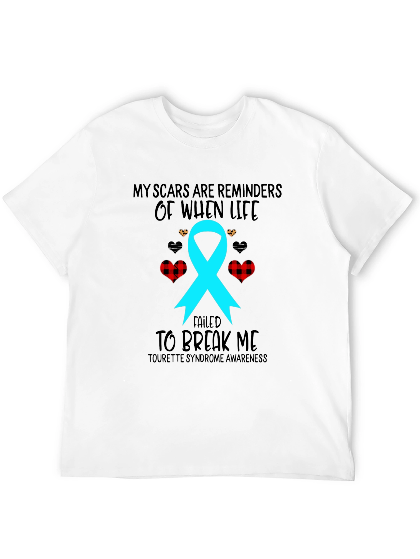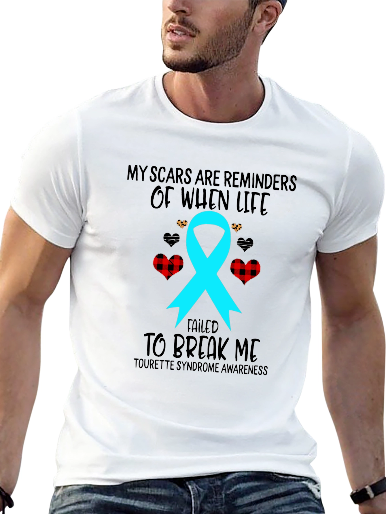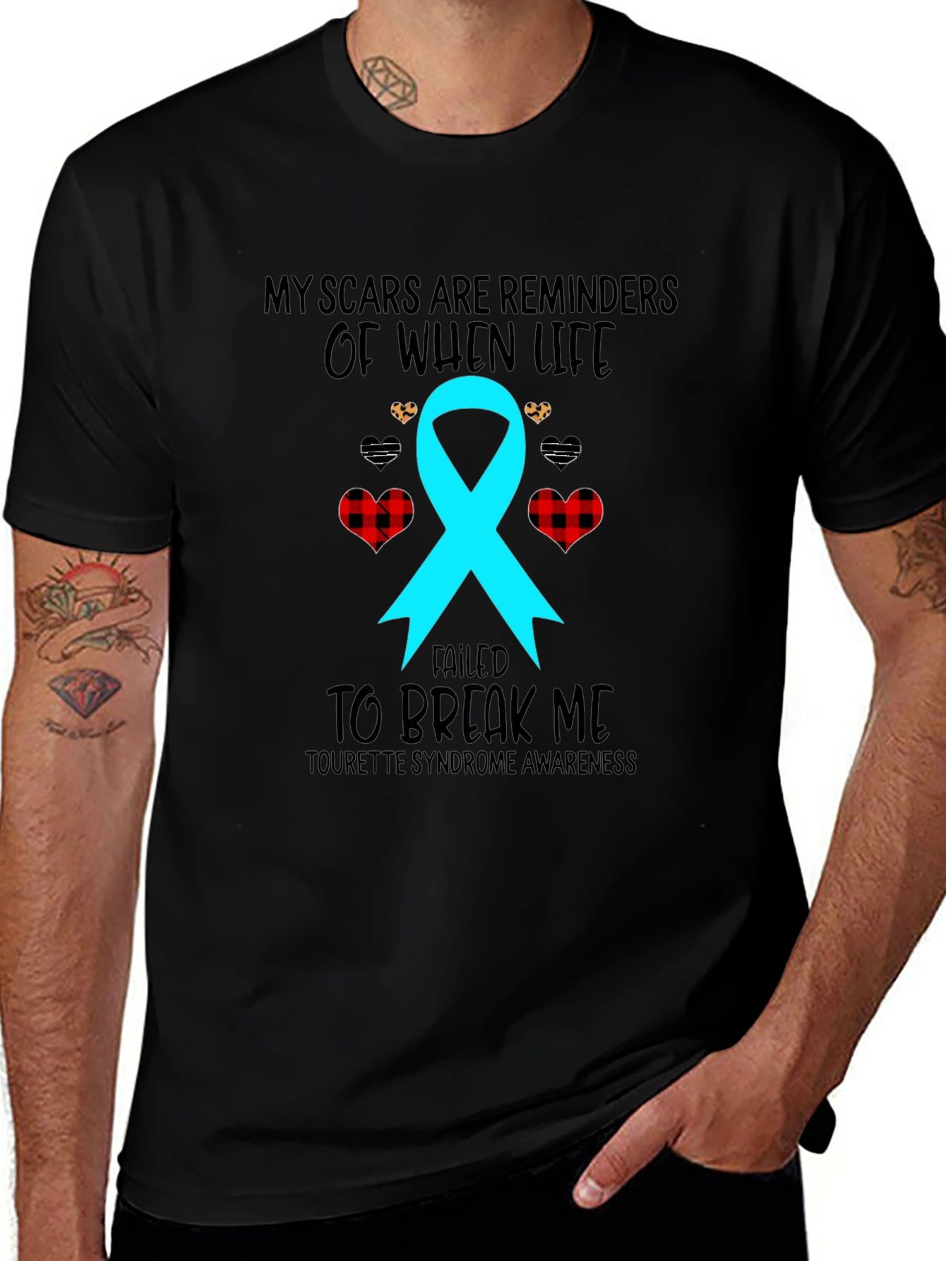 Luce esta elegante camiseta negra que muestra apoyo a la concientización del Síndrome de Tourette. El diseño presenta la frase inspiradora "Mis cicatrices son recordatorios de cuando la vida falló en quebrarme", adornada con un lazo turquesa, corazones a cuadros y detalles sutiles. Perfecta para crear conciencia o simplemente mostrar tu solidaridad. Fabricada con materiales suaves y cómodos, ideal para uso diario. Demuestra tu apoyo con esta prenda significativa y estilizada.
