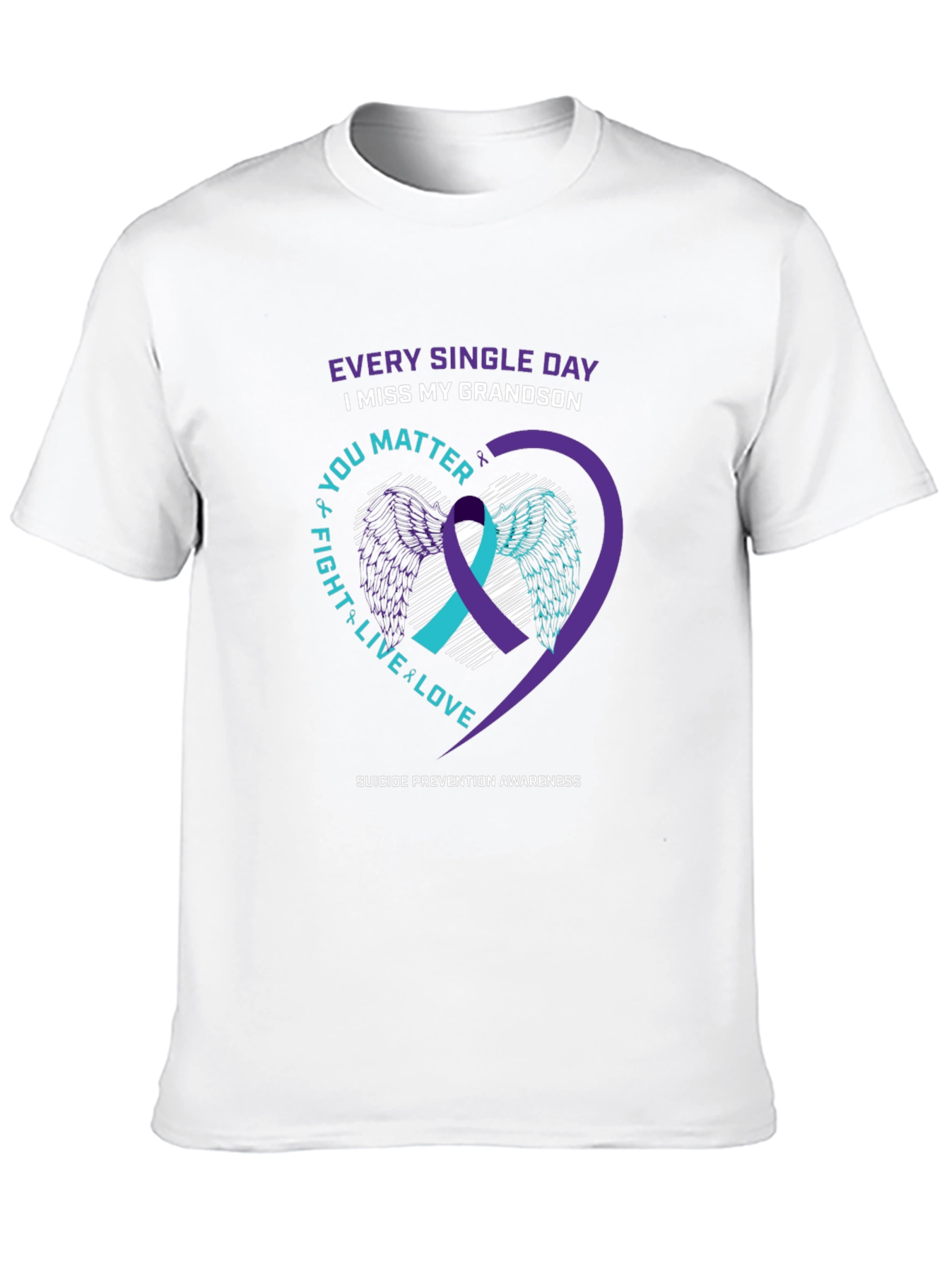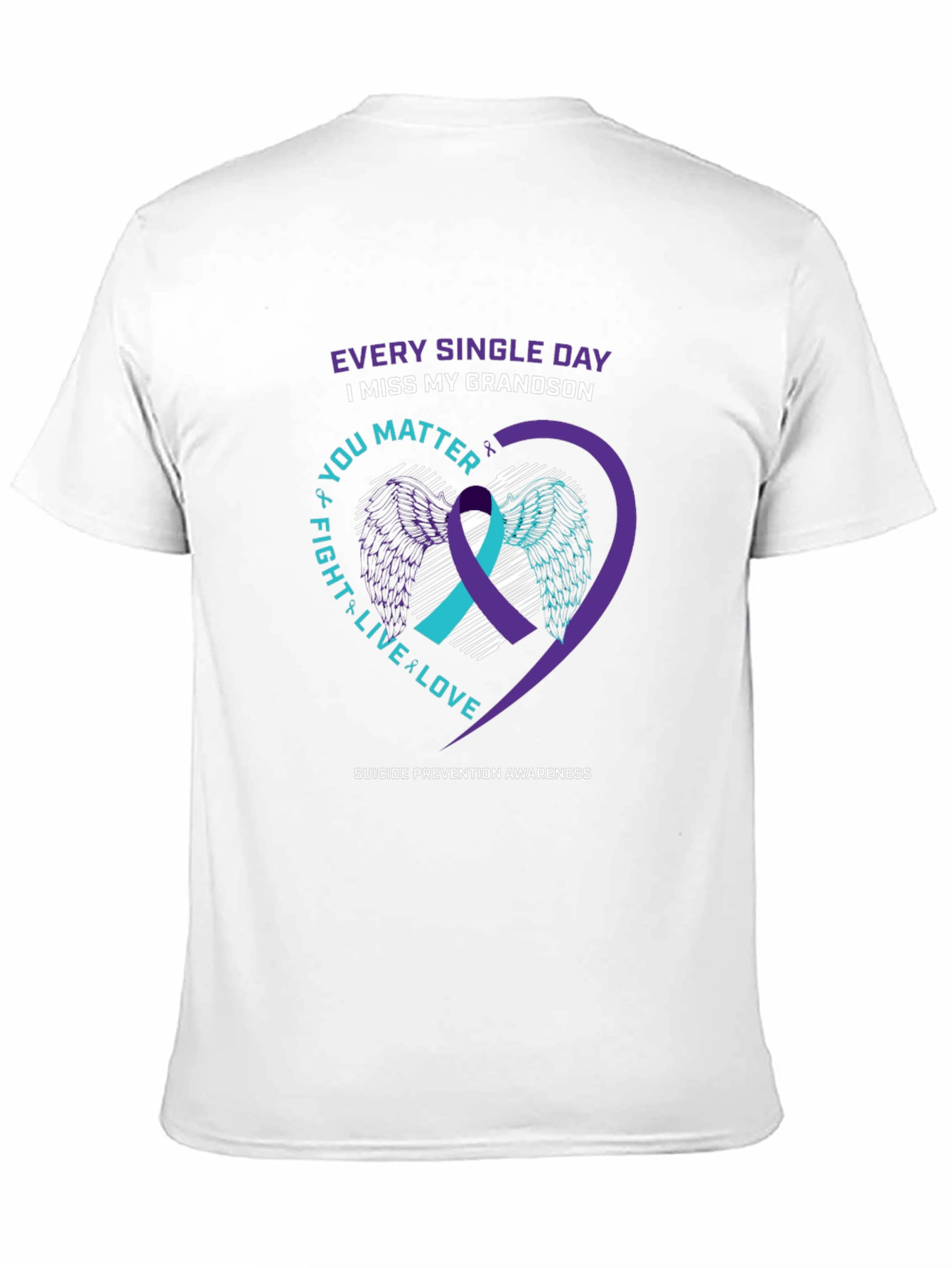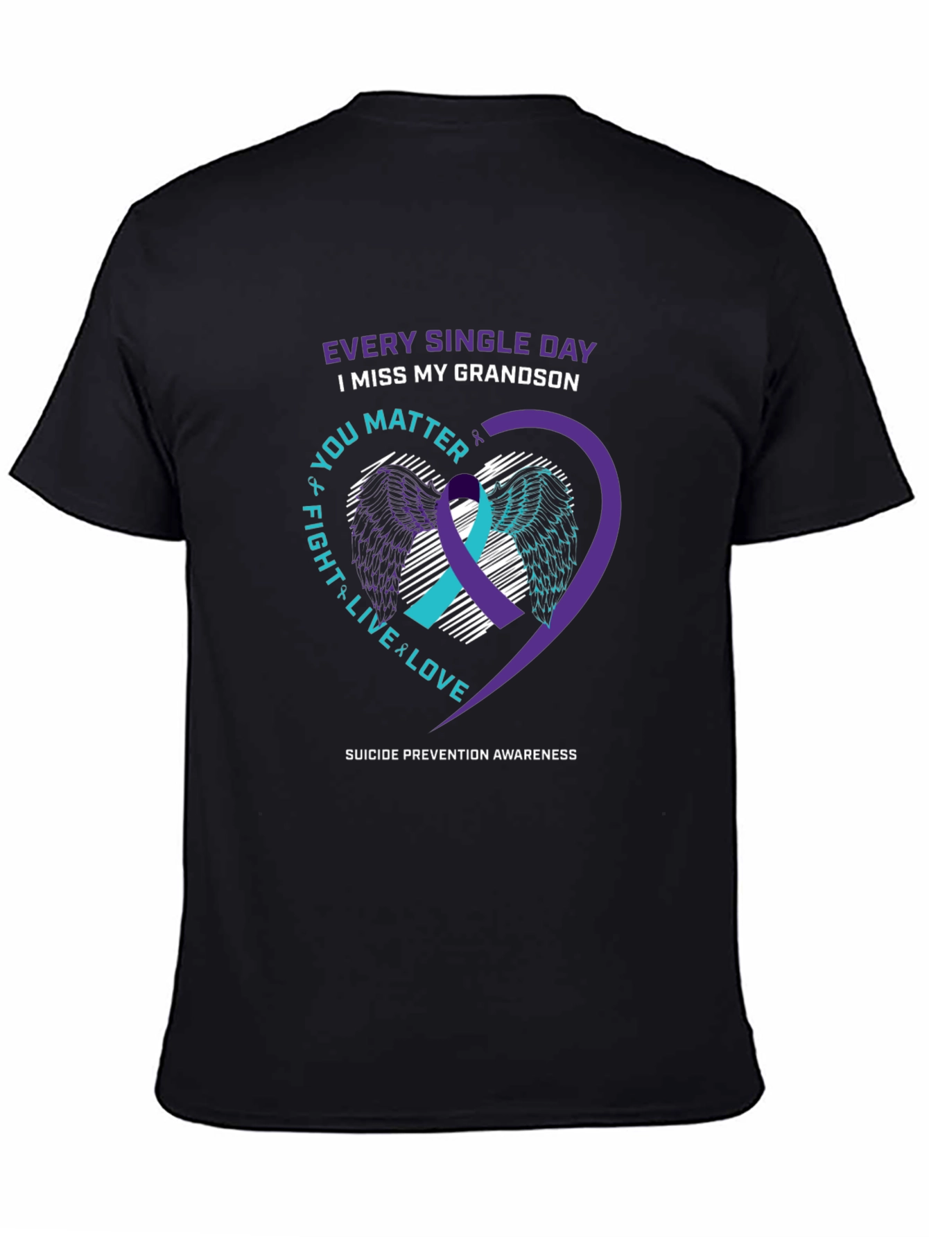 Esta camiseta negra presenta un diseño conmovedor con un mensaje de apoyo y concientización sobre la prevención del suicidio. El texto llamativo "EVERY SINGLE DAY I MISS MY GRANDSON" destaca la importancia del recuerdo y la conexión. Un diseño de corazón intrincado con alas y un lazo de color aguamarina y púrpura simboliza esperanza y apoyo. Las palabras "YOU MATTER FIGHT LIVE LOVE" refuerzan un mensaje positivo. Ideal para mostrar apoyo a la causa, participar en eventos de concientización o simplemente llevar un mensaje de esperanza y amor. Perfecta para crear conciencia sobre la prevención del suicidio.