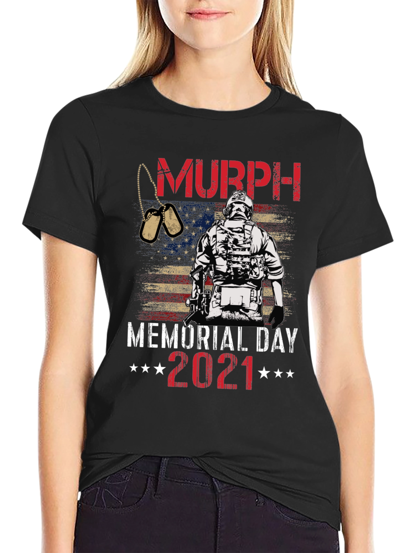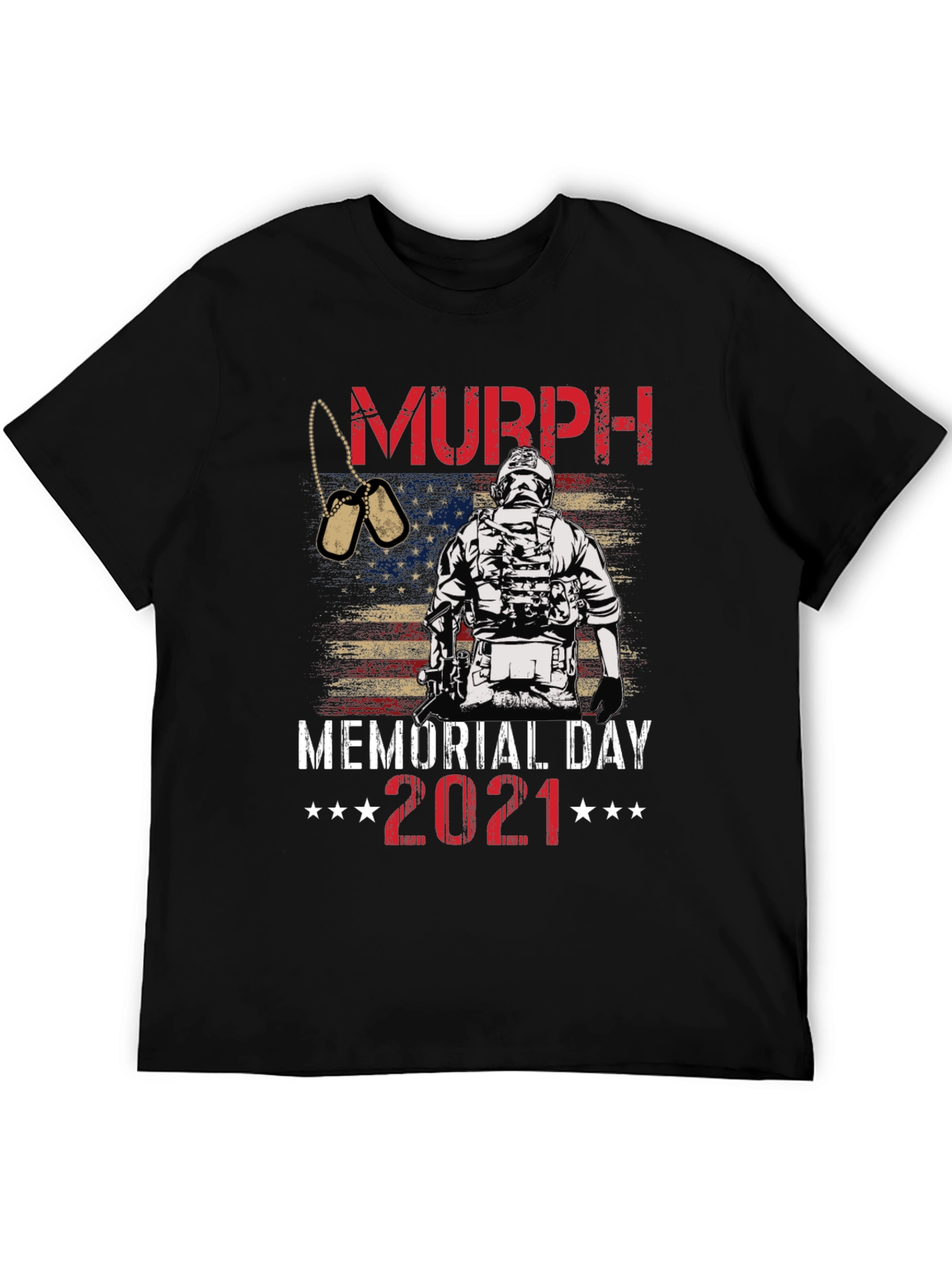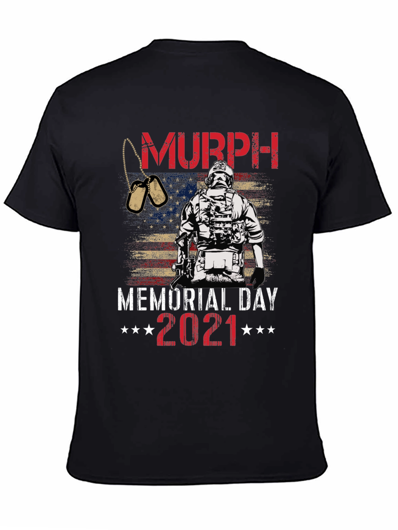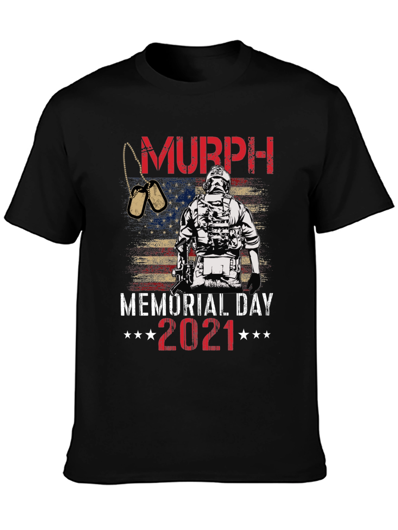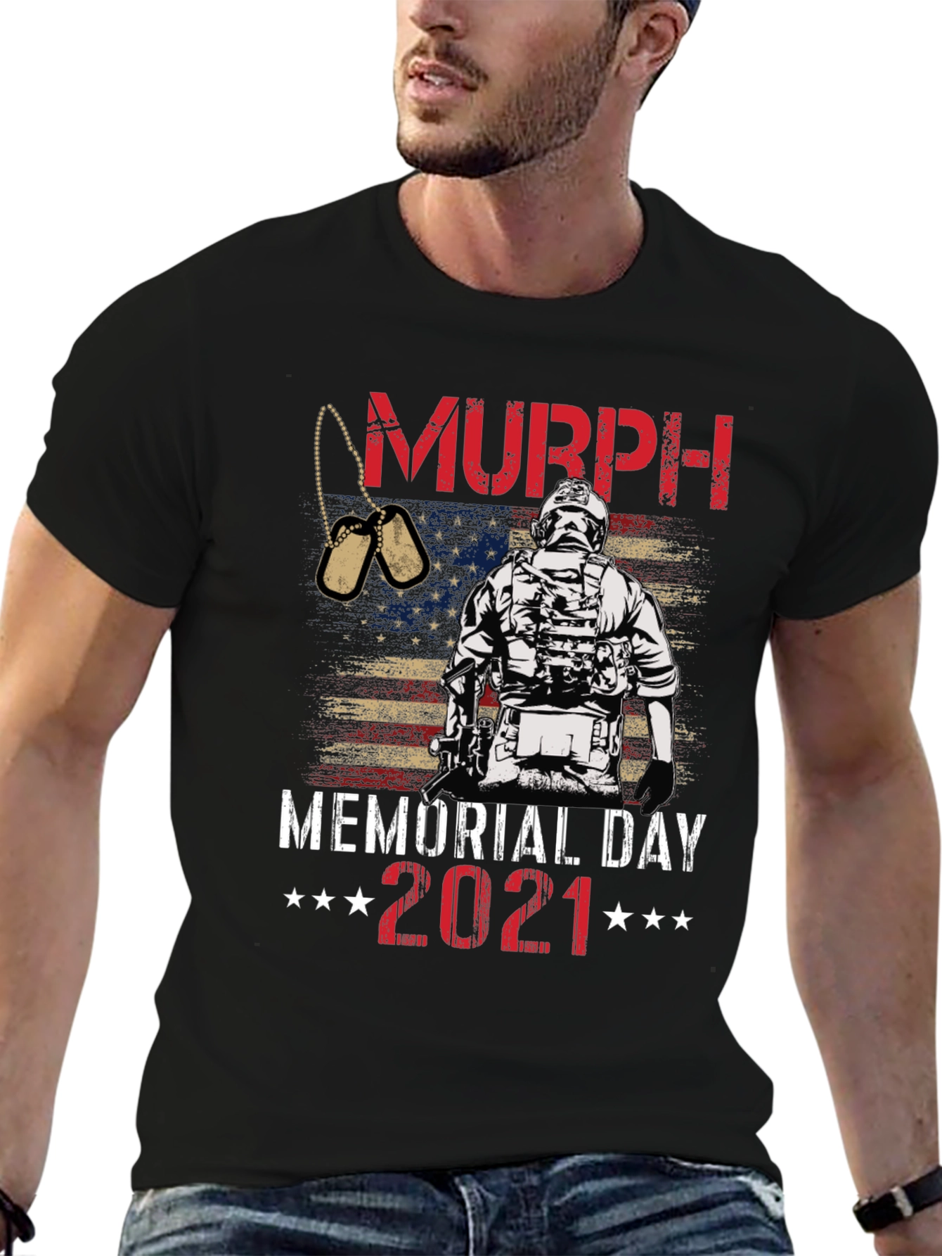 Honra a los héroes con esta camiseta conmemorativa del Memorial Day 2021. Presenta un diseño patriótico con la bandera estadounidense, la palabra "MURPH" y un soldado en el centro. Ideal para mostrar tu apoyo y recuerdo en el Día de los Caídos o cualquier día del año. Perfecta para veteranos, familiares de militares o cualquier persona que desee rendir homenaje a aquellos que dieron su vida por la libertad. Fabricada con materiales cómodos y duraderos para un uso prolongado. Demuestra tu patriotismo con esta camiseta única y significativa. ¡Un tributo perfecto para recordar y honrar!
