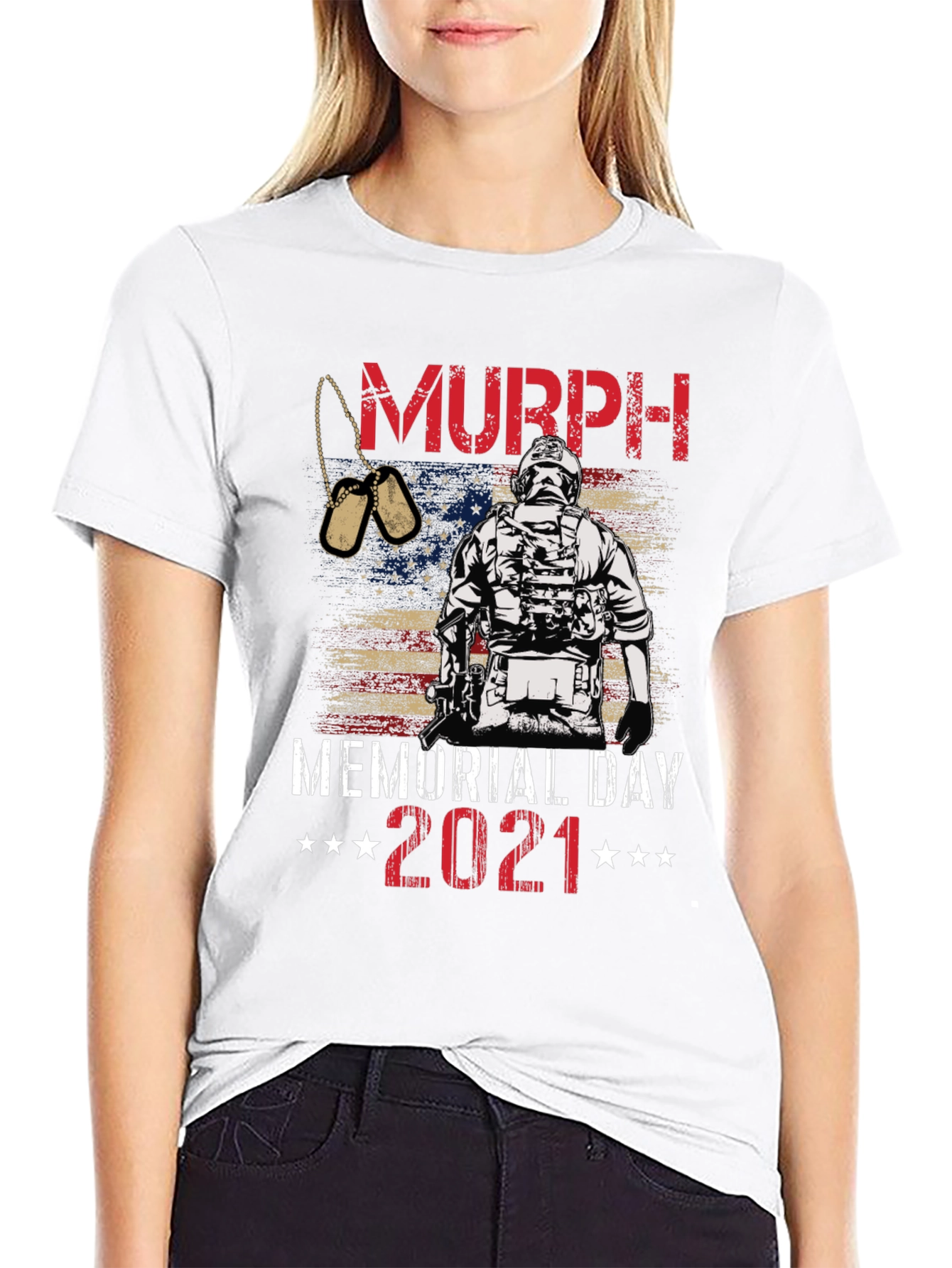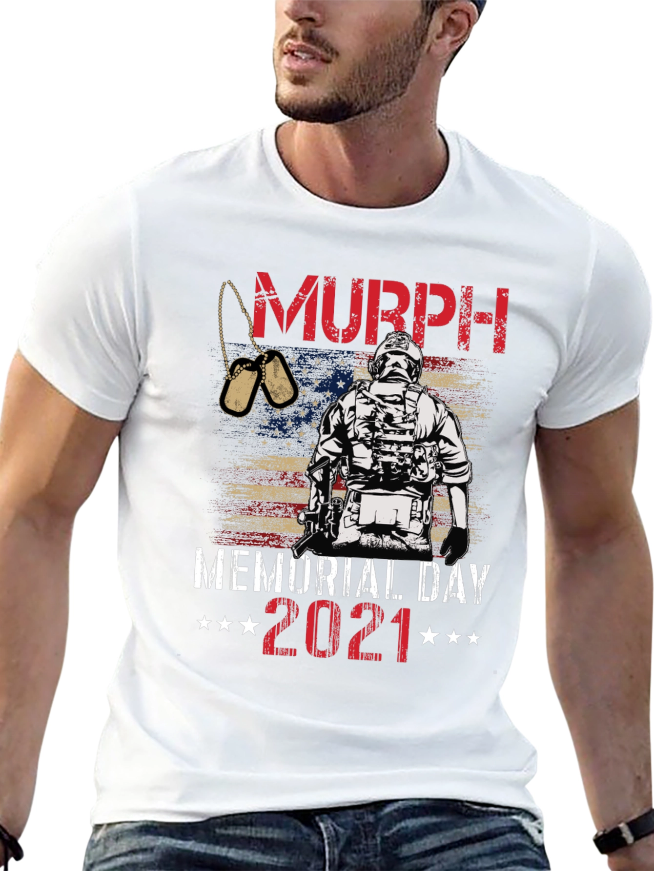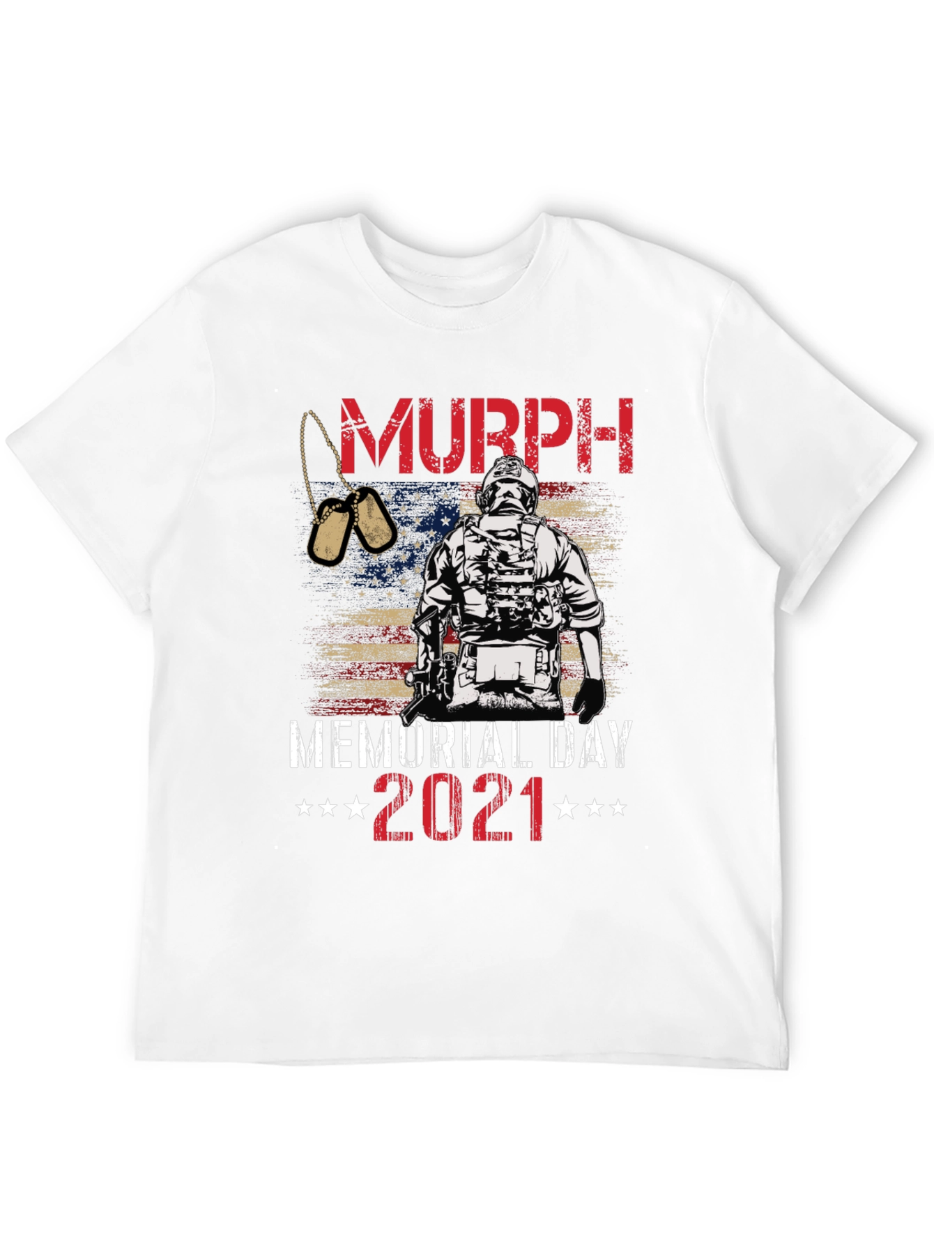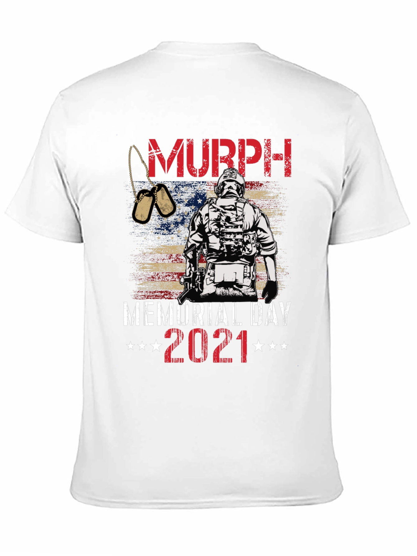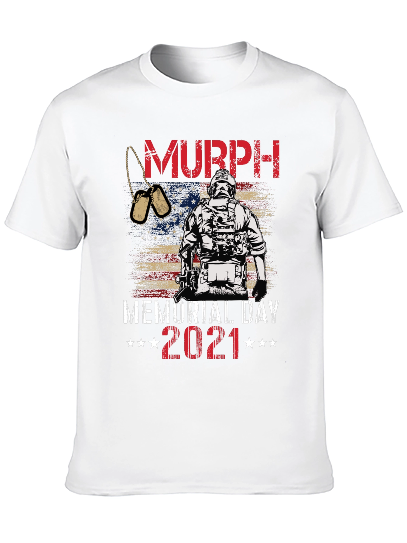 Honra a los héroes con esta camiseta conmemorativa del Memorial Day 2021. Presenta un diseño patriótico con la bandera estadounidense, la palabra "MURPH" y un soldado en el centro. Ideal para mostrar tu apoyo y recuerdo en el Día de los Caídos o cualquier día del año. Perfecta para veteranos, familiares de militares o cualquier persona que desee rendir homenaje a aquellos que dieron su vida por la libertad. Fabricada con materiales cómodos y duraderos para un uso prolongado. Demuestra tu patriotismo con esta camiseta única y significativa. ¡Un tributo perfecto para recordar y honrar!