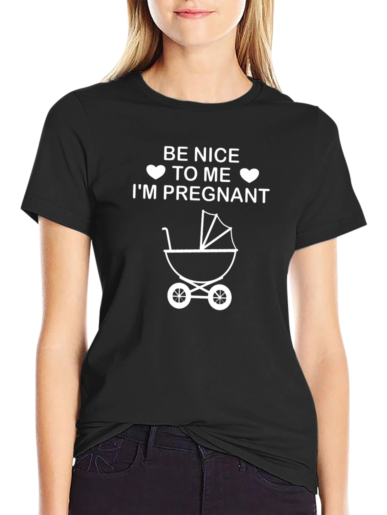 Luce con orgullo esta divertida y original camiseta negra con el mensaje "Sé amable conmigo, estoy embarazada", adornado con delicados corazones blancos y un tierno dibujo de un cochecito de bebé. Confeccionada en un tejido suave y cómodo, esta camiseta de manga corta es perfecta para el día a día durante el embarazo. Su diseño único y llamativo asegura que serás el centro de atención y provocará sonrisas a tu alrededor. Ideal para usar en salidas casuales, citas médicas o simplemente relajándote en casa, esta camiseta no solo te hará sentir cómoda, sino que también enviará un mensaje claro y simpático a quienes te rodean. ¡Una prenda imprescindible para cualquier futura mamá con sentido del humor!
