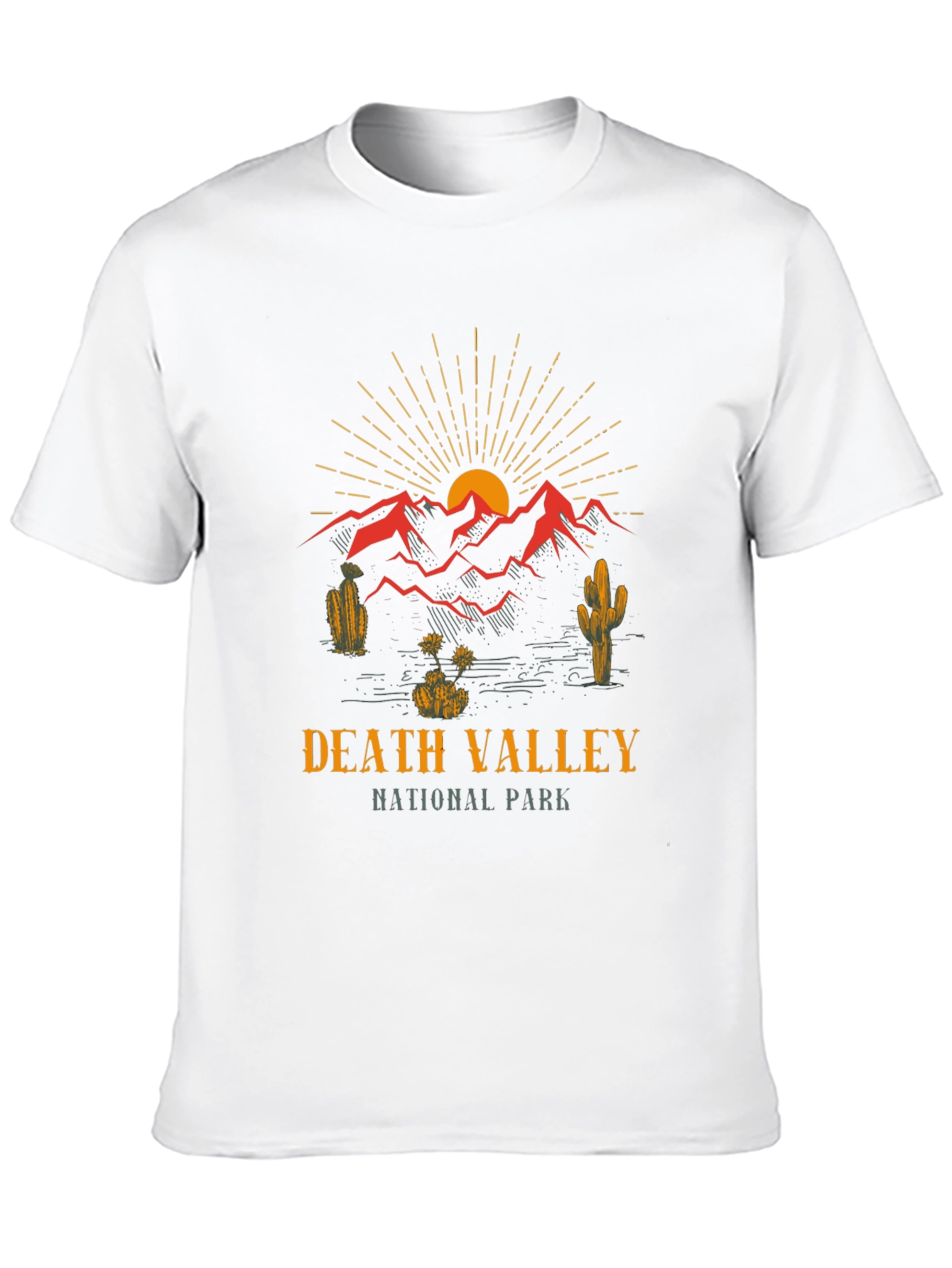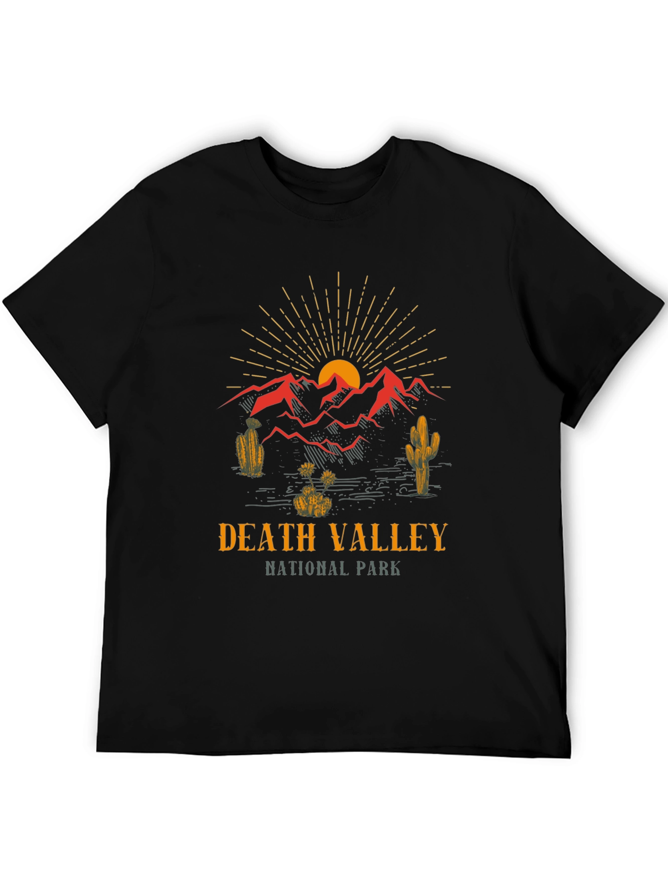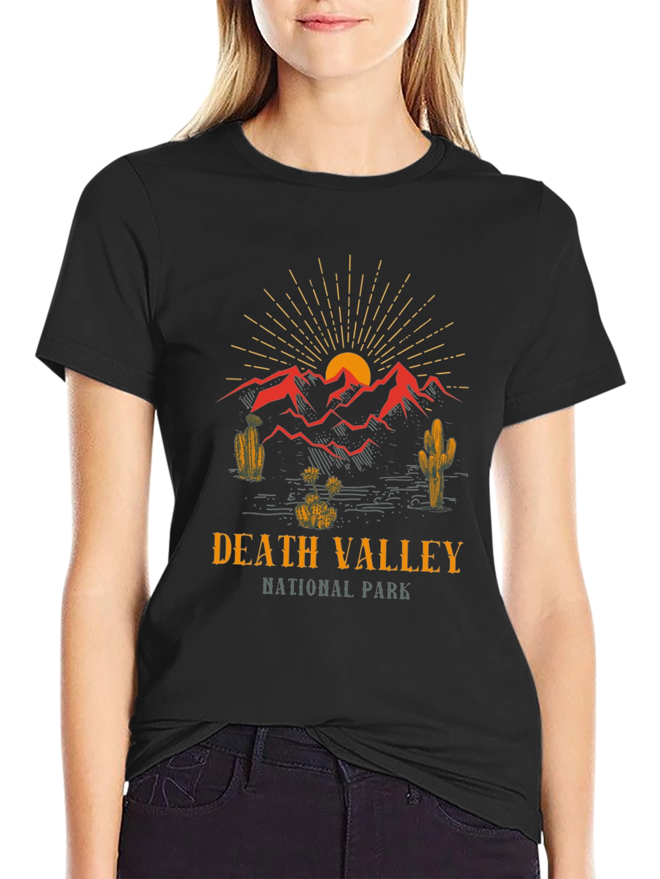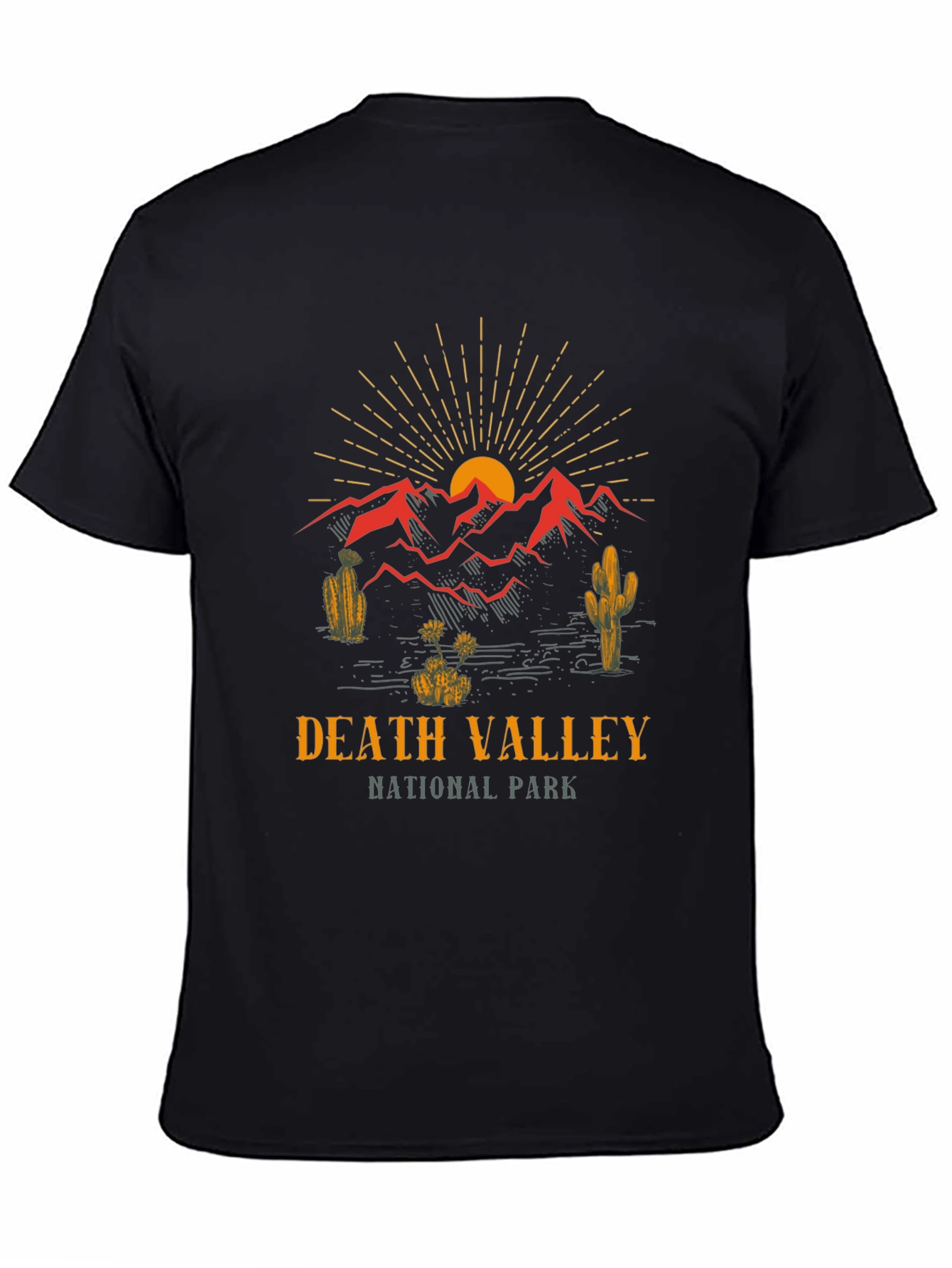 Luce esta camiseta negra con un diseño vibrante del Parque Nacional Death Valley. Presenta un paisaje desértico estilizado con montañas rojizas, cactus y un sol radiante, todo impreso con detalles nítidos. El texto "DEATH VALLEY NATIONAL PARK" resalta en color naranja, evocando la belleza árida y única del parque. Perfecta para los amantes de la naturaleza, los aventureros y aquellos que aprecian los diseños originales. Esta camiseta es ideal para el uso diario, excursiones y como un recuerdo especial de este impresionante lugar. Su diseño llamativo y cómodo la convierte en una excelente opción para expresar tu pasión por los paisajes desérticos.