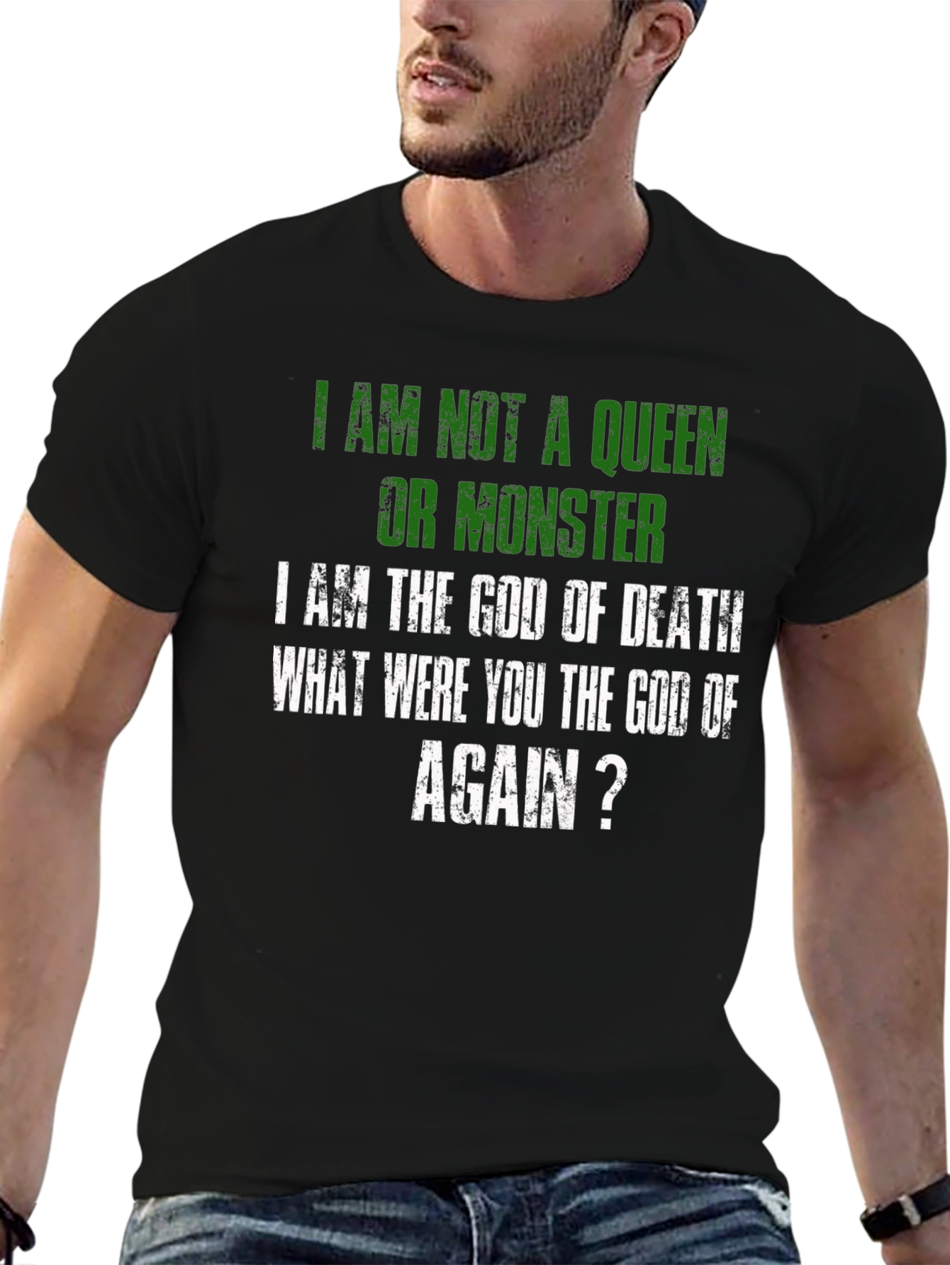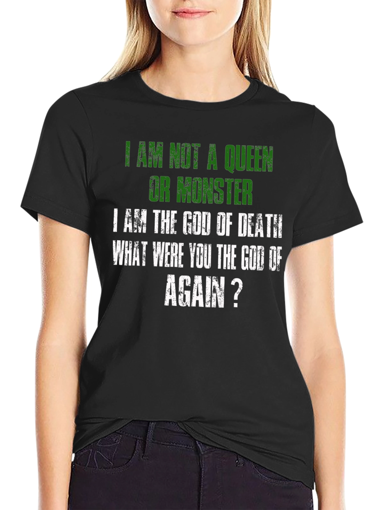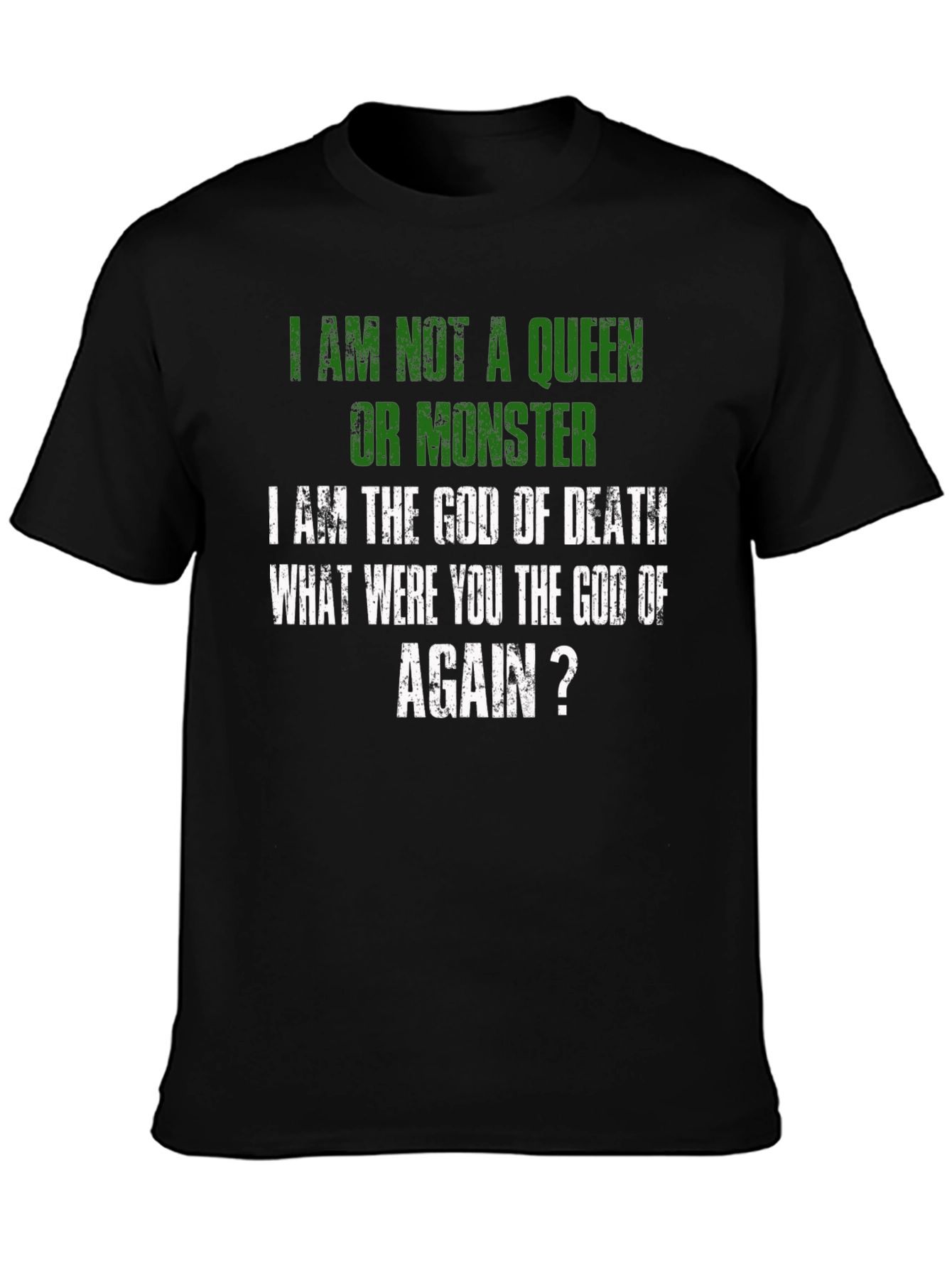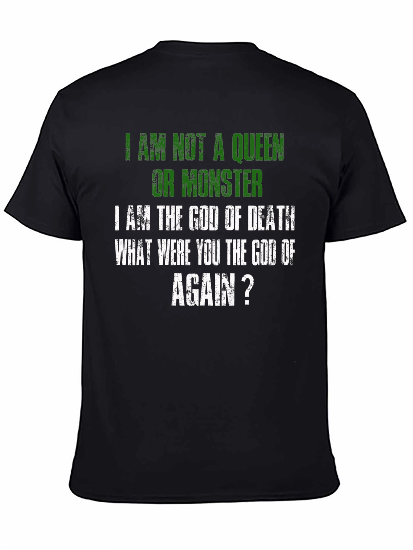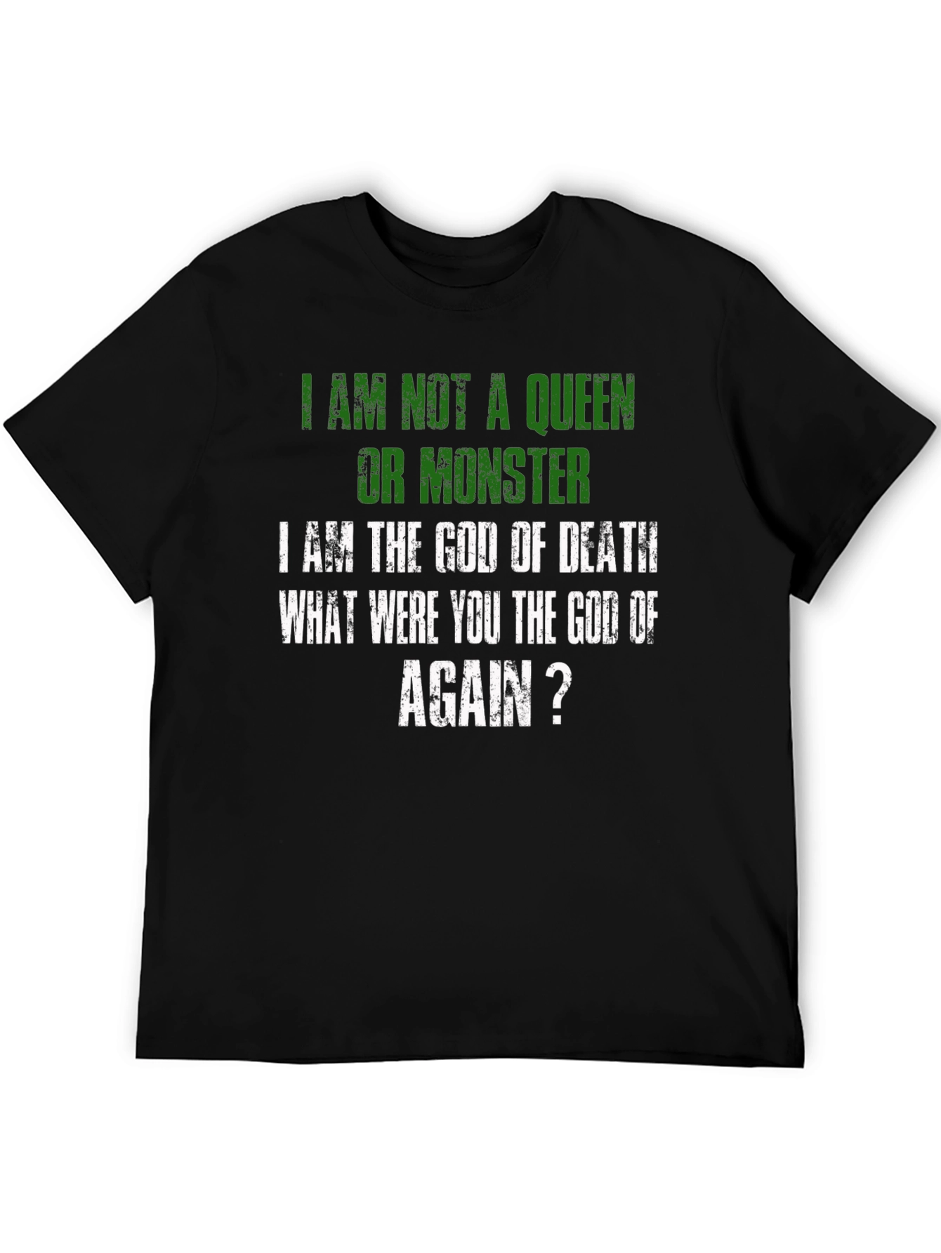 Luce una declaración audaz con esta camiseta negra que expresa un mensaje contundente: "No soy una reina ni un monstruo, soy el Dios de la Muerte. ¿Tú eras el dios de qué, otra vez?". Con letras en color verde y blanco de estilo desgastado, esta prenda destaca por su diseño único y original. Perfecta para aquellos que buscan expresar su individualidad y un sentido del humor oscuro. El corte clásico y el tejido suave al tacto aseguran comodidad durante todo el día. Ideal para llevar en eventos informales, reuniones con amigos o simplemente para añadir un toque de irreverencia a tu vestuario diario. ¡Haz una declaración con esta camiseta que no dejará indiferente a nadie!