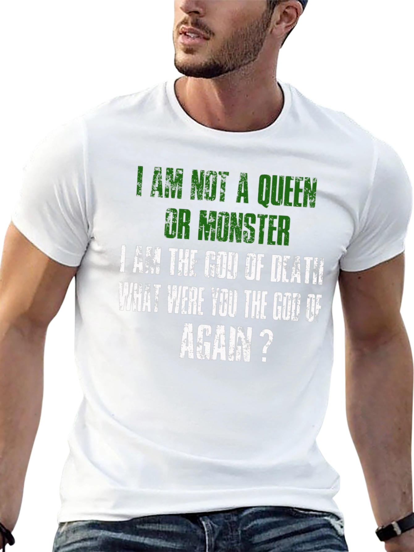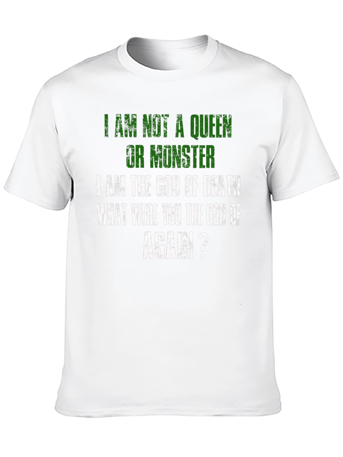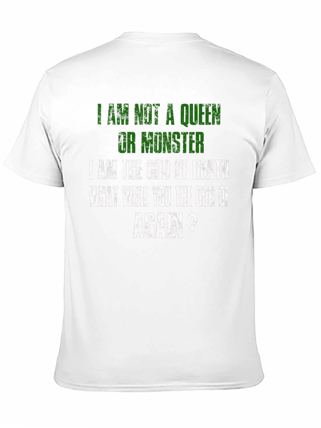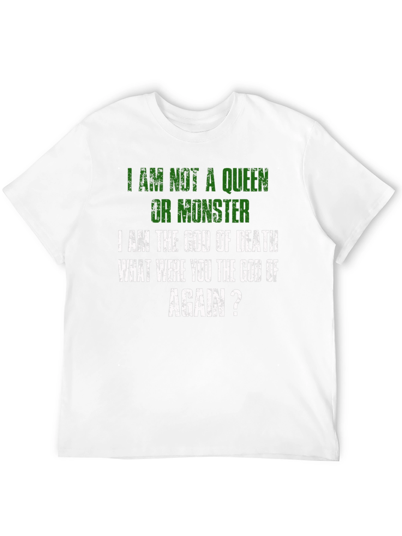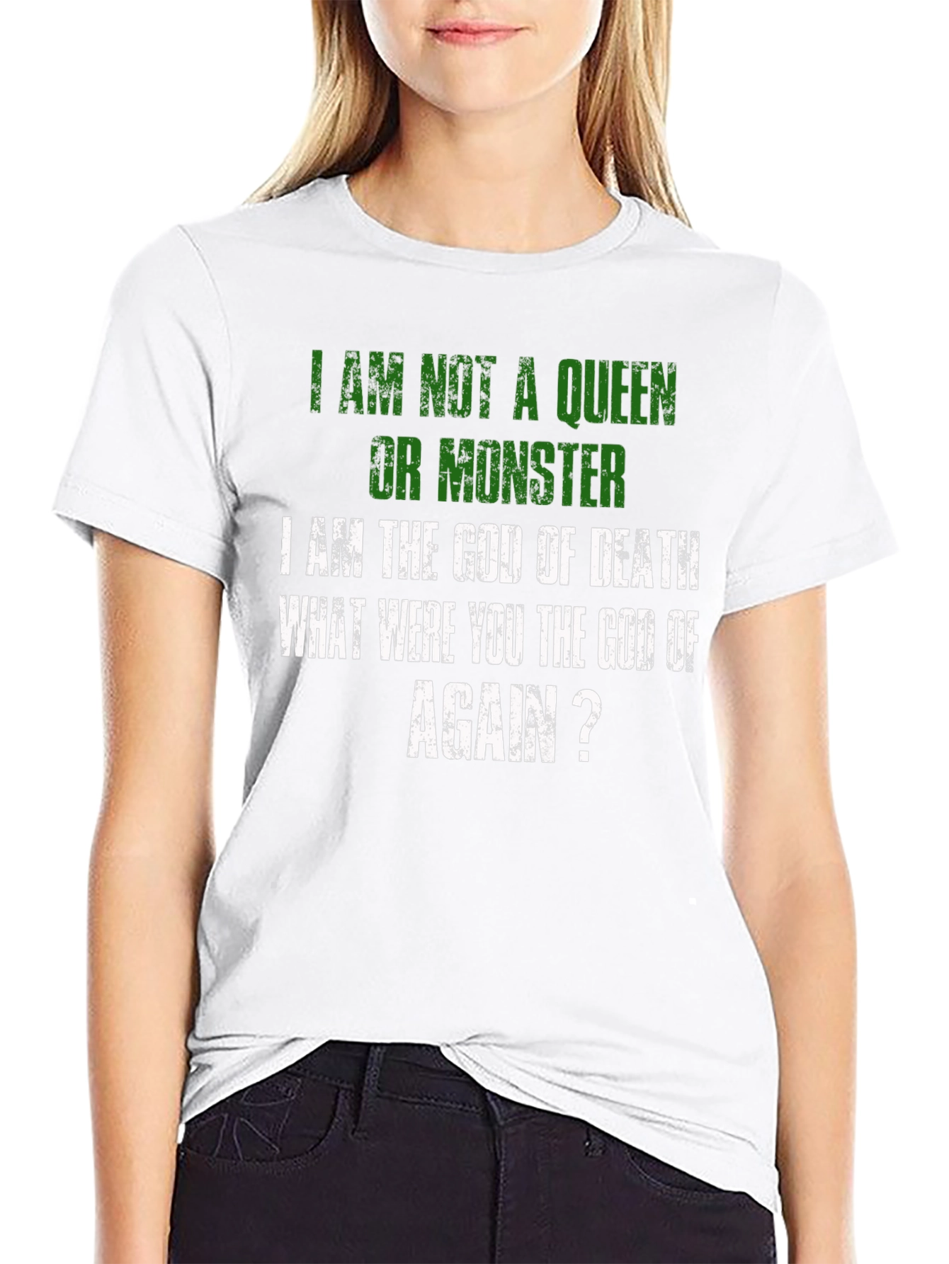 Luce una declaración audaz con esta camiseta negra que expresa un mensaje contundente: "No soy una reina ni un monstruo, soy el Dios de la Muerte. ¿Tú eras el dios de qué, otra vez?". Con letras en color verde y blanco de estilo desgastado, esta prenda destaca por su diseño único y original. Perfecta para aquellos que buscan expresar su individualidad y un sentido del humor oscuro. El corte clásico y el tejido suave al tacto aseguran comodidad durante todo el día. Ideal para llevar en eventos informales, reuniones con amigos o simplemente para añadir un toque de irreverencia a tu vestuario diario. ¡Haz una declaración con esta camiseta que no dejará indiferente a nadie!