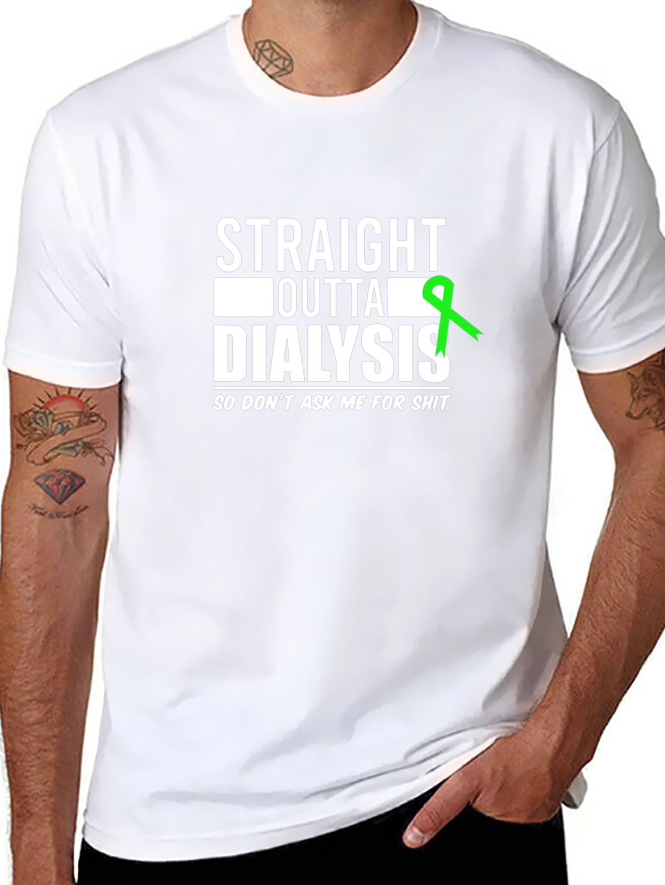 Muestra tu espíritu con esta camiseta negra de manga corta. Presenta un diseño llamativo con la frase "STRAIGHT OUTTA DIALYSIS" en letras blancas impactantes. Una cinta verde añade un toque de color y concienciación. La frase "SO DON'T ASK ME FOR SHIT" añade un toque audaz y humorístico. Perfecta para pacientes en diálisis que quieren expresar su experiencia con un toque de humor. Fabricada con materiales cómodos y duraderos, ideal para uso diario, citas médicas o reuniones de apoyo. Haz una declaración con esta camiseta única que combina estilo y mensaje.