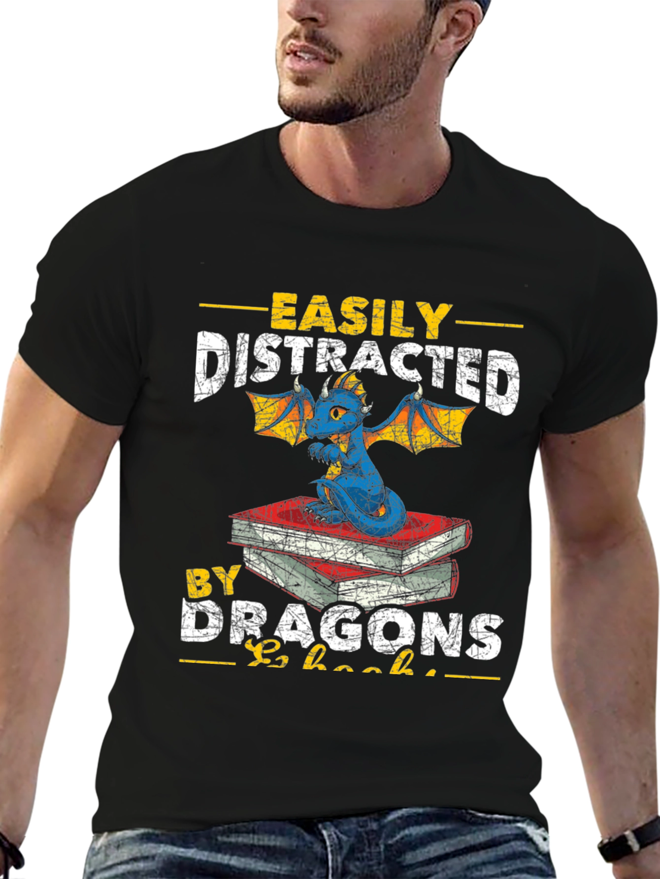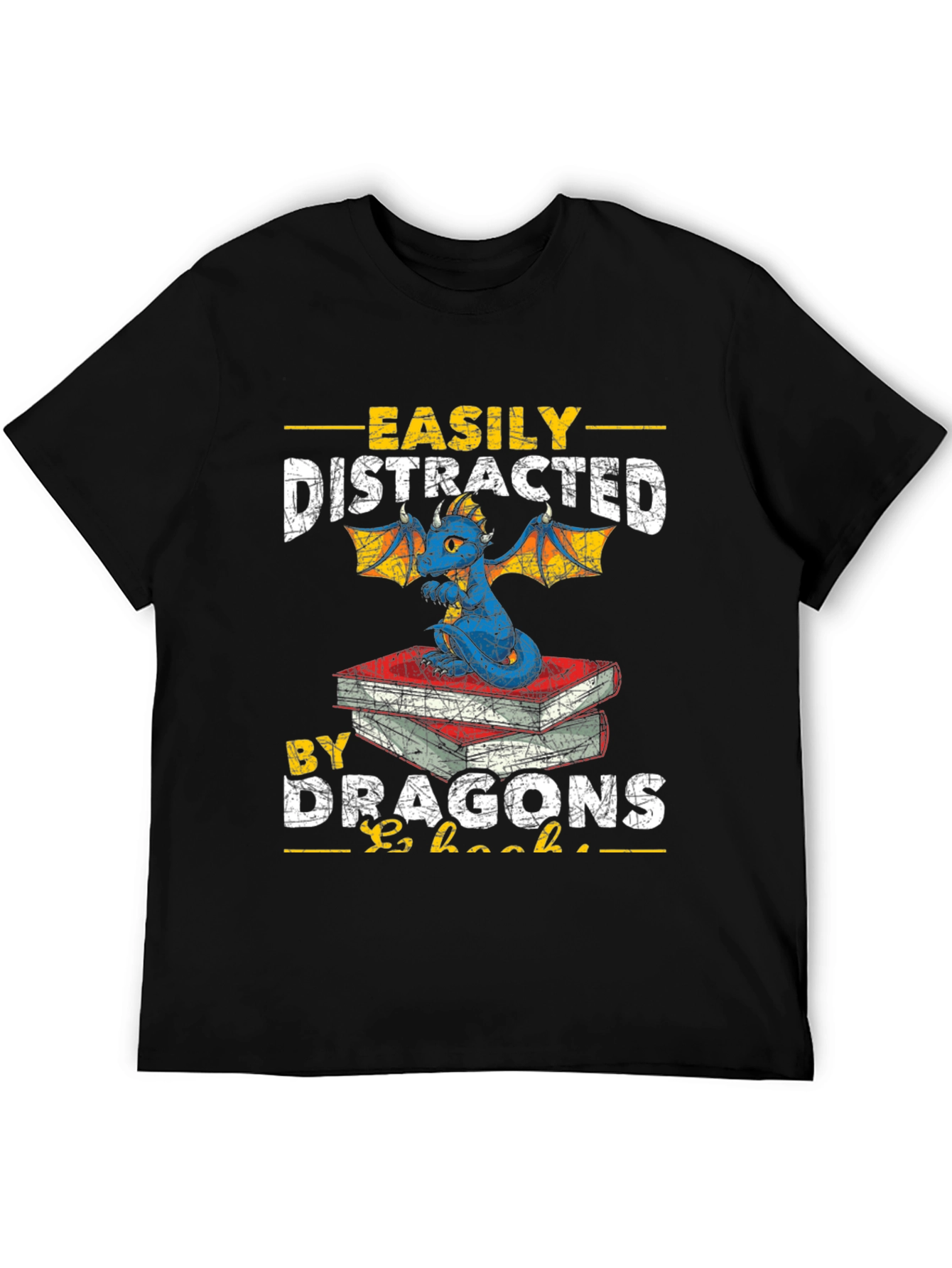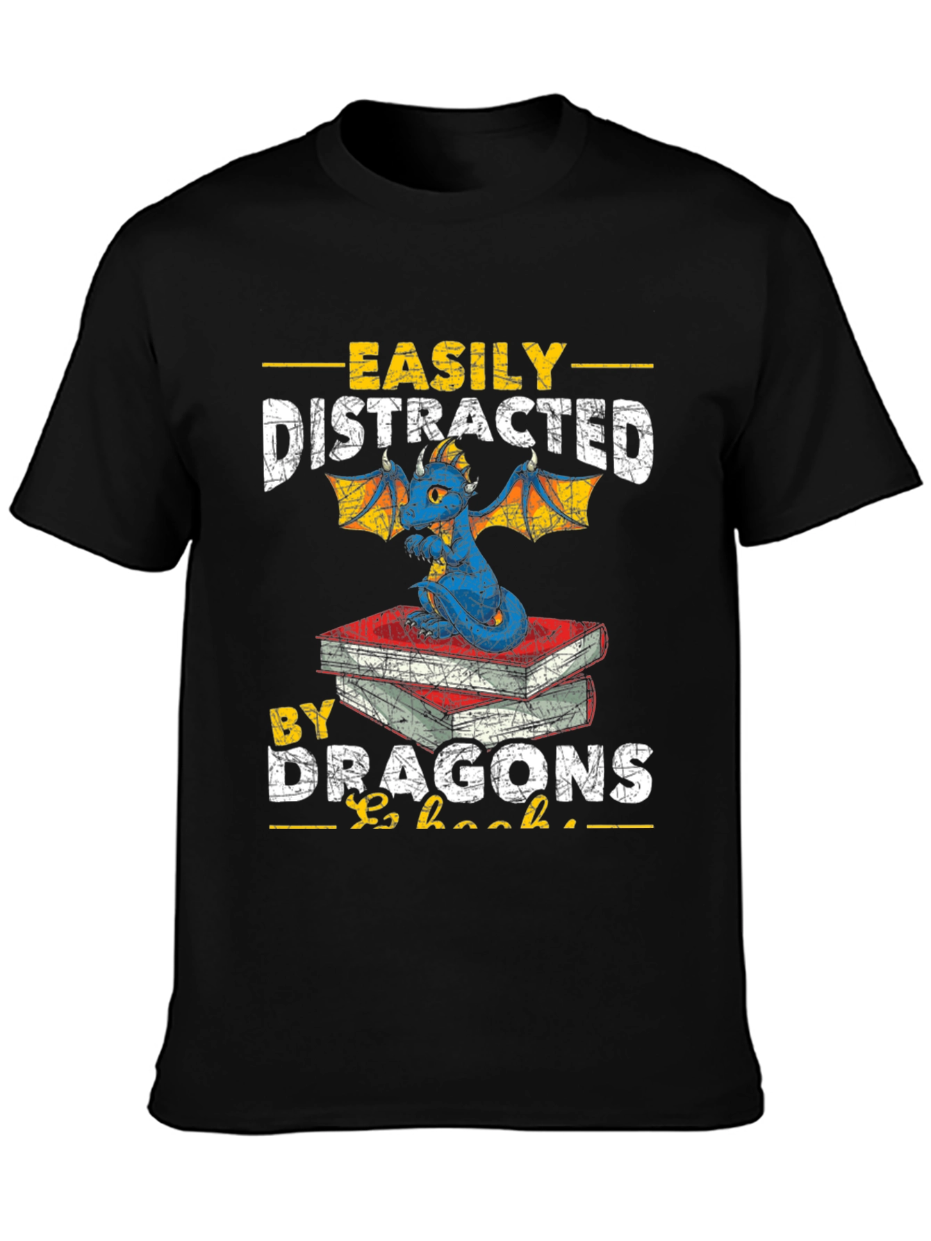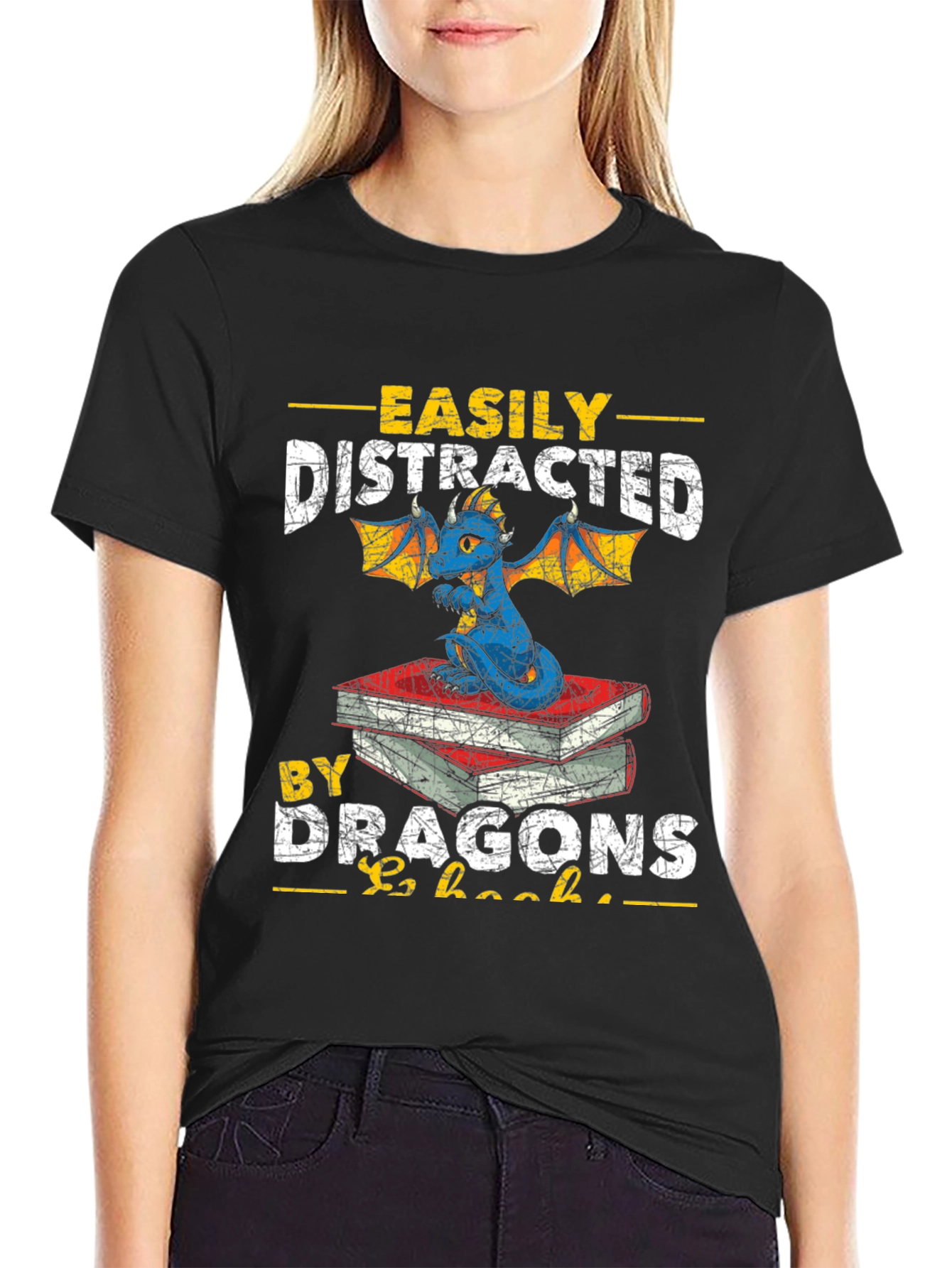 Muestra tu amor por los dragones y la lectura con esta divertida camiseta negra. El diseño presenta un dragón azul sentado sobre una pila de libros, con el texto "Easily Distracted by Dragons & Books" (Fácilmente Distraído por Dragones y Libros) en letras desgastadas de estilo vintage. Perfecta para bibliófilos, amantes de la fantasía y cualquiera que aprecie un diseño original. Hecha de un material suave y cómodo, ideal para usar en casa, en la biblioteca o en eventos temáticos. Una prenda que atraerá miradas y generará conversaciones entre entusiastas de la literatura fantástica.