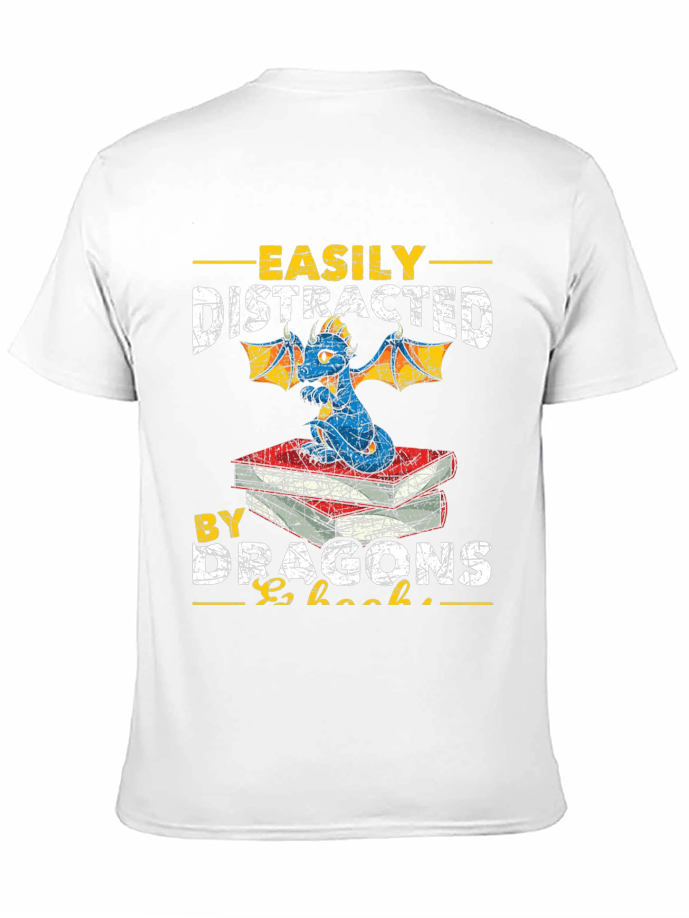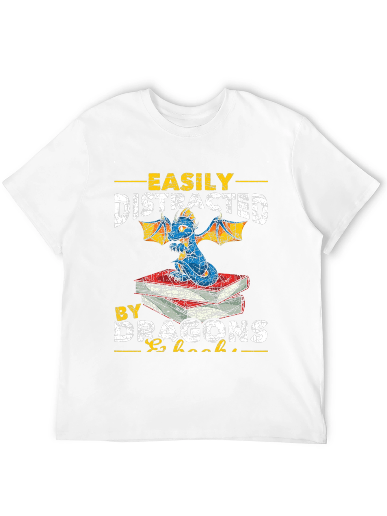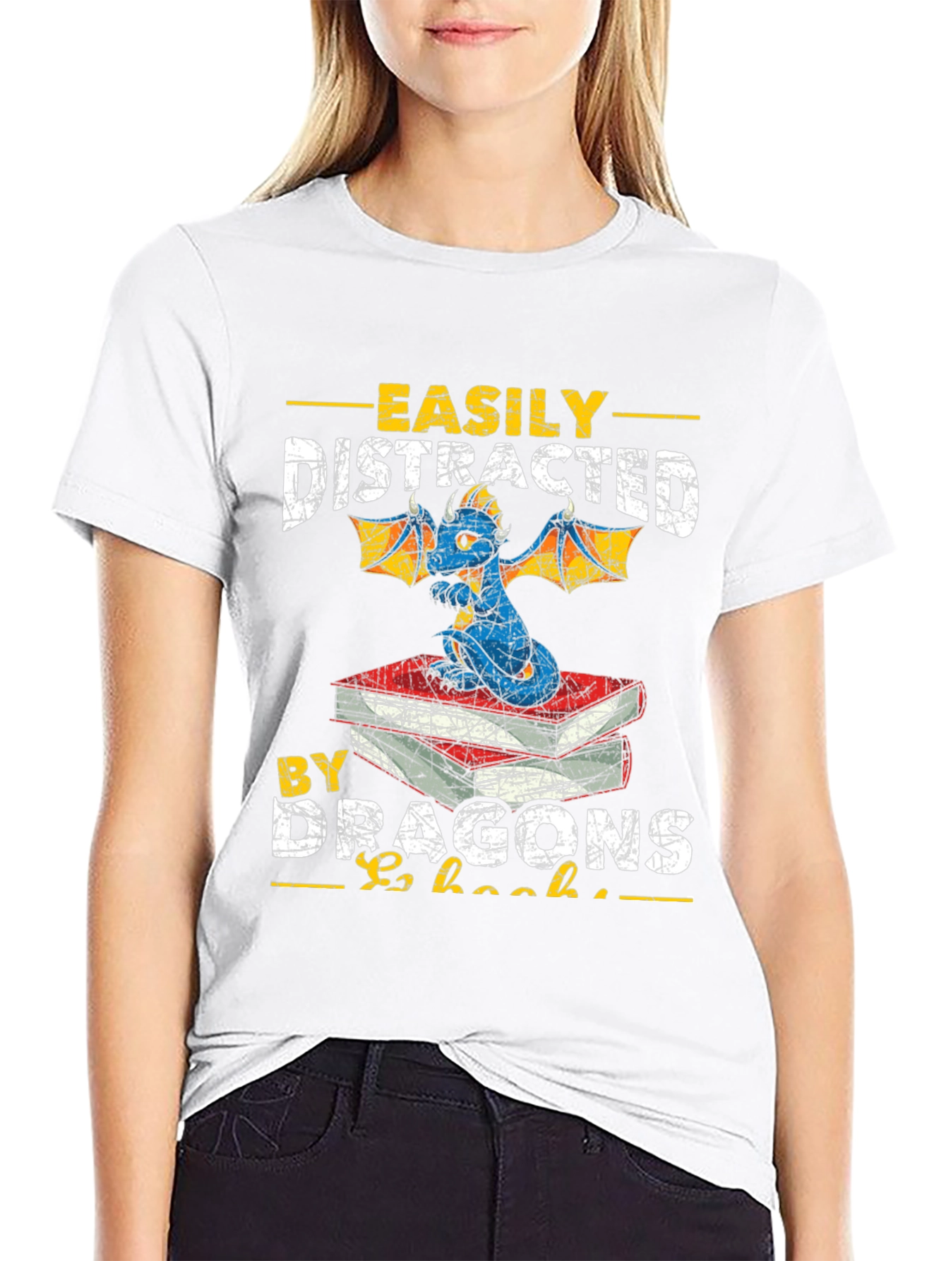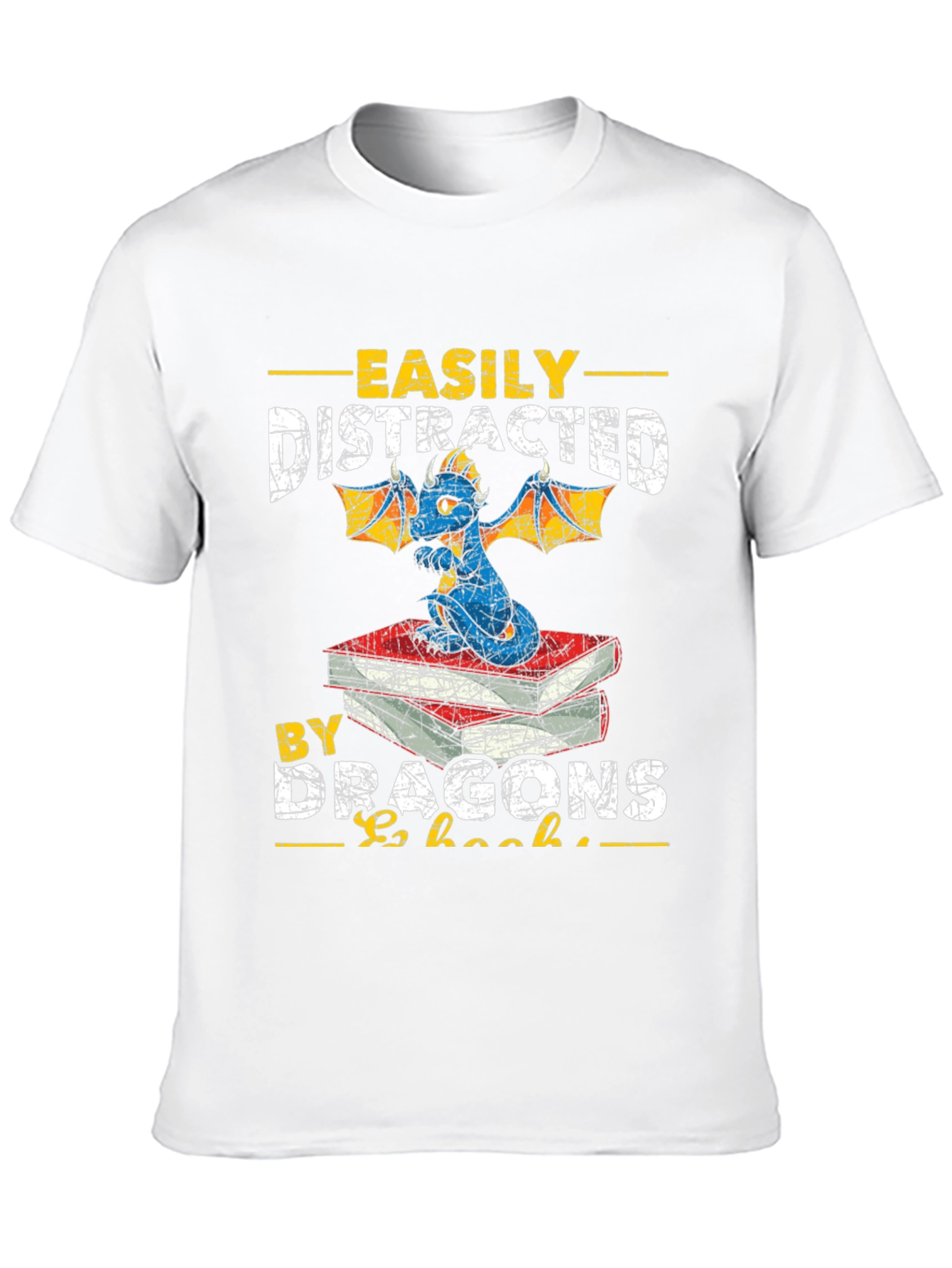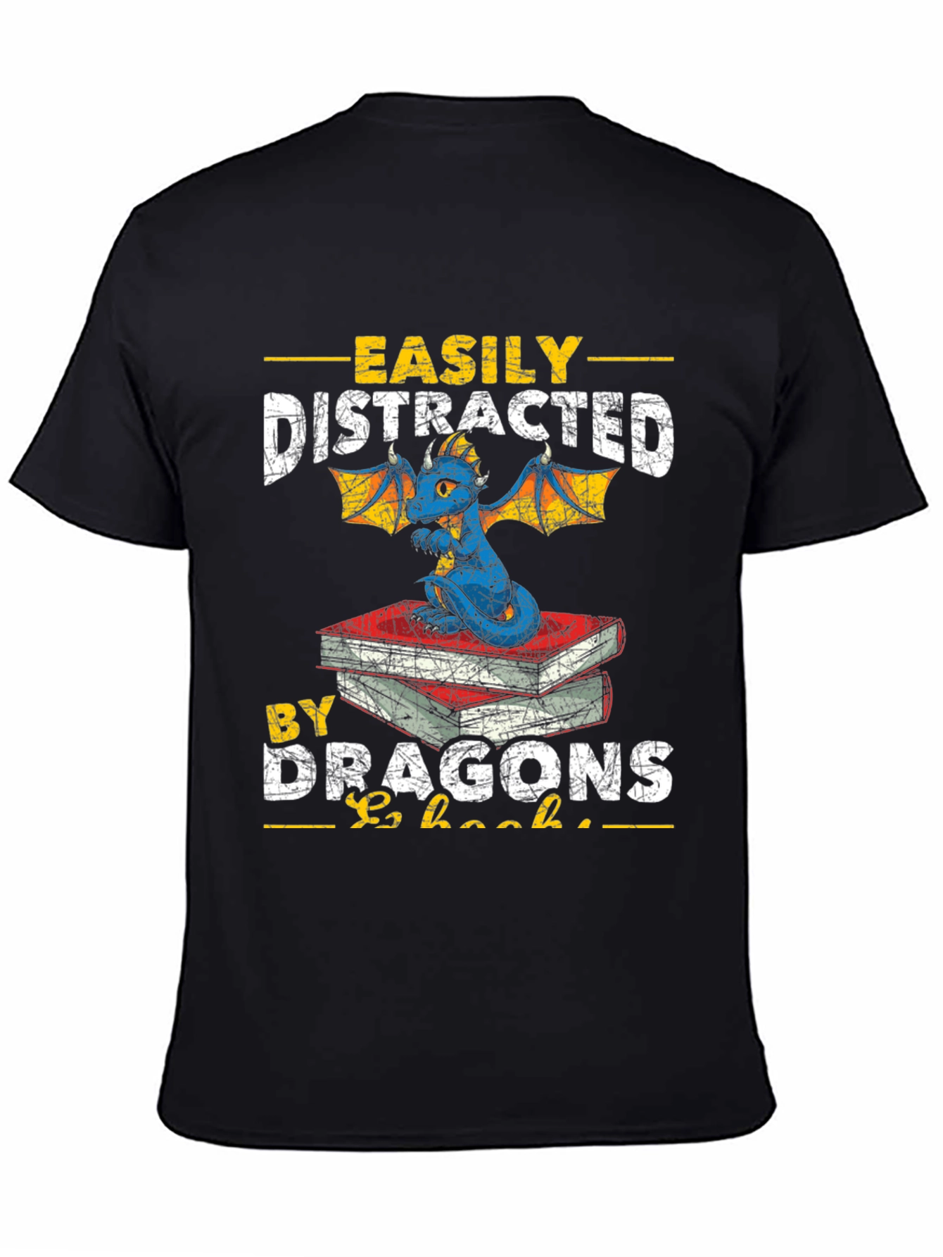 Muestra tu amor por los dragones y la lectura con esta divertida camiseta negra. El diseño presenta un dragón azul sentado sobre una pila de libros, con el texto "Easily Distracted by Dragons & Books" (Fácilmente Distraído por Dragones y Libros) en letras desgastadas de estilo vintage. Perfecta para bibliófilos, amantes de la fantasía y cualquiera que aprecie un diseño original. Hecha de un material suave y cómodo, ideal para usar en casa, en la biblioteca o en eventos temáticos. Una prenda que atraerá miradas y generará conversaciones entre entusiastas de la literatura fantástica.