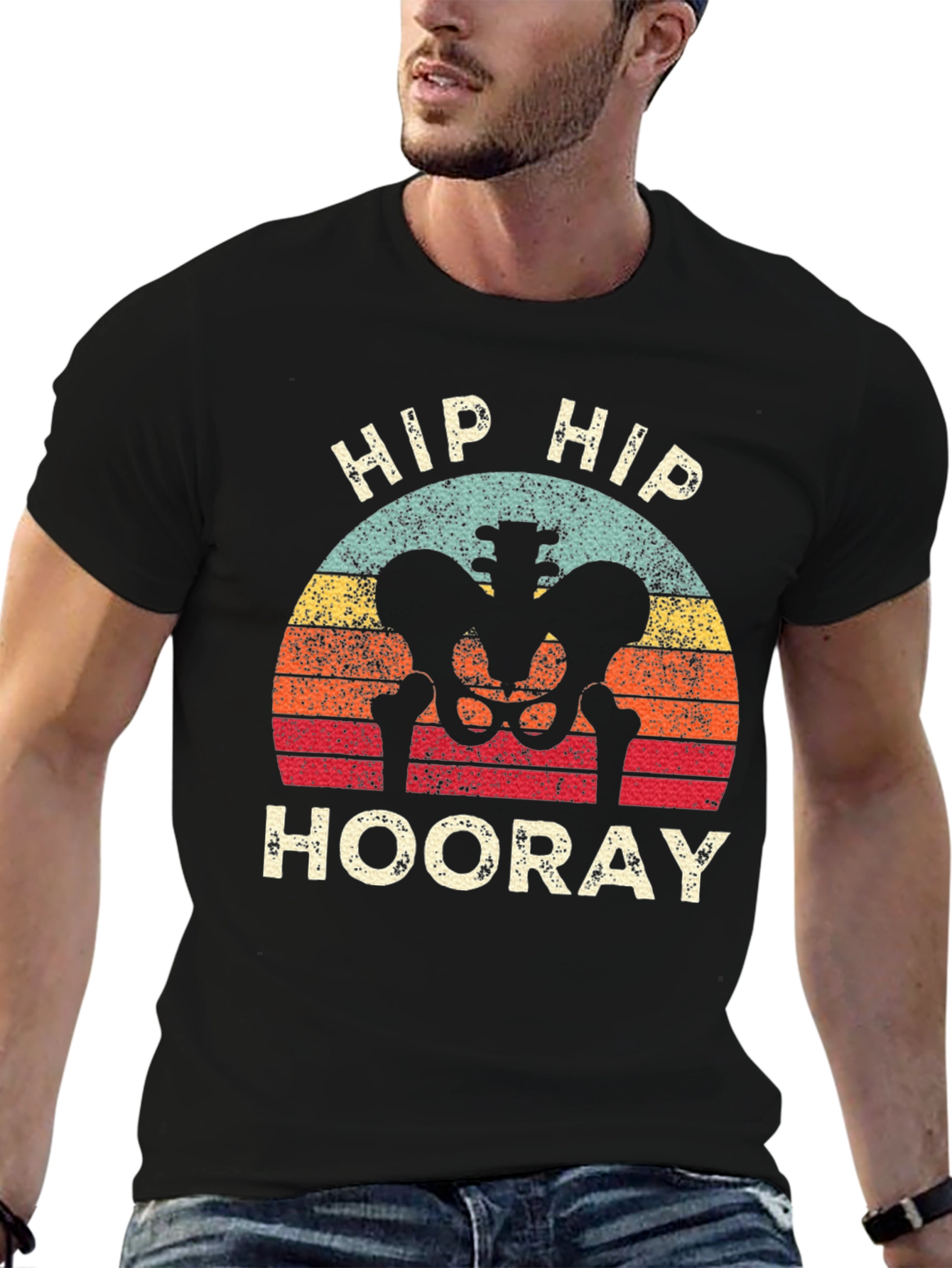 Luce esta original camiseta negra con un diseño retro de esqueleto de caderas sobre un fondo de atardecer vintage. Las palabras "Hip Hip Hooray" añaden un toque divertido y único. Fabricada con materiales cómodos y duraderos, esta camiseta es perfecta para cualquier ocasión casual. Ideal para expresar tu sentido del humor y tu amor por los diseños originales. ¡Perfecta para regalar a amigos y familiares con un gran sentido del humor o profesionales de la salud! Agrega un toque llamativo y único a tu guardarropa con esta camiseta que seguro llamará la atención.