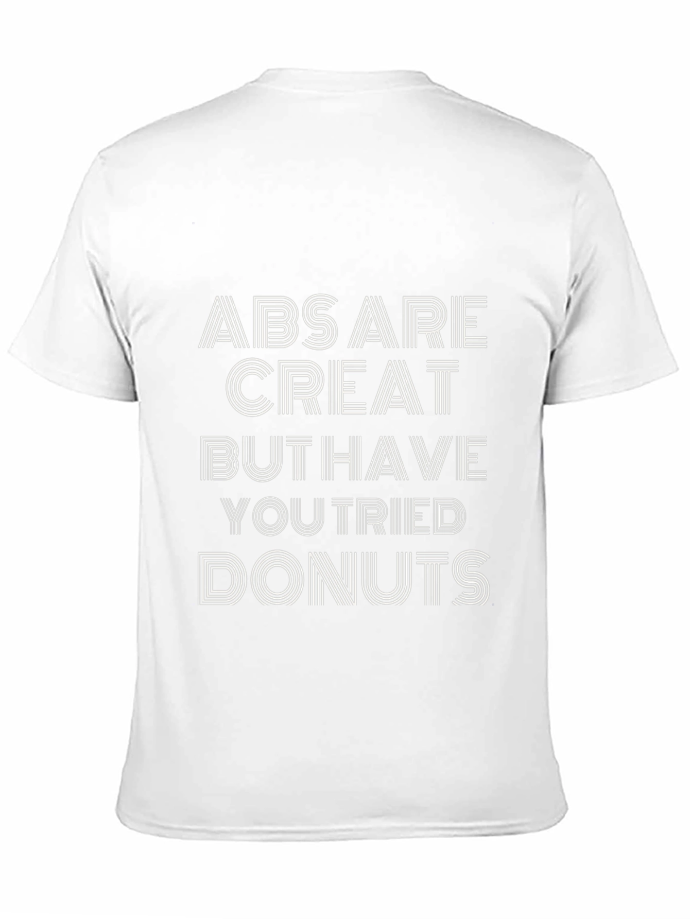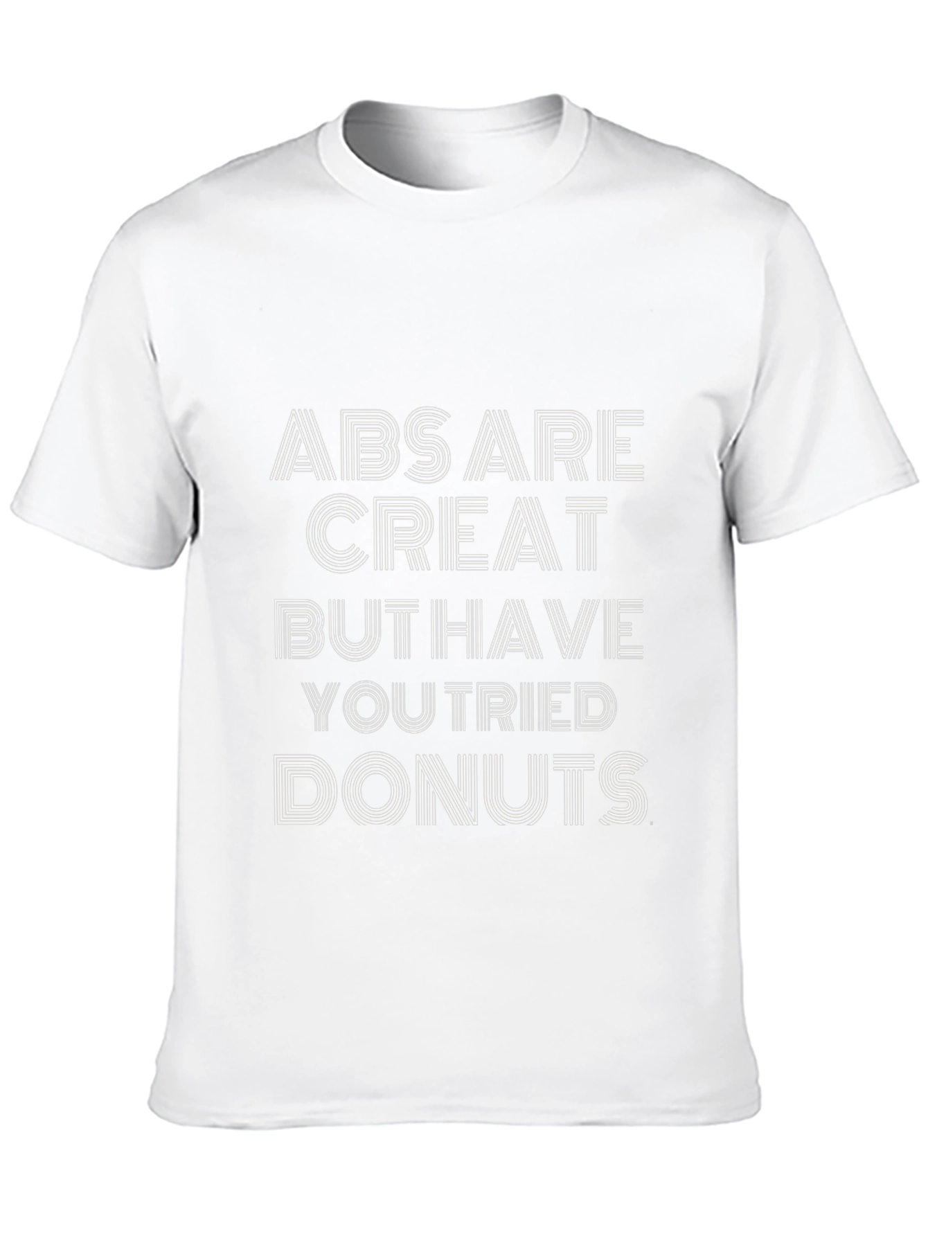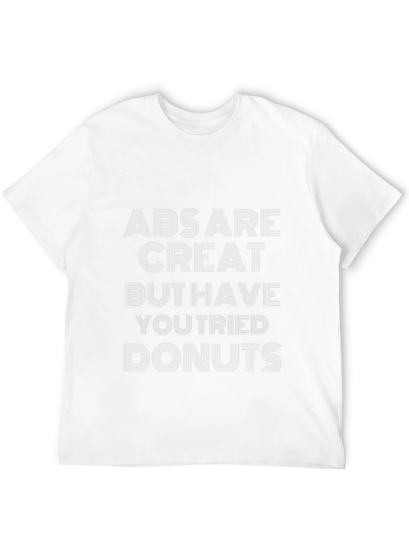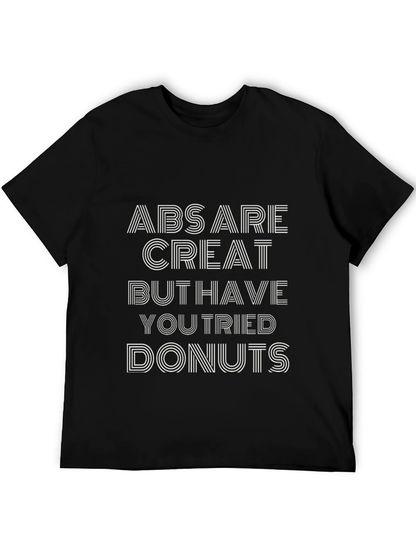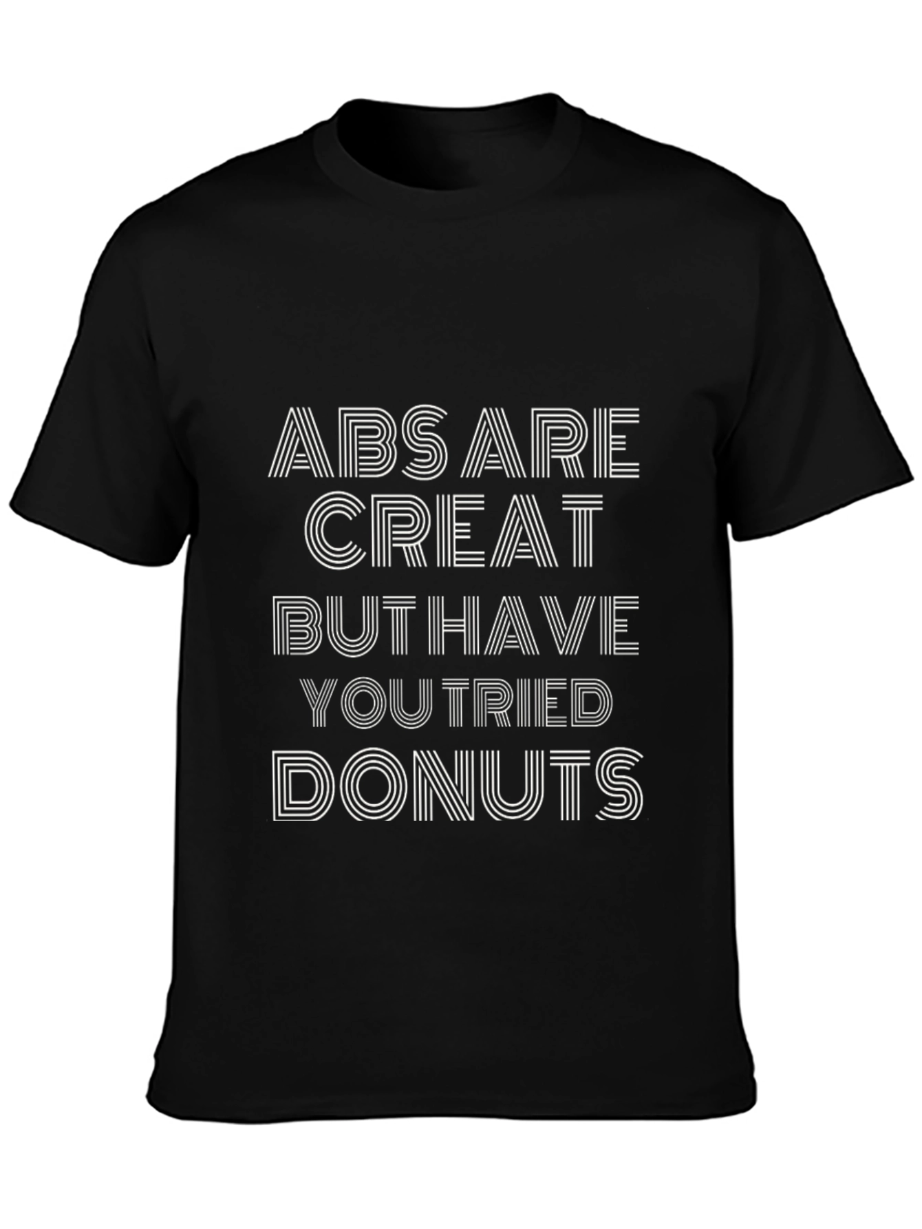 Luce esta camiseta negra con un mensaje divertido y original. La camiseta presenta la frase "Abs are Great but Have You Tried Donuts" en letras blancas con un diseño de líneas paralelas que le da un toque moderno y llamativo. Ideal para aquellos que disfrutan del humor y no se toman la vida demasiado en serio. Perfecta para usar en salidas casuales, reuniones con amigos o simplemente para relajarte en casa con estilo. Esta camiseta seguramente generará sonrisas y conversaciones interesantes dondequiera que vayas. Un regalo perfecto para los amantes de los donuts y el buen humor.