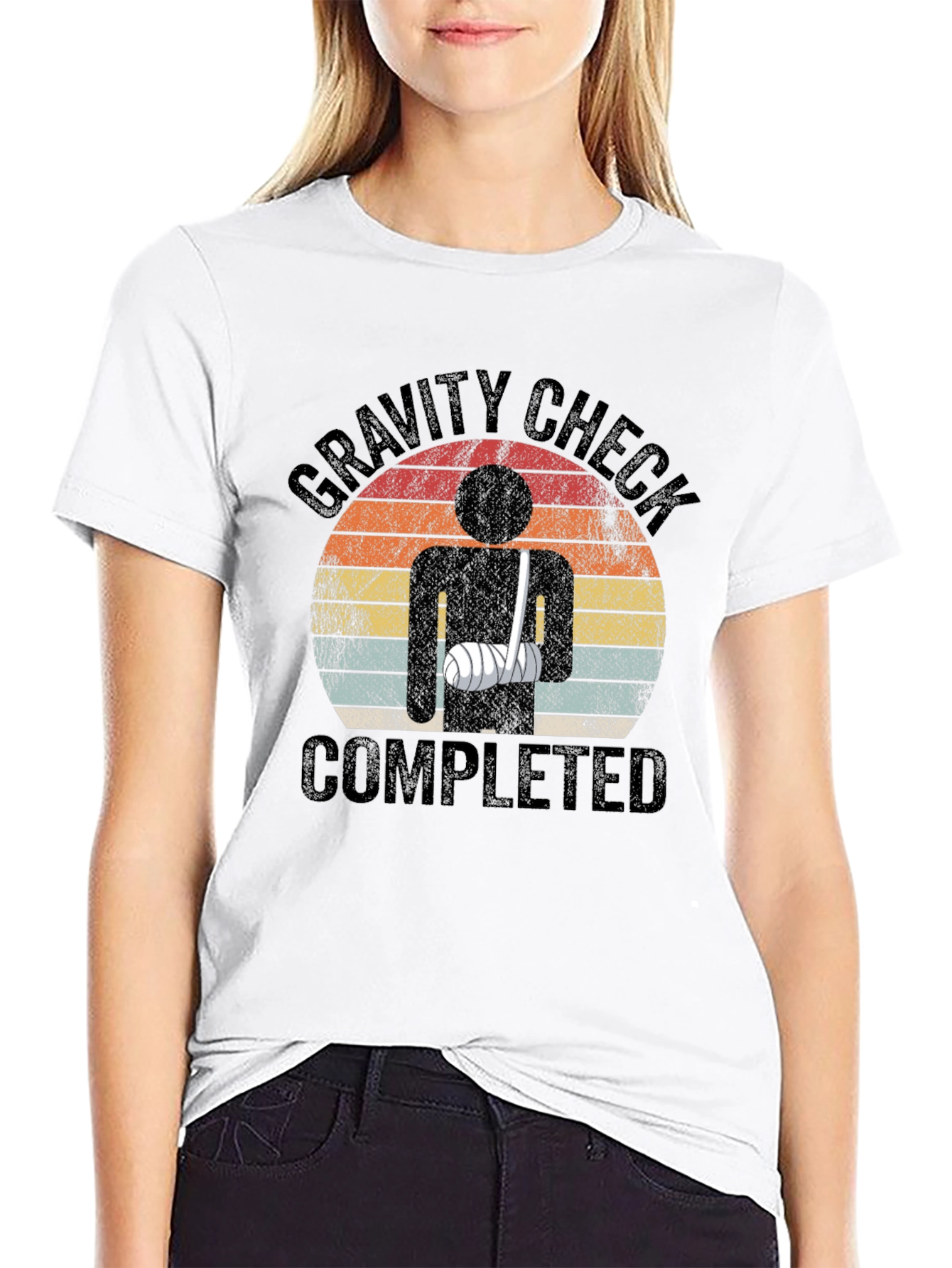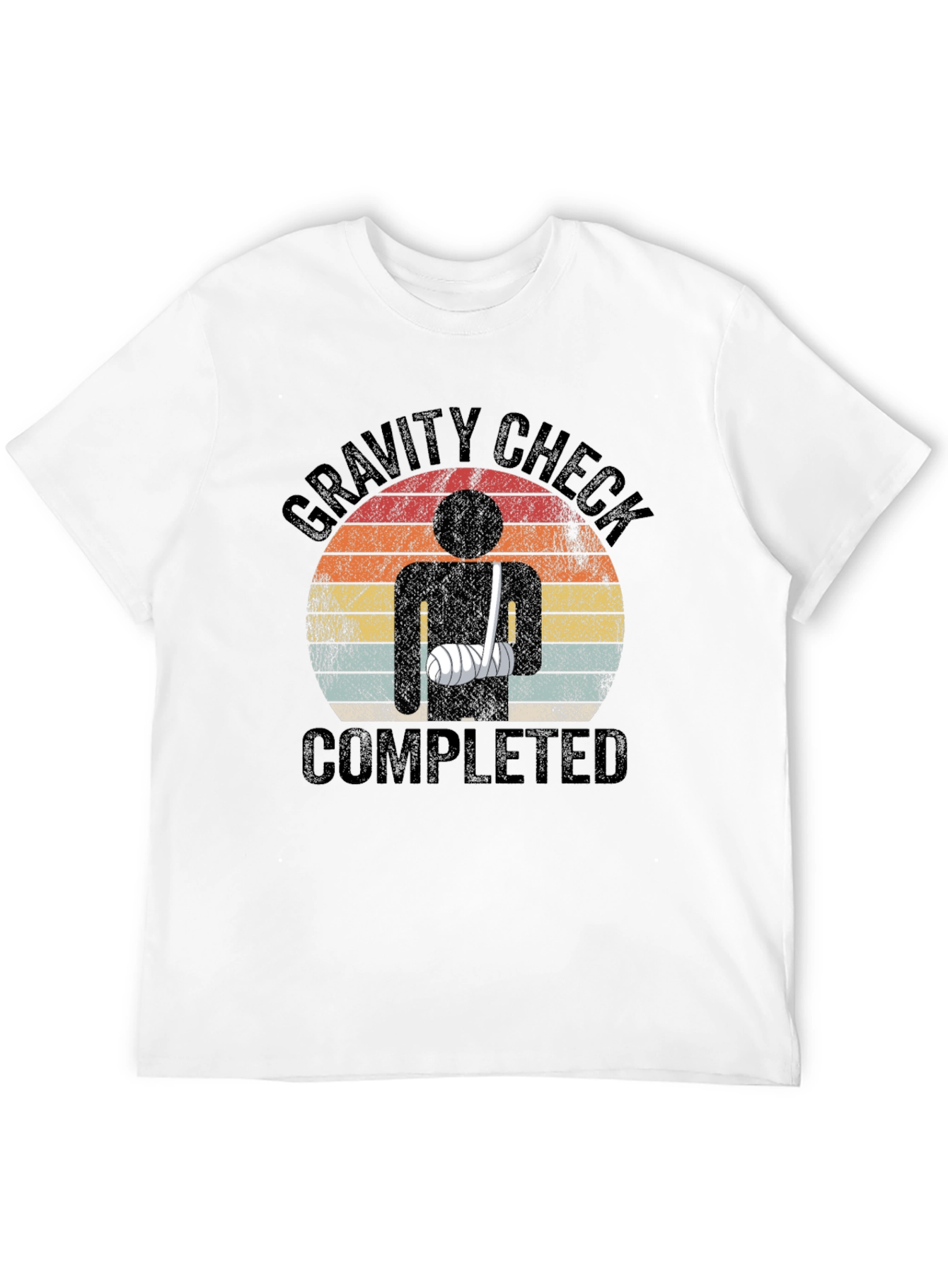 Esta camiseta negra de manga corta presenta un diseño único y llamativo. En el centro, un gráfico circular con un estilo retro de franjas horizontales en tonos naranja, amarillo y blanco envejecido, muestra una figura estilizada con un brazo vendado. La frase "GRAVITY CHECK" en la parte superior y "COMPLETED" en la parte inferior enmarcan la imagen, sugiriendo un toque humorístico sobre situaciones accidentales. Perfecta para aquellos con un sentido del humor peculiar, esta camiseta es ideal para uso casual, salidas informales o para regalar a amigos y familiares que aprecien la originalidad y el confort en su vestimenta. Su diseño versátil la convierte en una prenda imprescindible para cualquier guardarropa relajado y divertido.