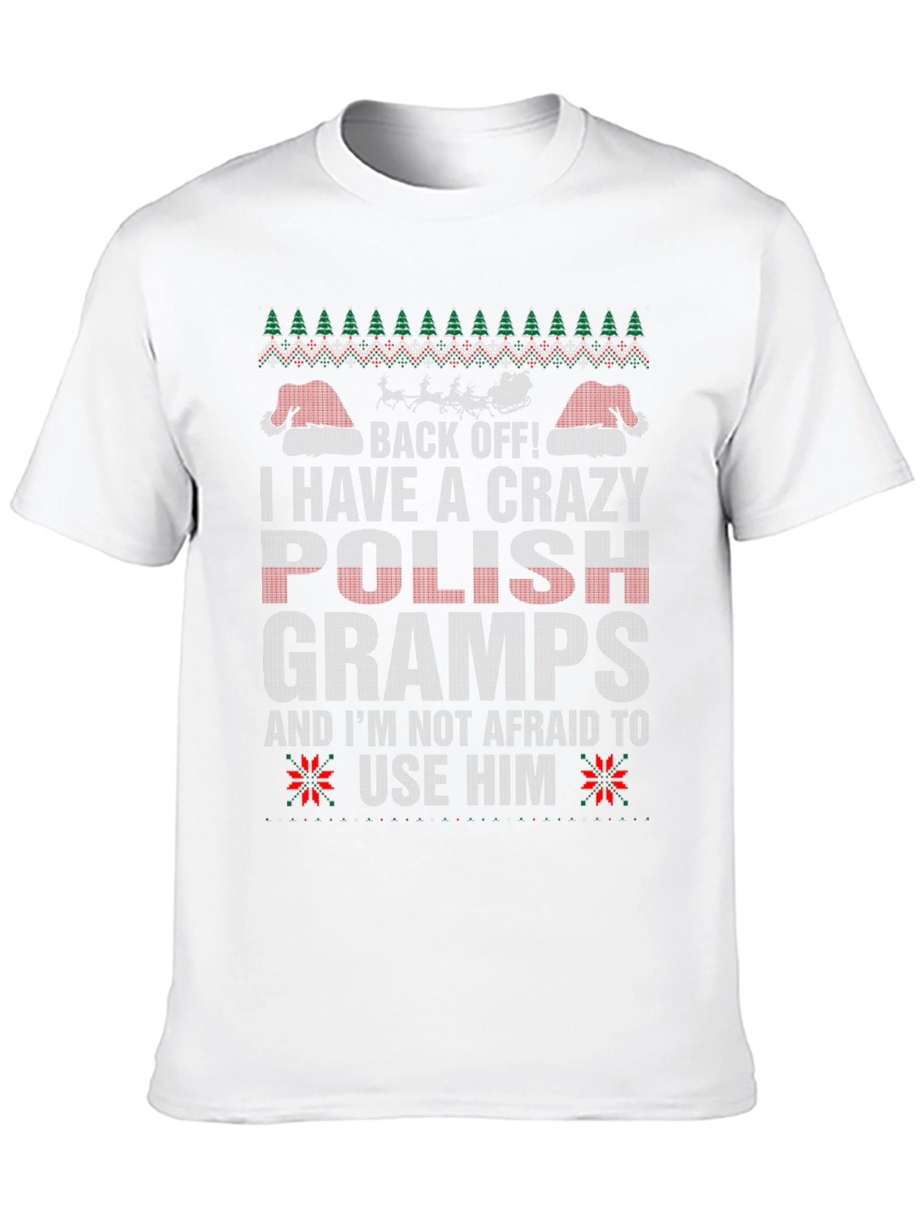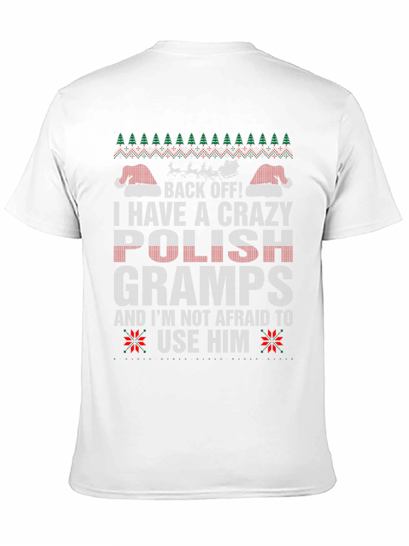¡Prepárate para las fiestas con esta divertida camiseta! Perfecta para aquellos que aman celebrar la Navidad con un toque de humor. Esta camiseta negra presenta un diseño único estilo "ugly sweater" con motivos navideños y la frase "BACK OFF! I HAVE A CRAZY POLISH GRAMPS AND I'M NOT AFRAID TO USE HIM". La palabra "POLISH" está decorada con la bandera polaca. Ideal para llevar a fiestas navideñas, reuniones familiares o simplemente para mostrar tu amor por tu abuelo polaco. ¡Consigue la tuya y difunde alegría navideña con un toque de picardía!