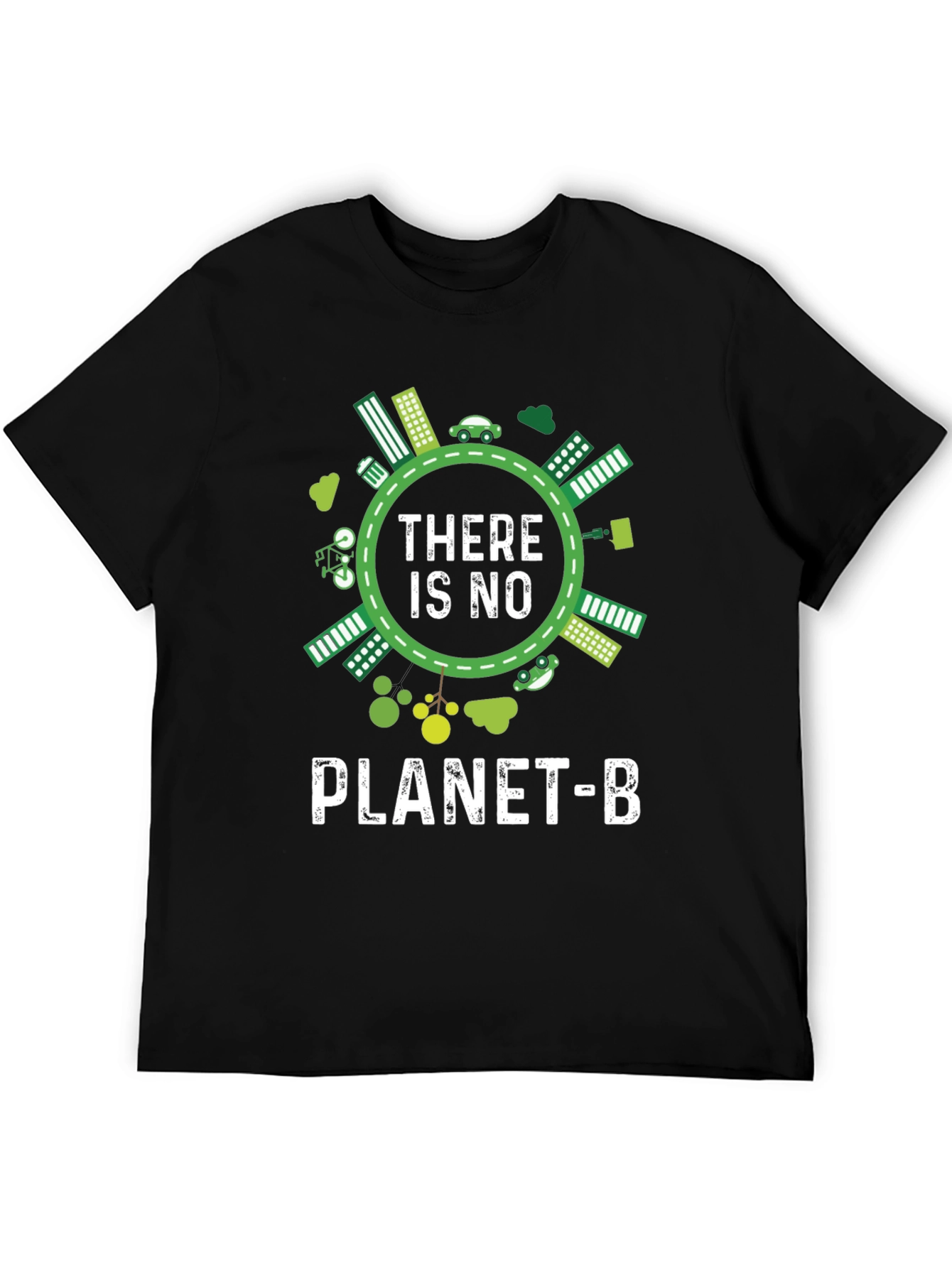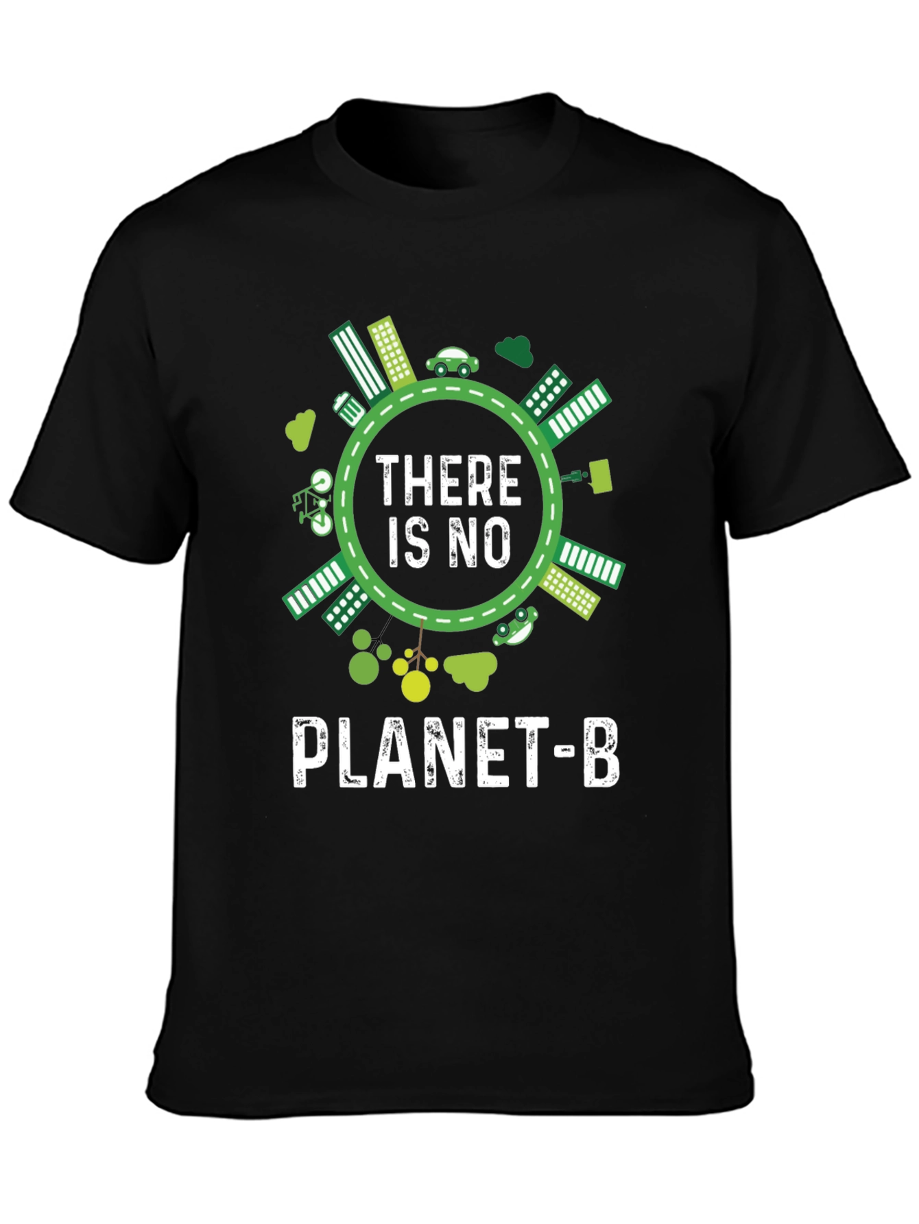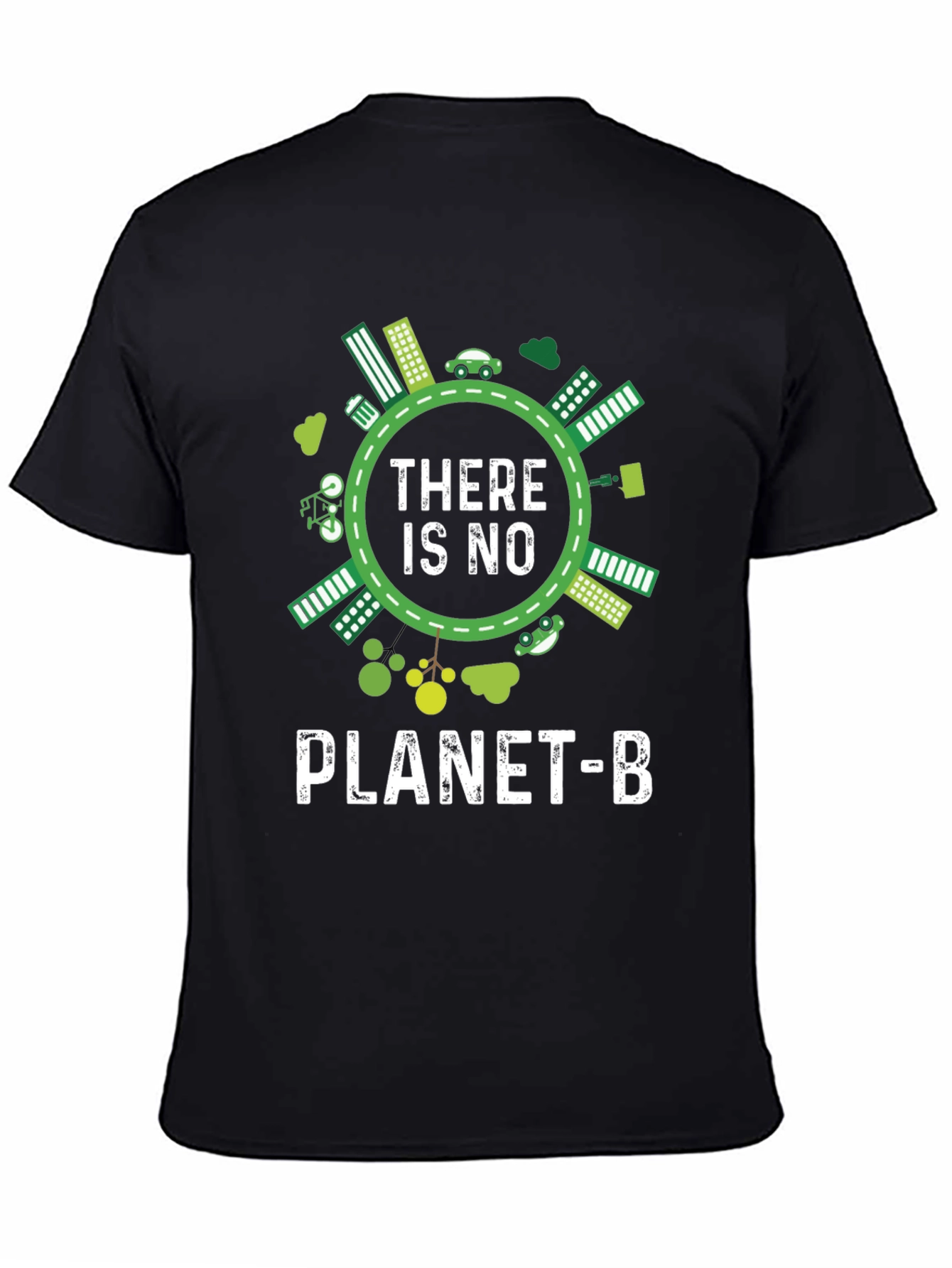 Luce esta llamativa camiseta negra con un diseño impactante que promueve la conciencia ambiental. El diseño presenta una ilustración circular con elementos ecológicos como edificios verdes, coches eléctricos y vegetación, rodeando el mensaje 'THERE IS NO PLANET-B' en letras blancas. Perfecta para expresar tu compromiso con el medio ambiente con estilo. Ideal para llevar en eventos ecológicos, manifestaciones o simplemente para el día a día, esta camiseta es una declaración de principios y una invitación a la reflexión sobre nuestro planeta. Fabricada con materiales suaves y cómodos, te asegura un ajuste perfecto y durabilidad.
