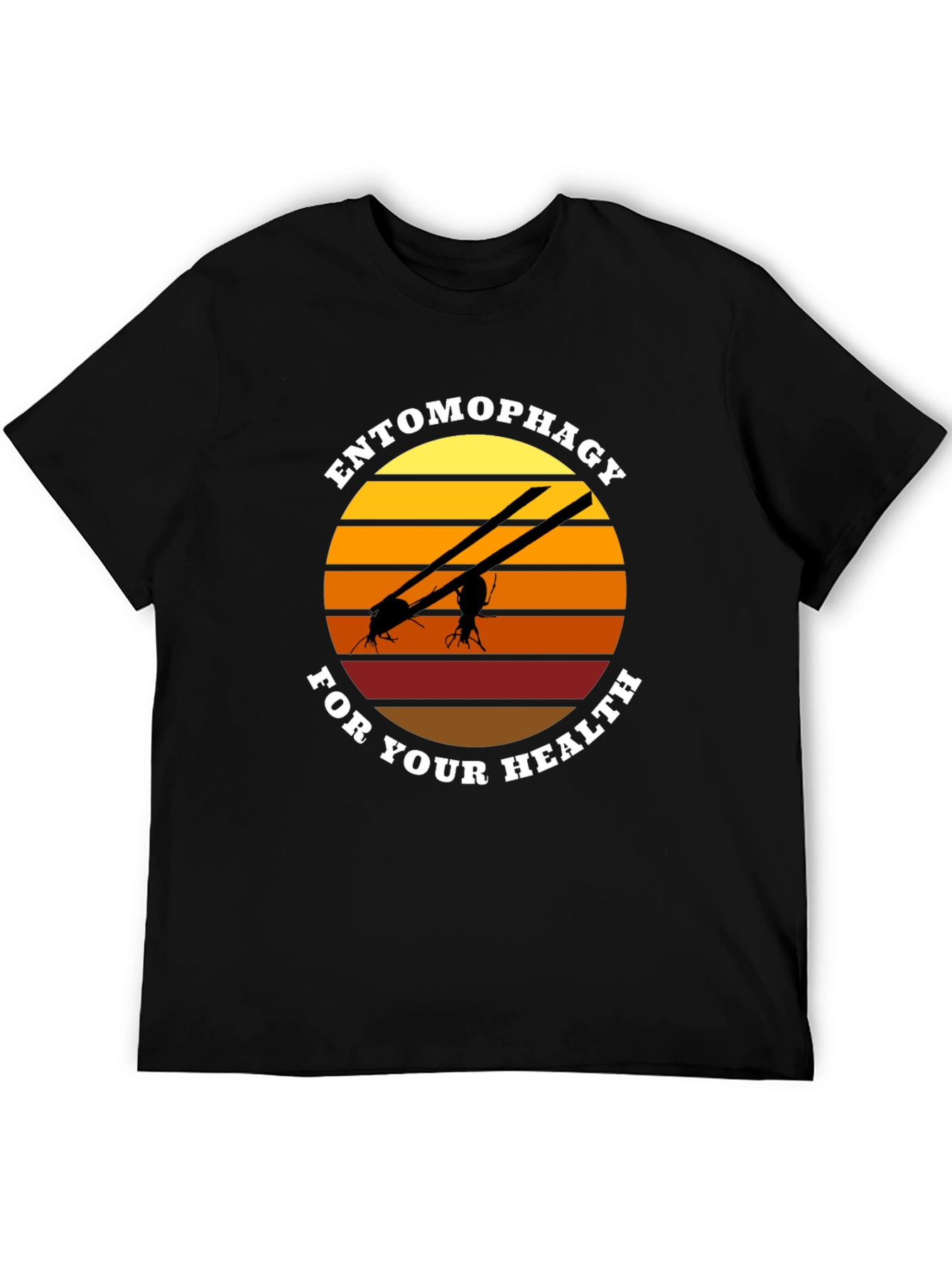 Luce esta original camiseta negra con un diseño llamativo y provocador. Presenta un círculo con franjas que evocan un atardecer, dentro del cual se aprecian dos insectos siendo 'apuñalados' por cuchillos. La frase "ENTOMOPHAGY FOR YOUR HEALTH" (Entomofagia para tu salud) rodea el círculo, creando un mensaje audaz y que invita a la reflexión sobre la alimentación con insectos. Ideal para quienes tienen un sentido del humor particular, gustan de diseños únicos y apoyan la entomofagia como alternativa alimenticia sostenible. Fabricada con materiales cómodos y duraderos, perfecta para uso casual y destacar en cualquier reunión.