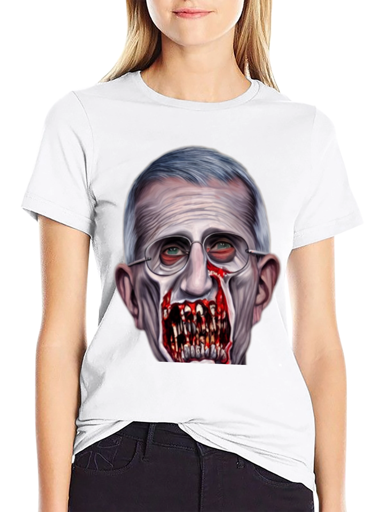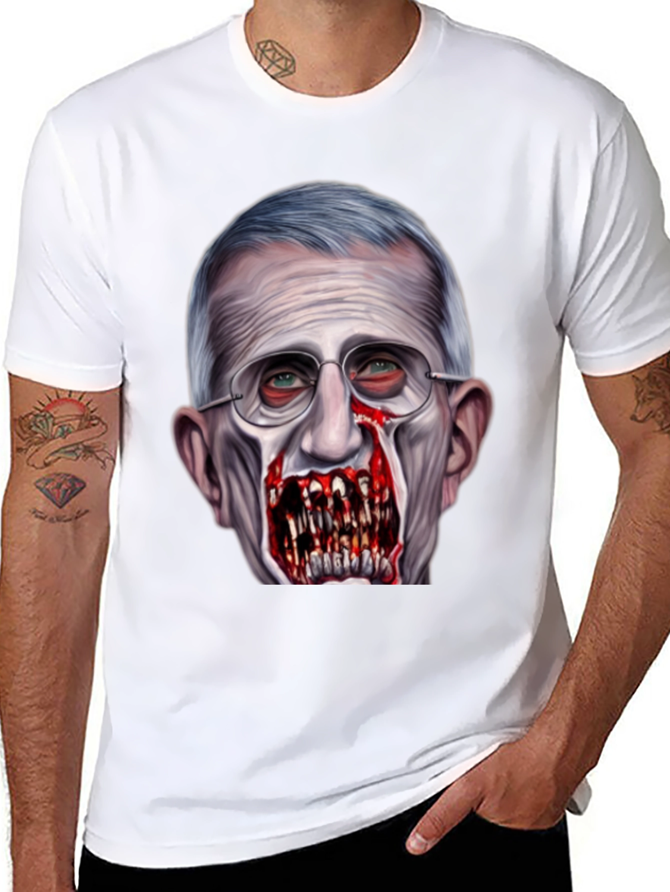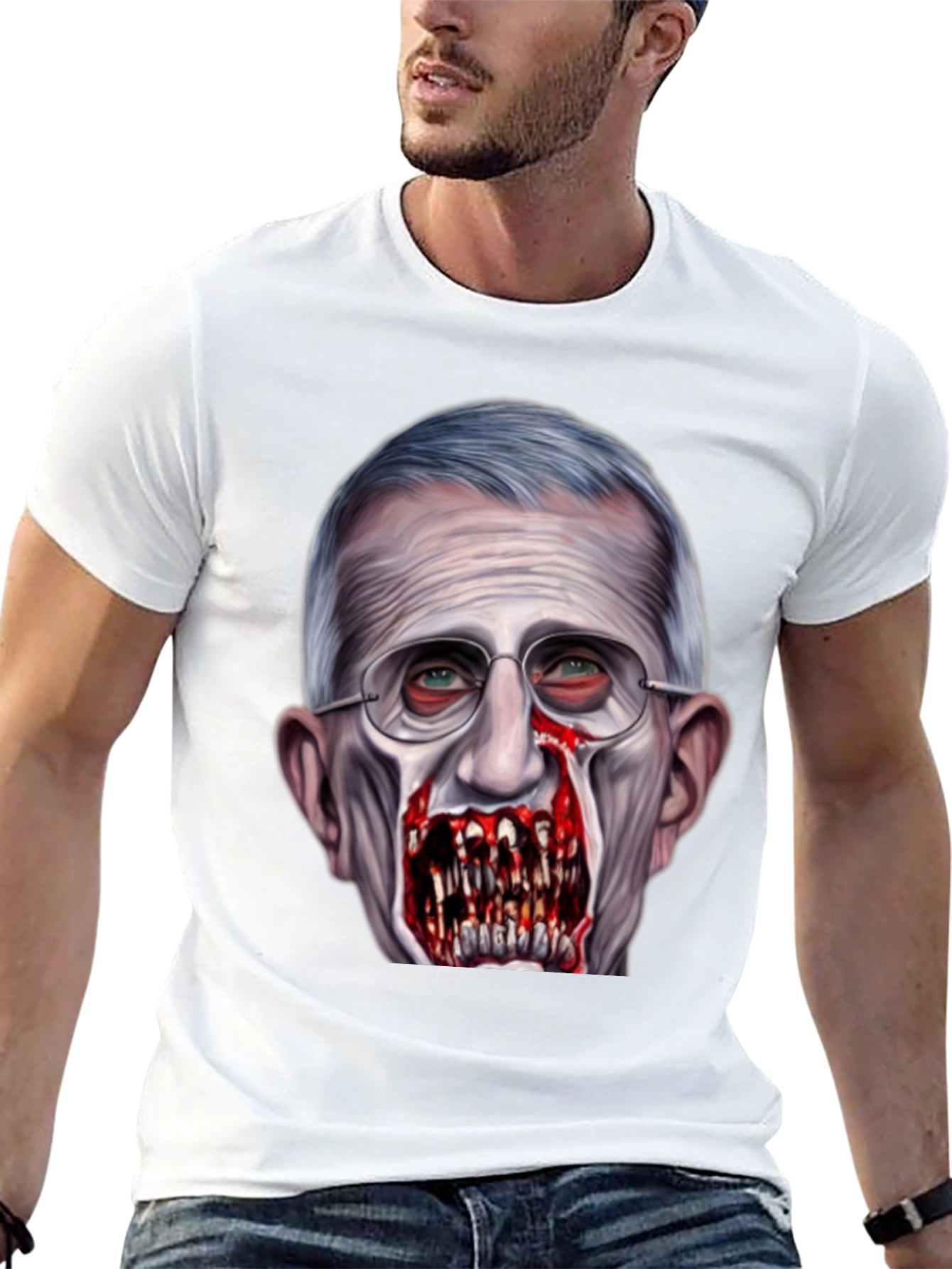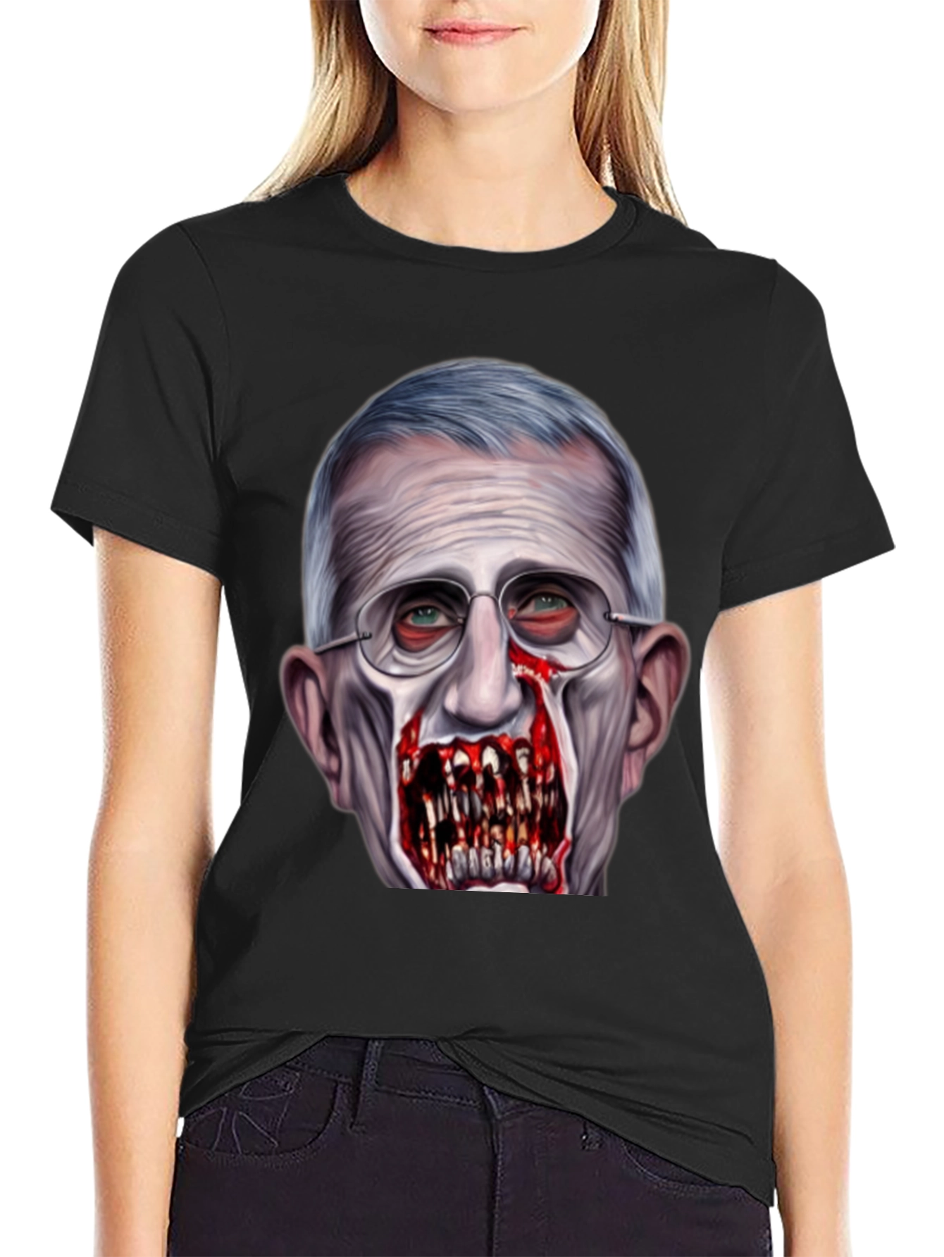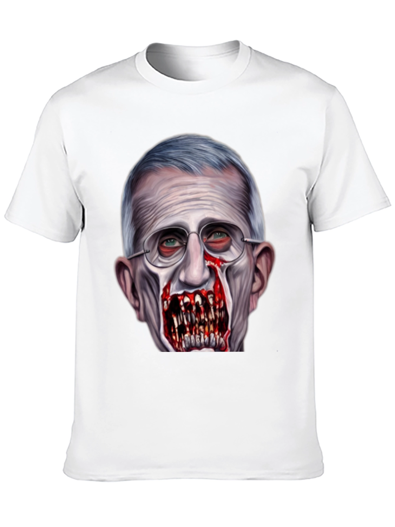 Luce esta camiseta negra con un diseño impactante de Anthony Fauci transformado en zombi. La impresión de alta calidad captura detalles escalofriantes, desde los ojos inyectados en sangre hasta los dientes afilados y sangrientos. Perfecta para aquellos con un sentido del humor audaz y un gusto por lo inusual. Confeccionada con materiales cómodos y duraderos, esta camiseta es ideal para destacar en eventos, fiestas temáticas o simplemente para expresar tu estilo único. ¡Atrévete a llevar un diseño que no pasará desapercibido!