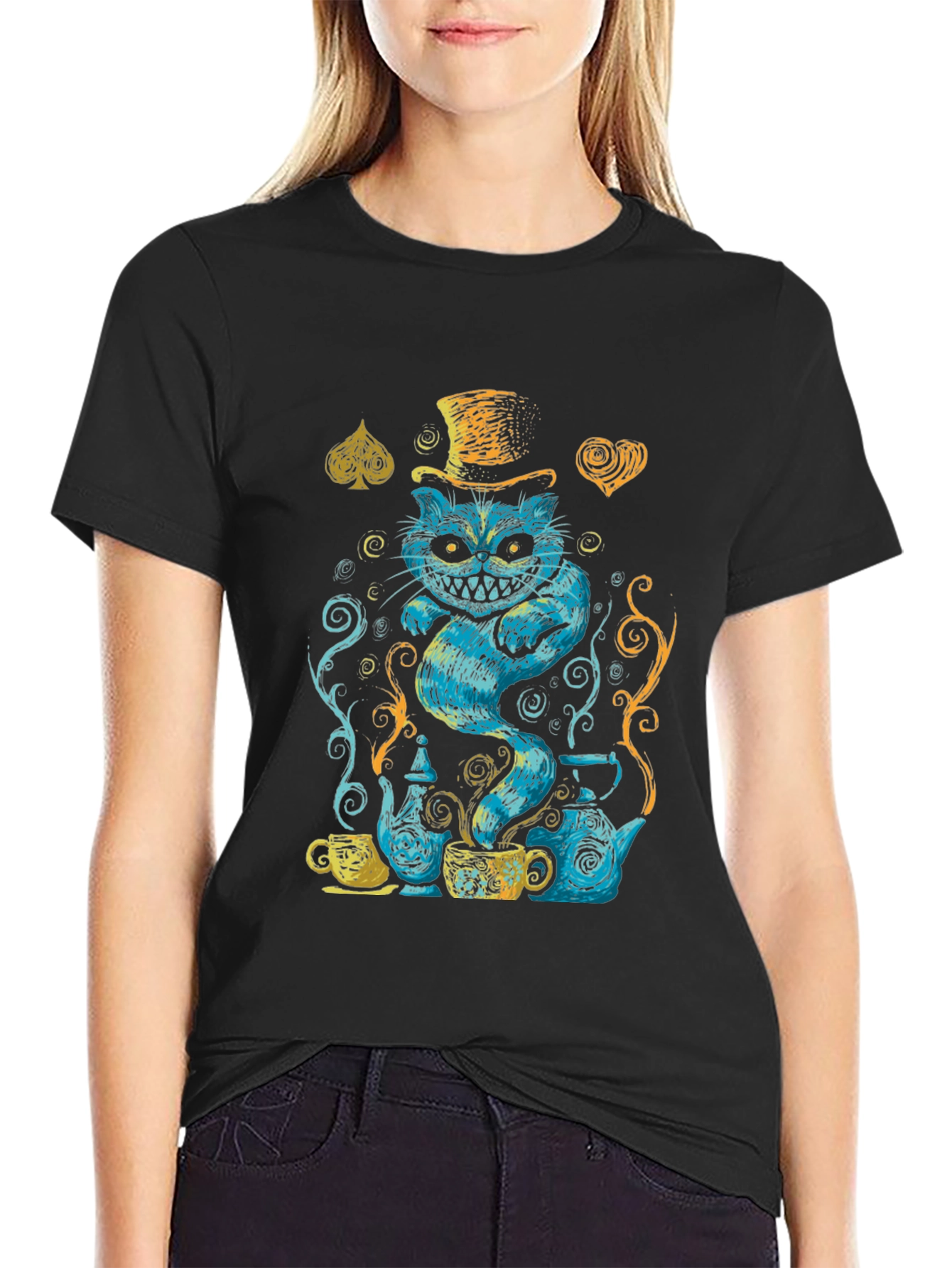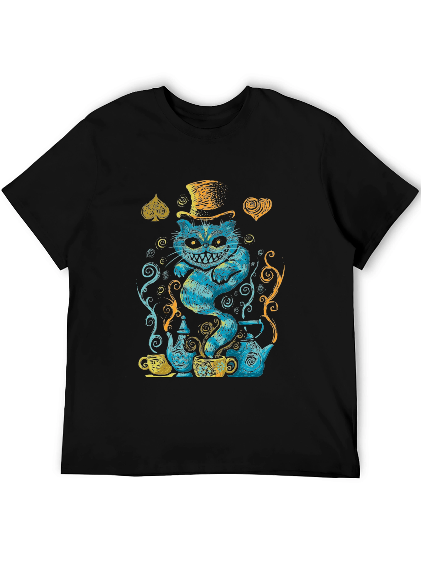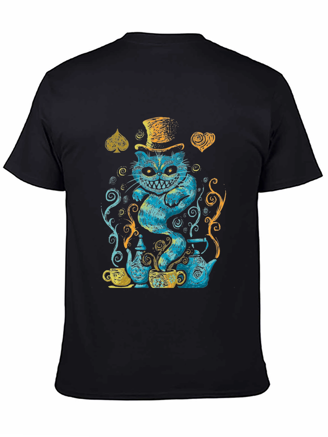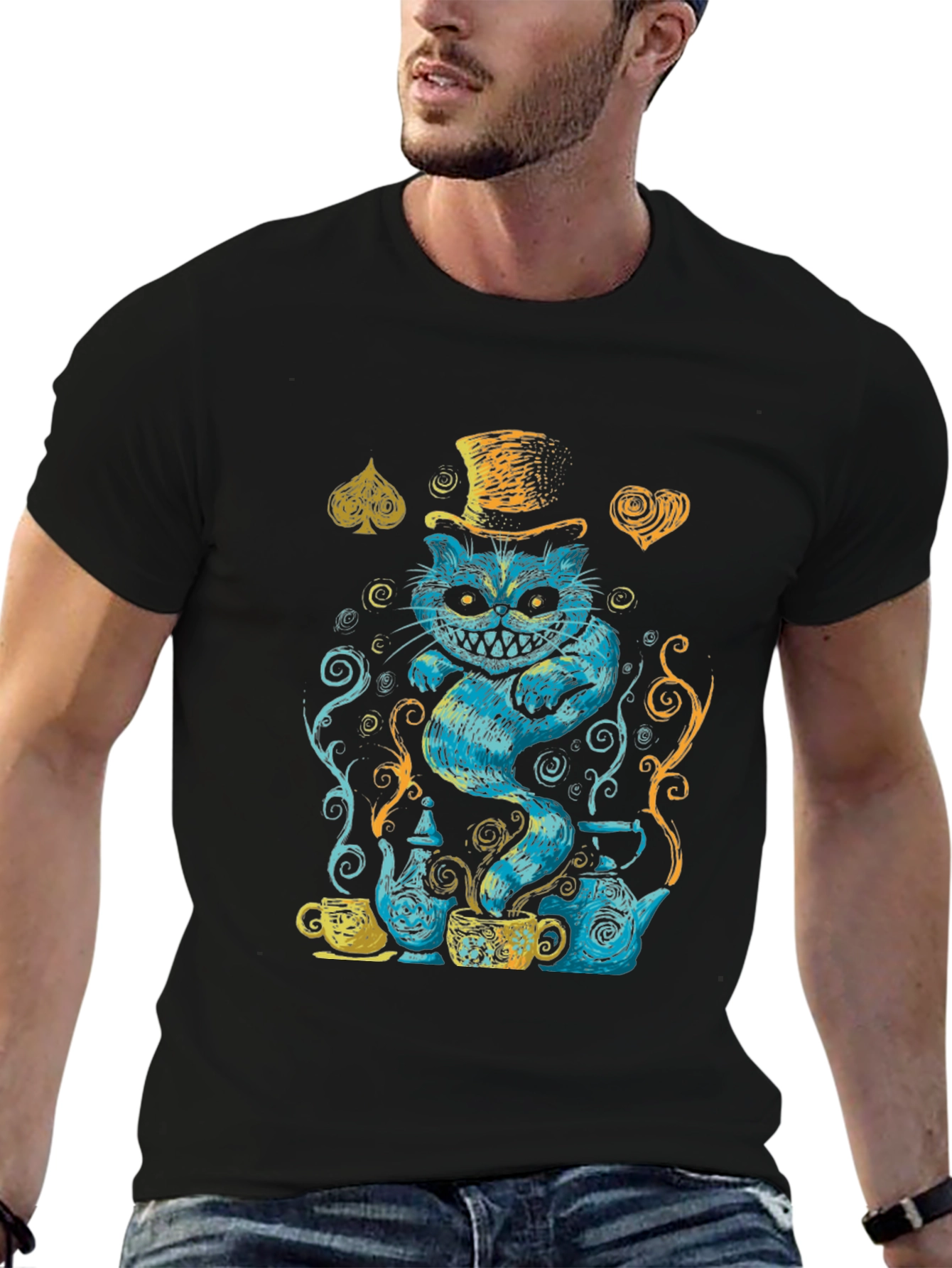 Luce esta original camiseta negra con un diseño único del Gato Cheshire como Sombrerero Loco. El vibrante estampado en tonos azules y dorados presenta al icónico personaje rodeado de tazas y teteras, creando una atmósfera mágica y misteriosa. Perfecta para los amantes de Alicia en el País de las Maravillas y aquellos que buscan una prenda llamativa y con personalidad. Ideal para llevar en tu día a día, destacar en eventos especiales o como un regalo original para un fanático de la fantasía. ¡Una prenda que no pasará desapercibida!