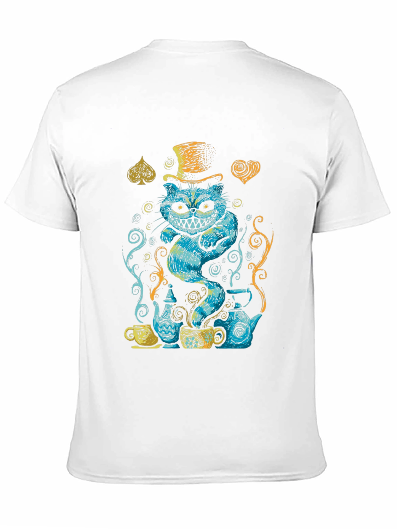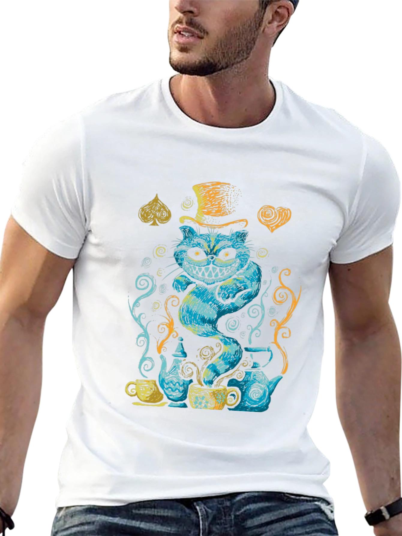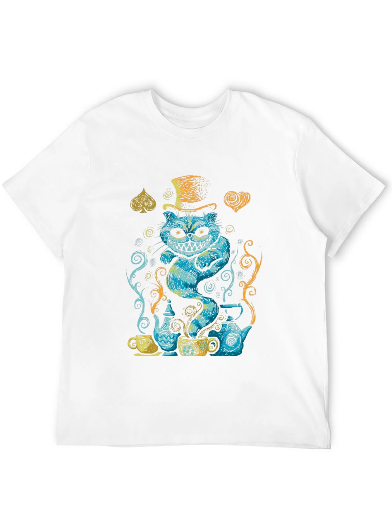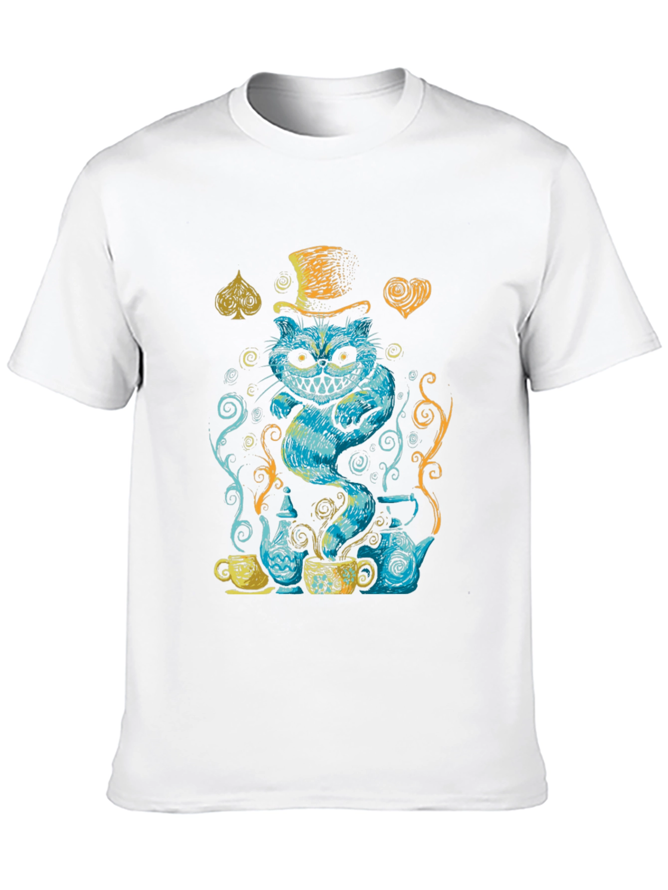 Luce esta original camiseta negra con un diseño único del Gato Cheshire como Sombrerero Loco. El vibrante estampado en tonos azules y dorados presenta al icónico personaje rodeado de tazas y teteras, creando una atmósfera mágica y misteriosa. Perfecta para los amantes de Alicia en el País de las Maravillas y aquellos que buscan una prenda llamativa y con personalidad. Ideal para llevar en tu día a día, destacar en eventos especiales o como un regalo original para un fanático de la fantasía. ¡Una prenda que no pasará desapercibida!