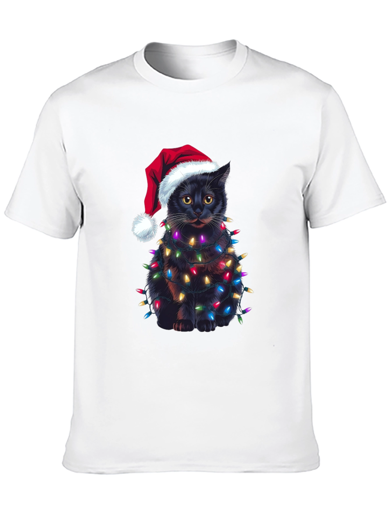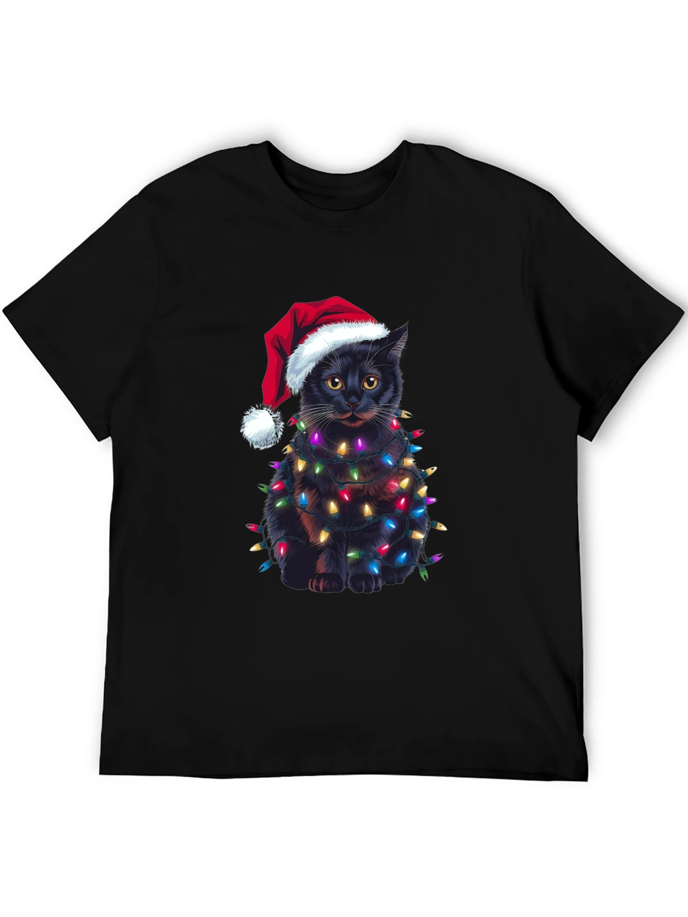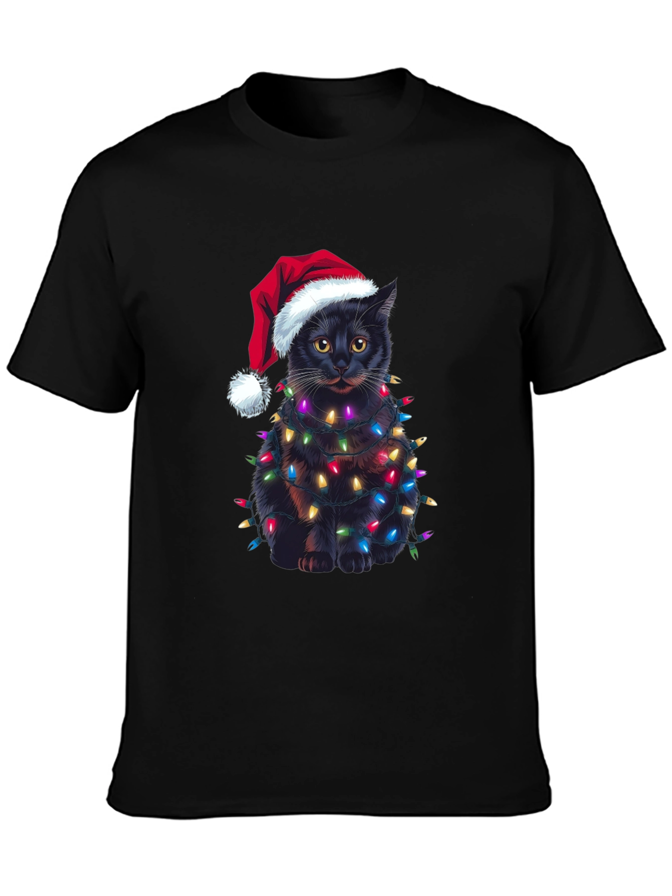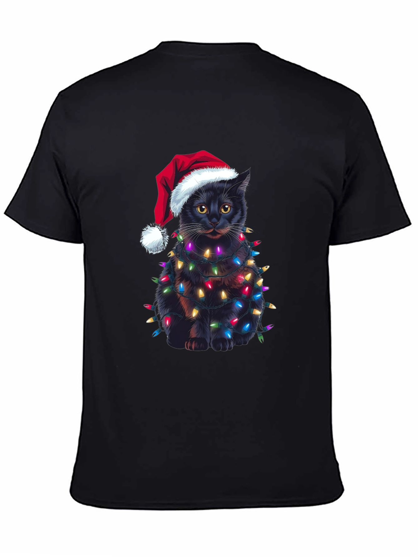Celebra la Navidad con estilo y humor con esta original camiseta. Presenta un adorable gato negro envuelto en brillantes luces navideñas y luciendo un gorro de Papá Noel. El diseño impreso destaca sobre el fondo negro de la camiseta, creando un look festivo y llamativo. Confeccionada en un material suave y cómodo, esta camiseta es perfecta para llevar en las fiestas navideñas, reuniones familiares o simplemente para contagiar el espíritu navideño a donde vayas. Es una excelente opción de regalo para los amantes de los gatos y la Navidad. ¡Consigue la tuya y añade un toque de alegría a tus festividades!