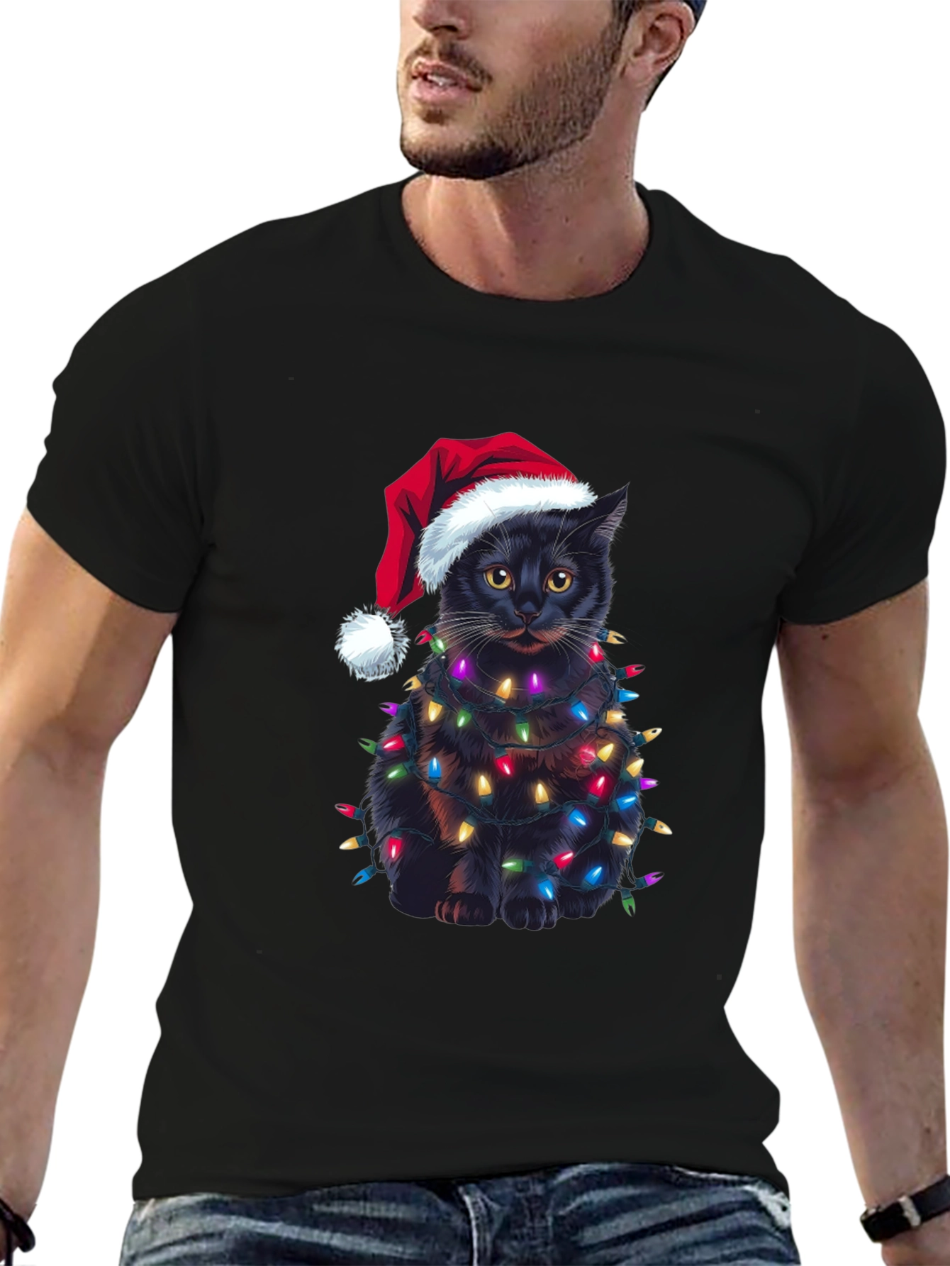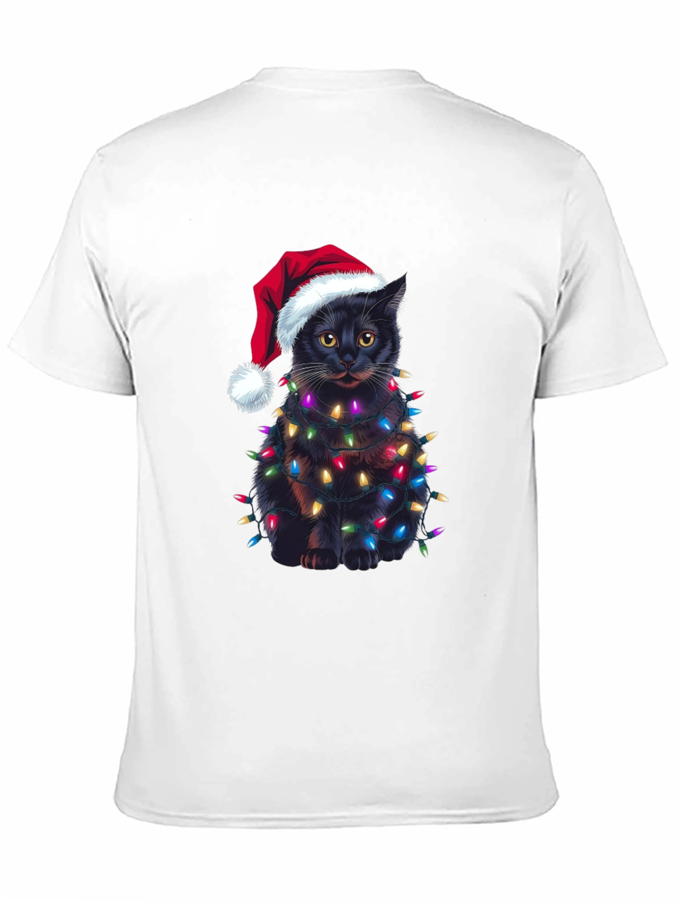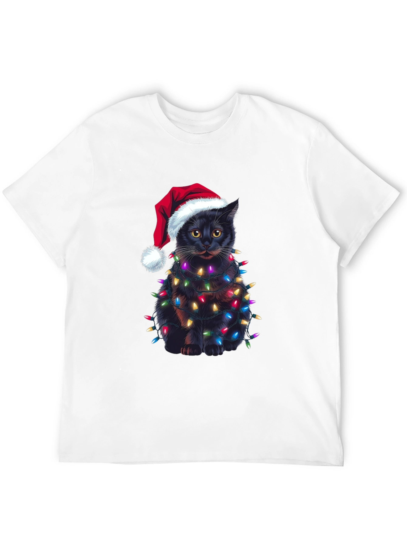 Celebra la Navidad con estilo y humor con esta original camiseta. Presenta un adorable gato negro envuelto en brillantes luces navideñas y luciendo un gorro de Papá Noel. El diseño impreso destaca sobre el fondo negro de la camiseta, creando un look festivo y llamativo. Confeccionada en un material suave y cómodo, esta camiseta es perfecta para llevar en las fiestas navideñas, reuniones familiares o simplemente para contagiar el espíritu navideño a donde vayas. Es una excelente opción de regalo para los amantes de los gatos y la Navidad. ¡Consigue la tuya y añade un toque de alegría a tus festividades!
