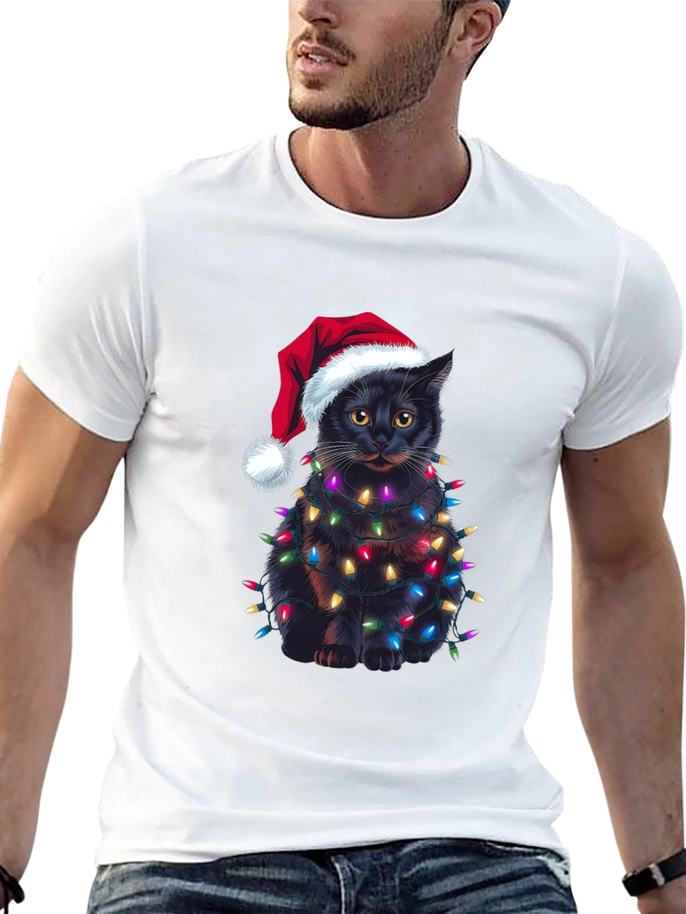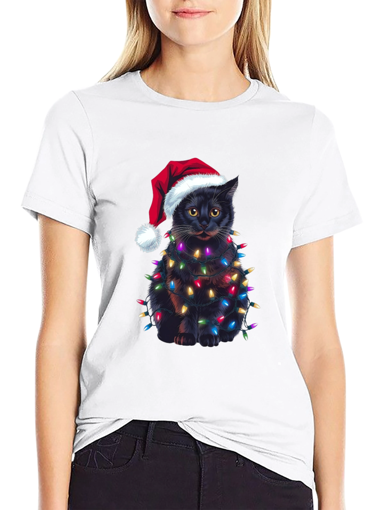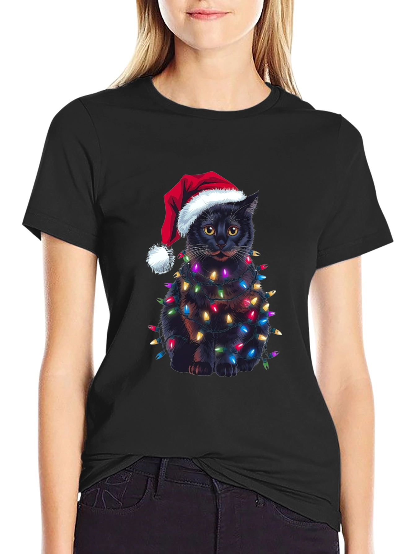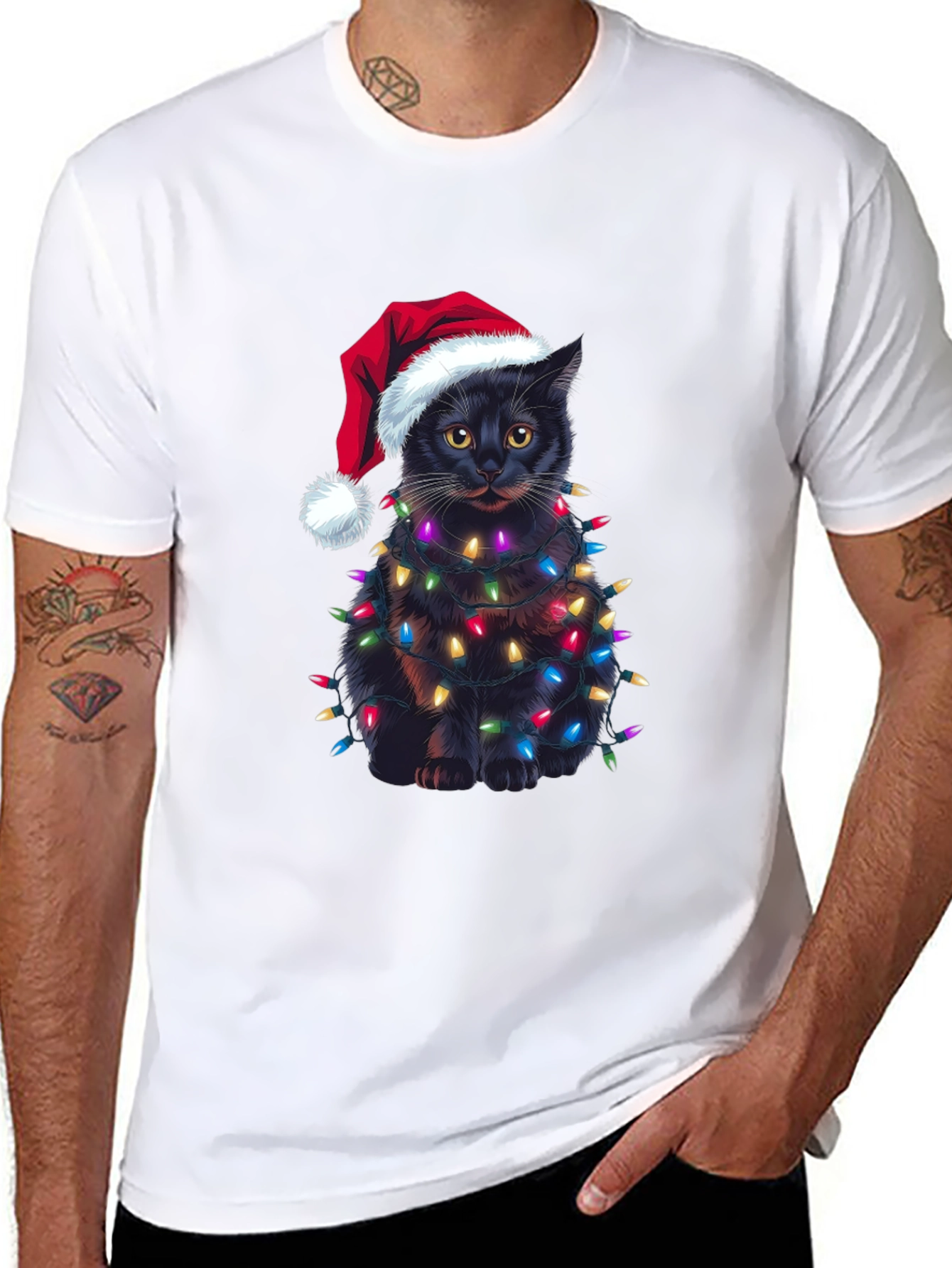 Celebra la Navidad con estilo y humor con esta original camiseta. Presenta un adorable gato negro envuelto en brillantes luces navideñas y luciendo un gorro de Papá Noel. El diseño impreso destaca sobre el fondo negro de la camiseta, creando un look festivo y llamativo. Confeccionada en un material suave y cómodo, esta camiseta es perfecta para llevar en las fiestas navideñas, reuniones familiares o simplemente para contagiar el espíritu navideño a donde vayas. Es una excelente opción de regalo para los amantes de los gatos y la Navidad. ¡Consigue la tuya y añade un toque de alegría a tus festividades!