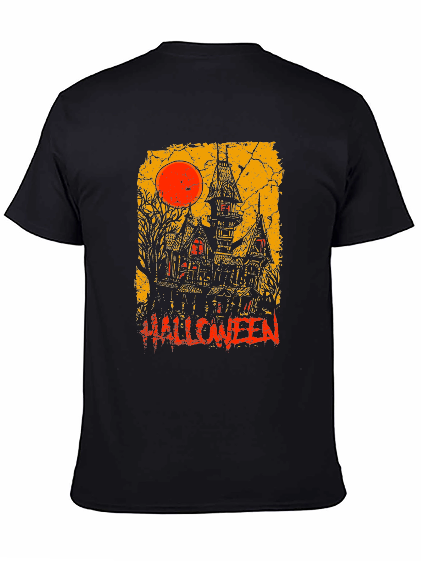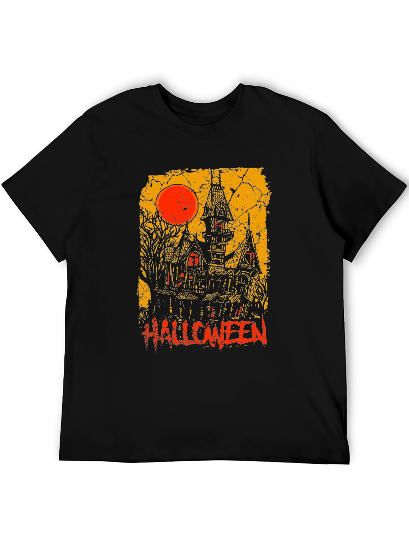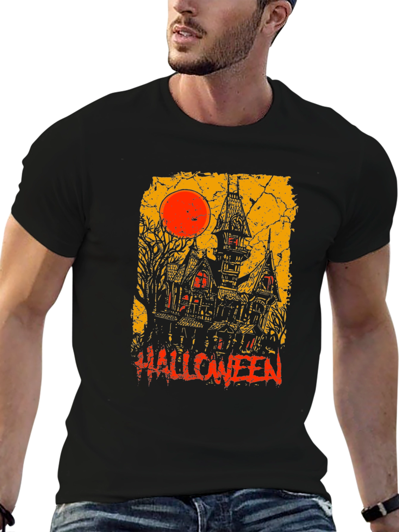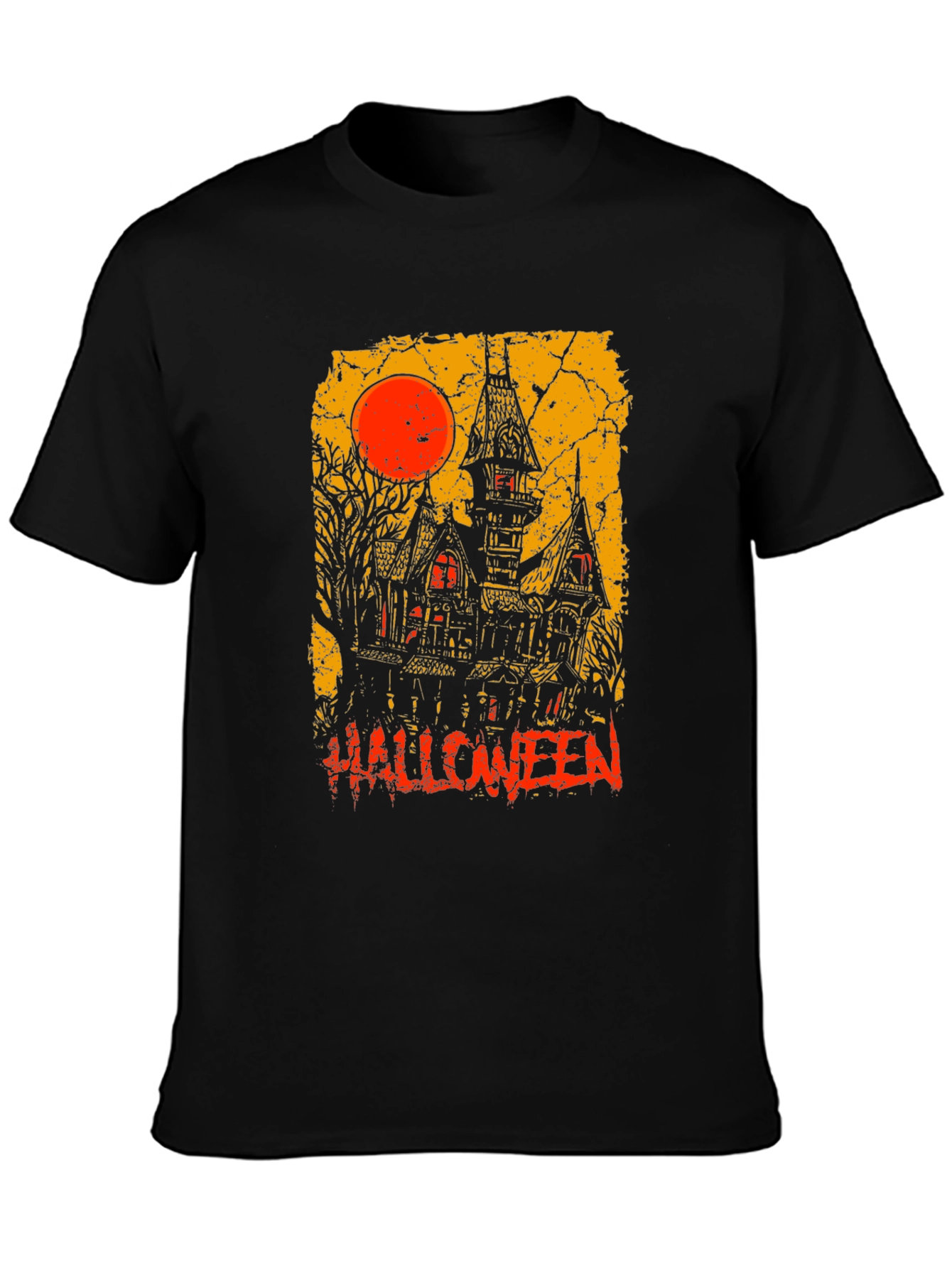 ¡Prepárate para Halloween con esta increíble camiseta de manga corta! Presenta un diseño llamativo de una casa embrujada con una luna roja de fondo, todo sobre un marco amarillo texturizado que le da un toque retro y espeluznante. Perfecta para llevar a fiestas de disfraces, pedir dulces o simplemente para mostrar tu espíritu de Halloween con estilo. Fabricada en un material suave y cómodo, esta camiseta negra es ideal para cualquier fanático de Halloween. ¡Añade un toque de terror a tu armario y destaca entre la multitud!