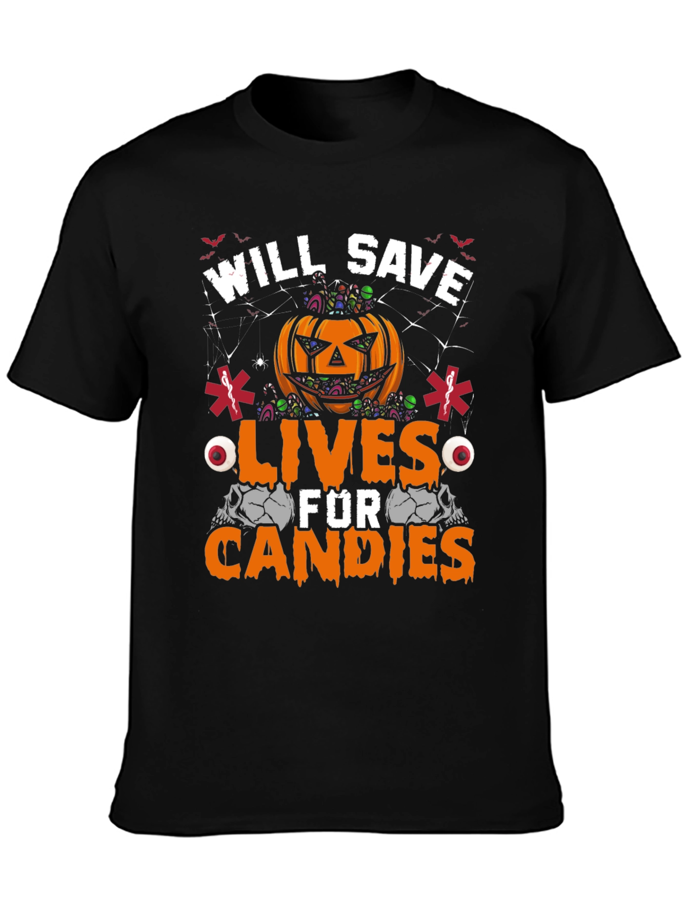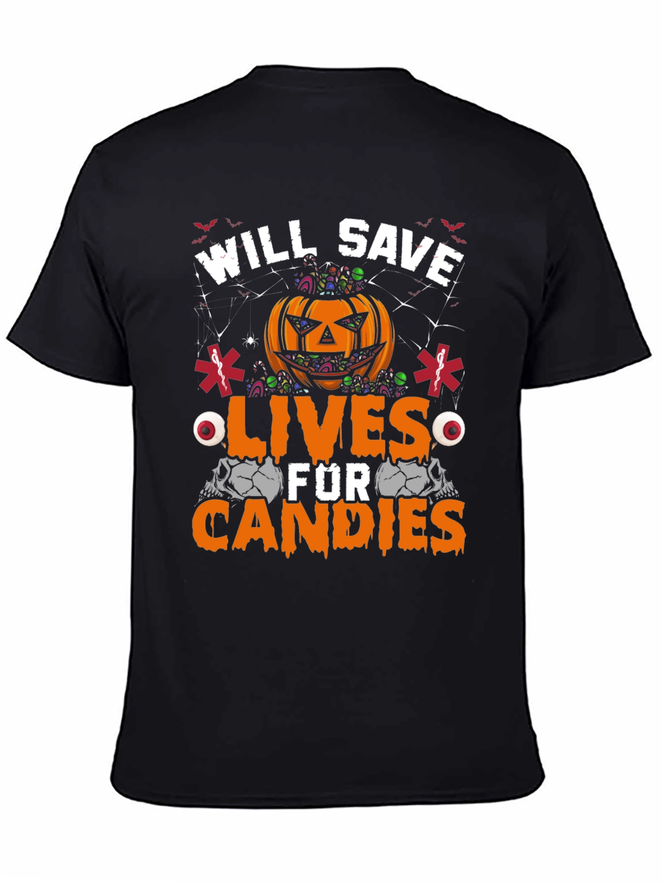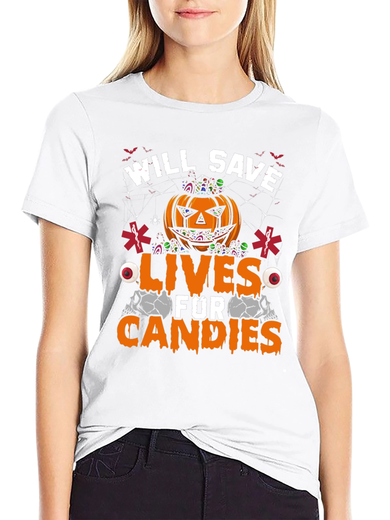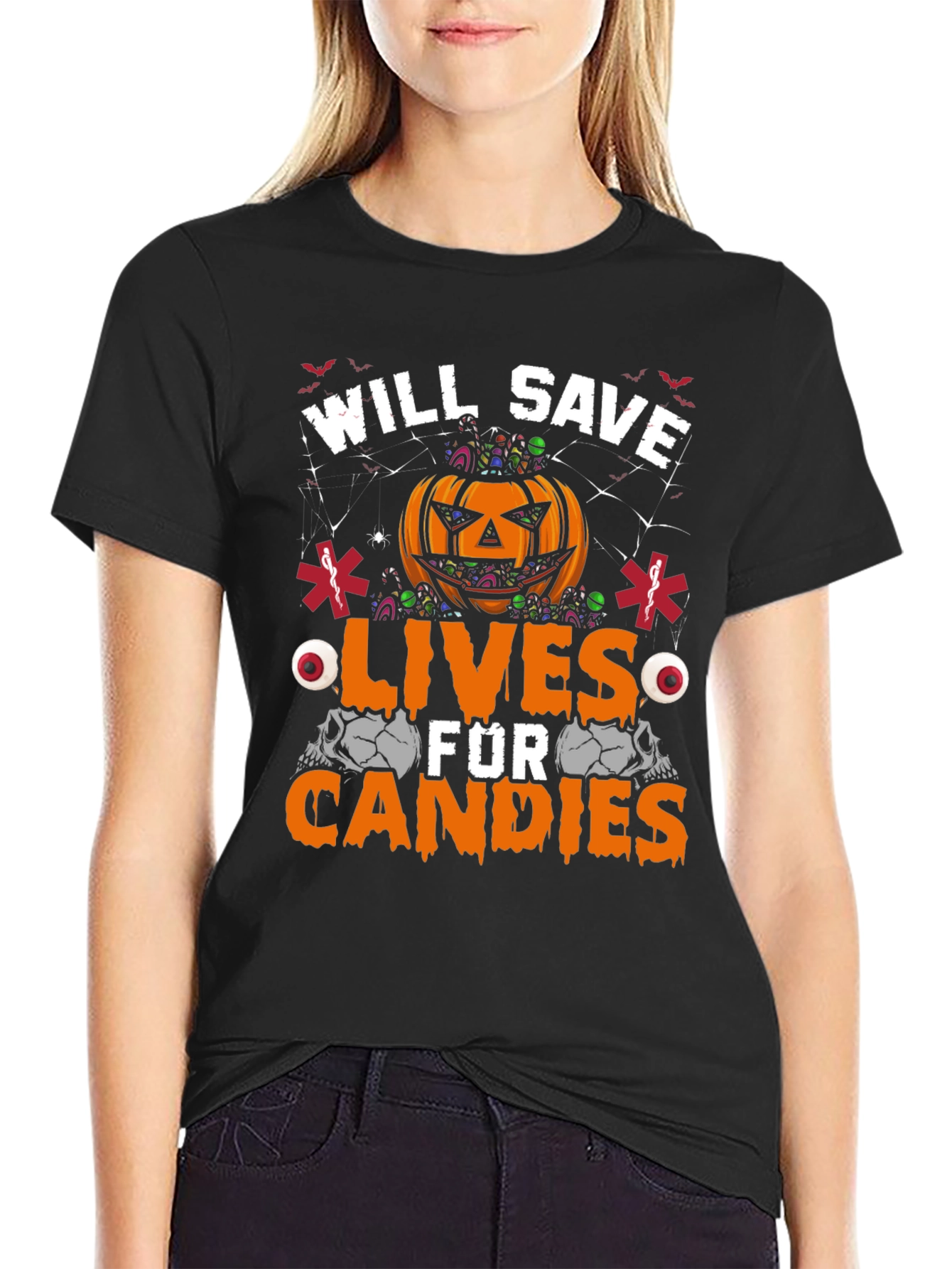 Celebra Halloween con esta divertida camiseta de paramédico. De color negro, presenta un diseño llamativo con una calabaza llena de caramelos y la frase "Will Save Lives For Candies" (Salvaré vidas por dulces). Ideal para fiestas de Halloween, eventos temáticos o simplemente para mostrar tu sentido del humor. El diseño incluye motivos alusivos a la profesión de paramédico, como estrellas de la vida y ojos saltones, junto con calaveras. Una prenda cómoda y original para los amantes de Halloween y profesionales de la salud.