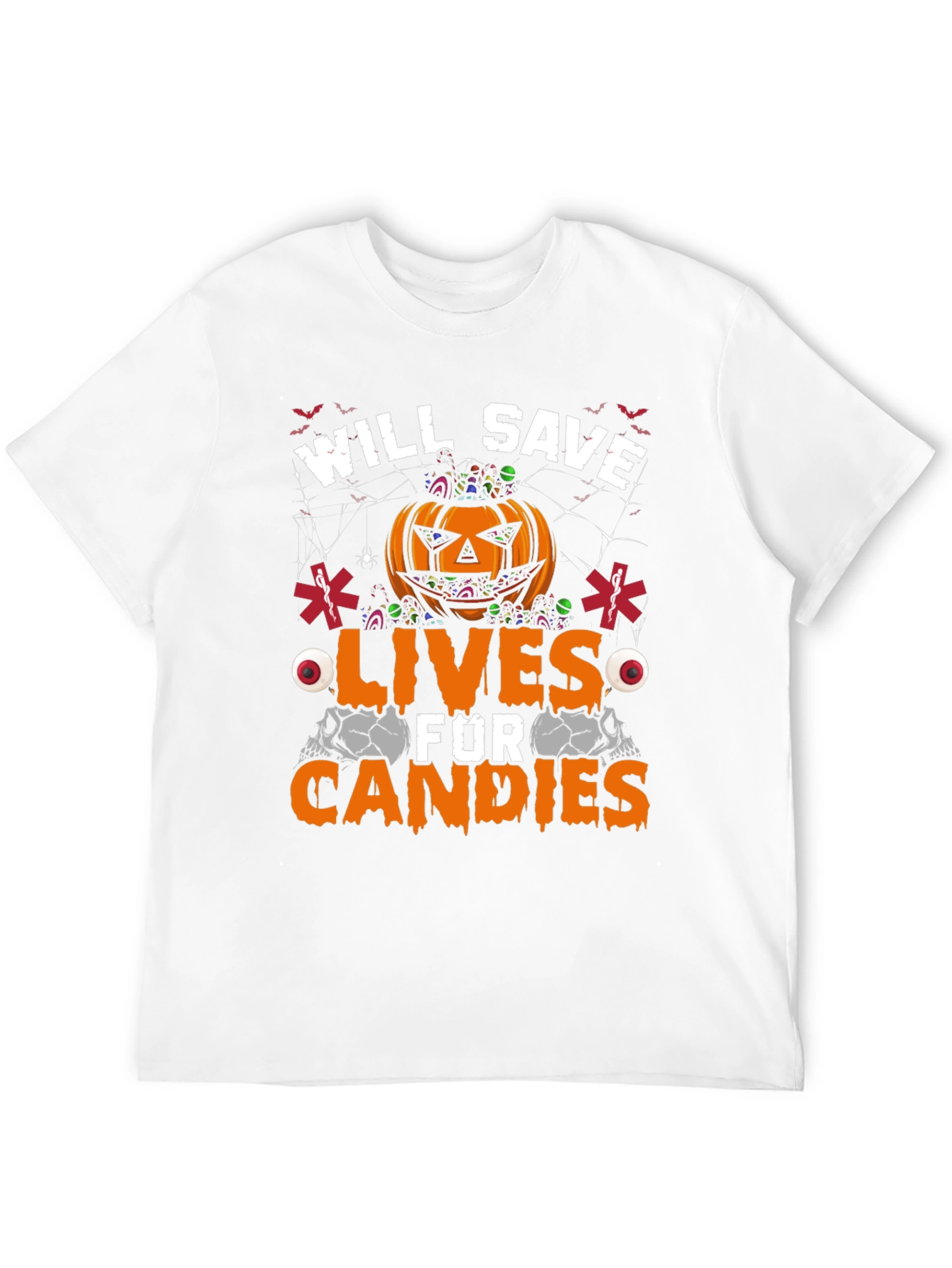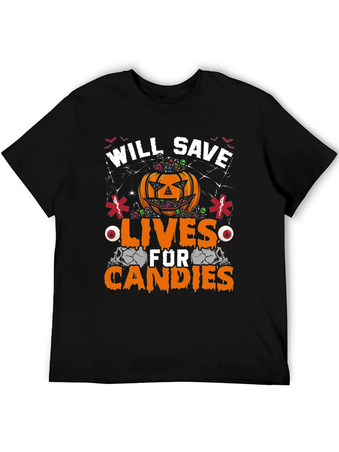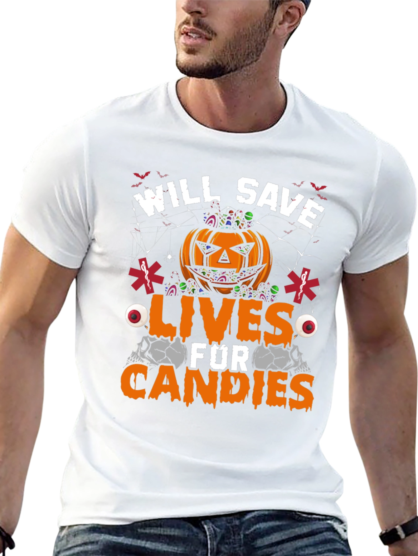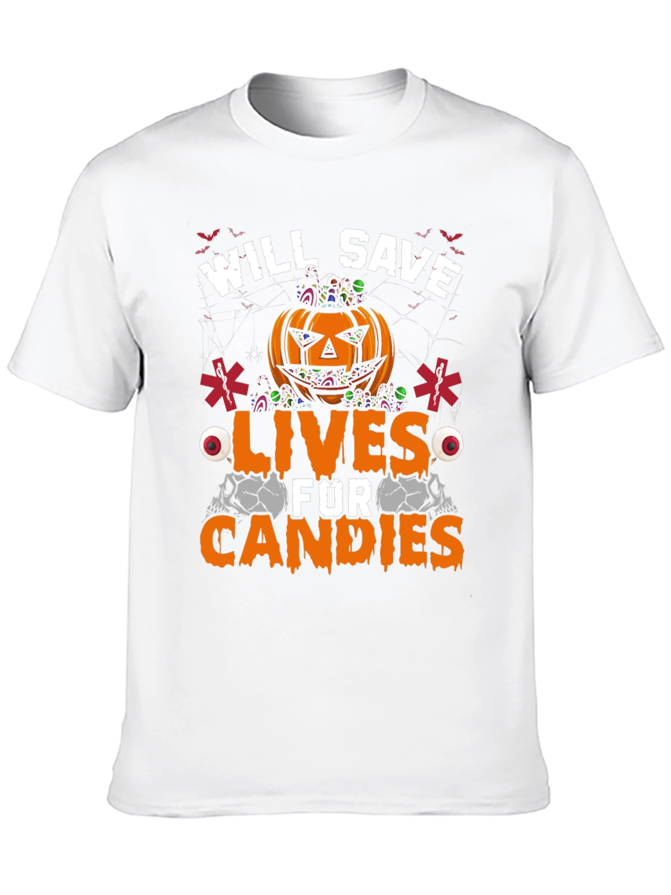 Celebra Halloween con esta divertida camiseta de paramédico. De color negro, presenta un diseño llamativo con una calabaza llena de caramelos y la frase "Will Save Lives For Candies" (Salvaré vidas por dulces). Ideal para fiestas de Halloween, eventos temáticos o simplemente para mostrar tu sentido del humor. El diseño incluye motivos alusivos a la profesión de paramédico, como estrellas de la vida y ojos saltones, junto con calaveras. Una prenda cómoda y original para los amantes de Halloween y profesionales de la salud.