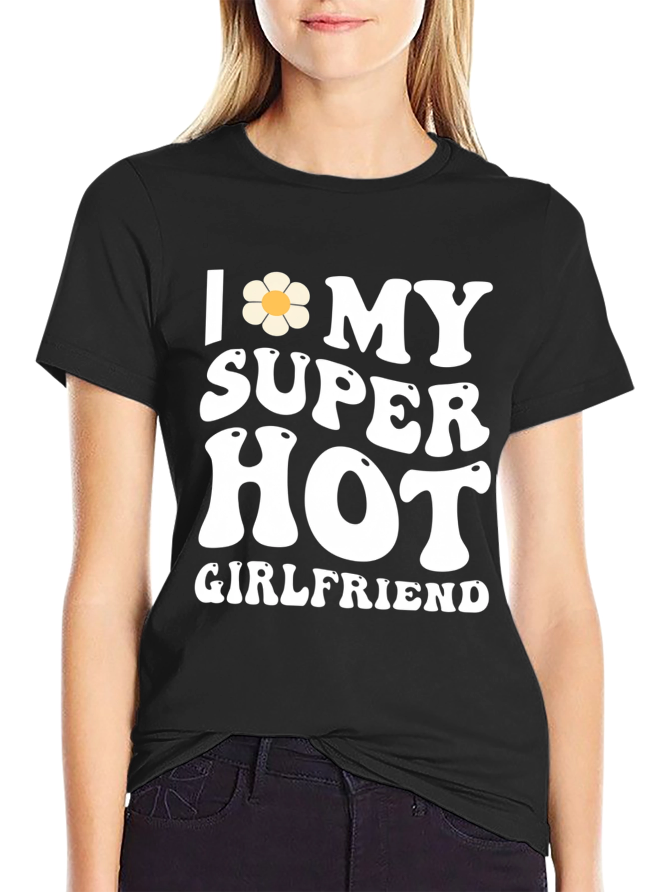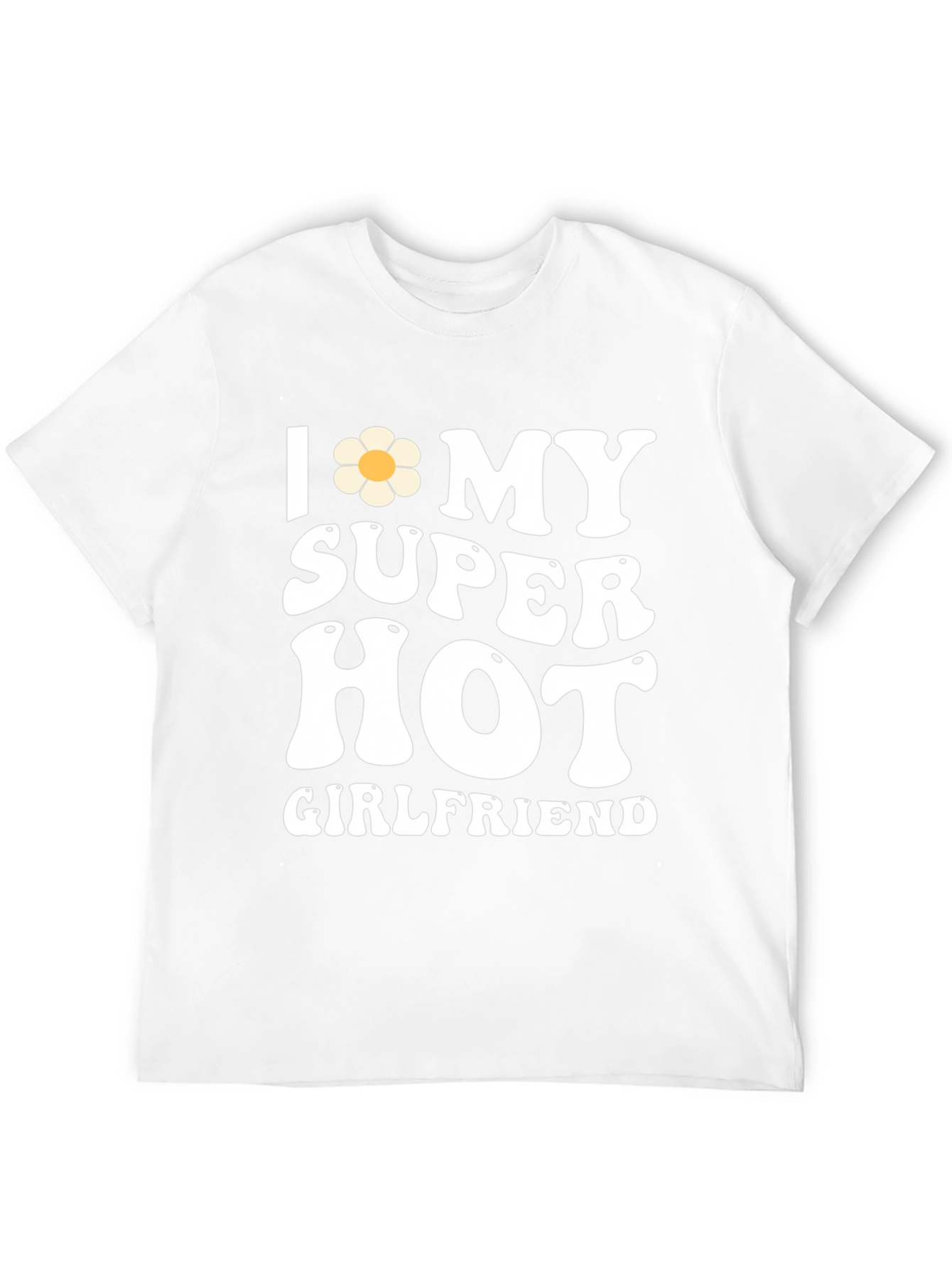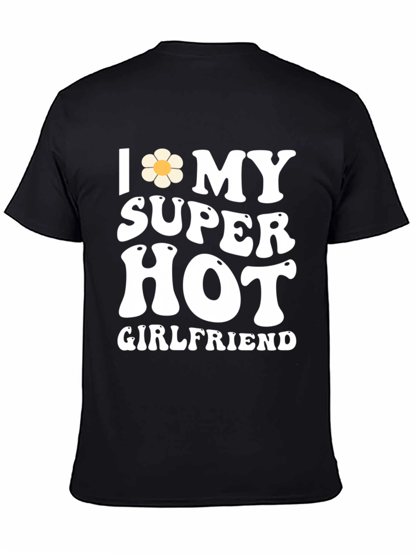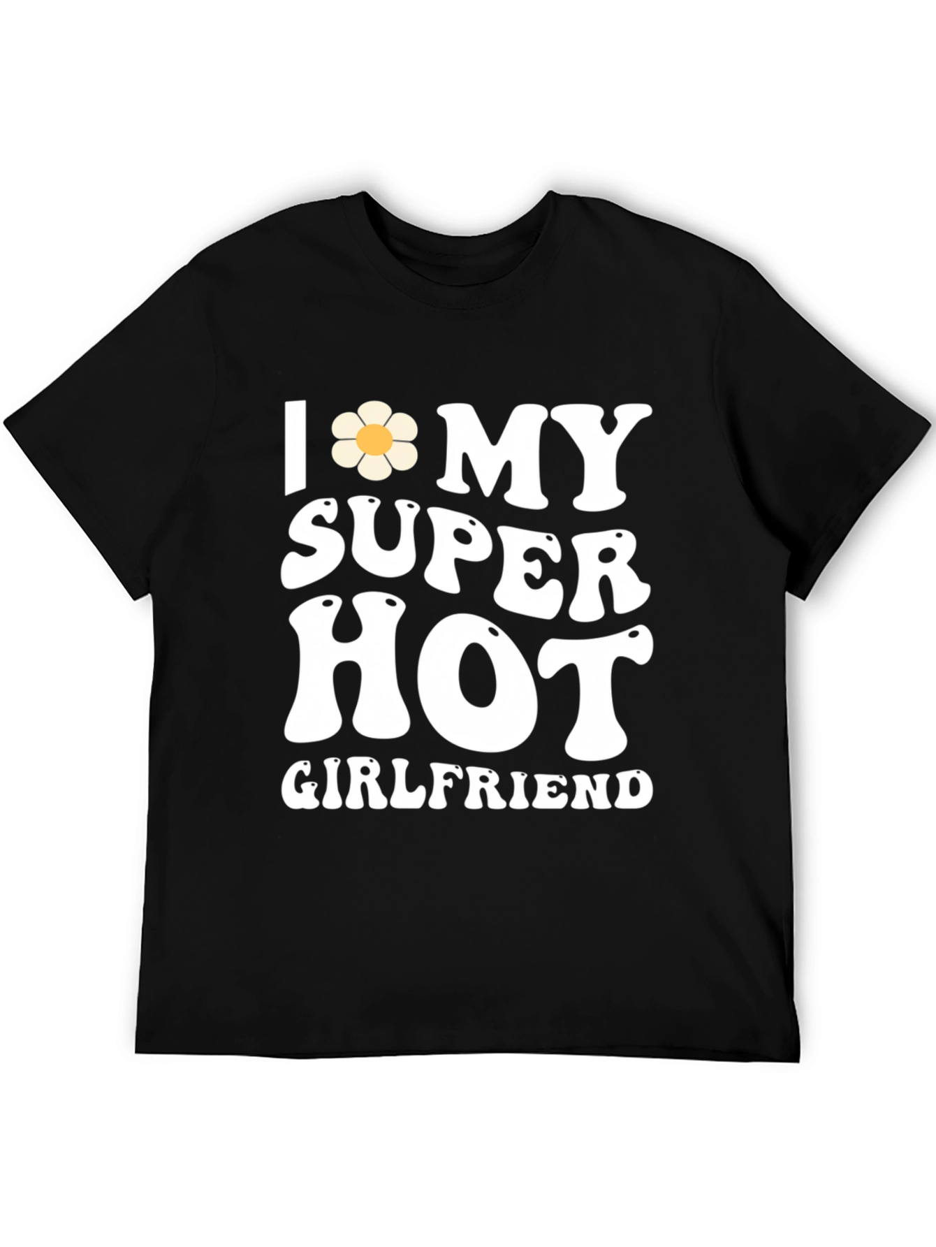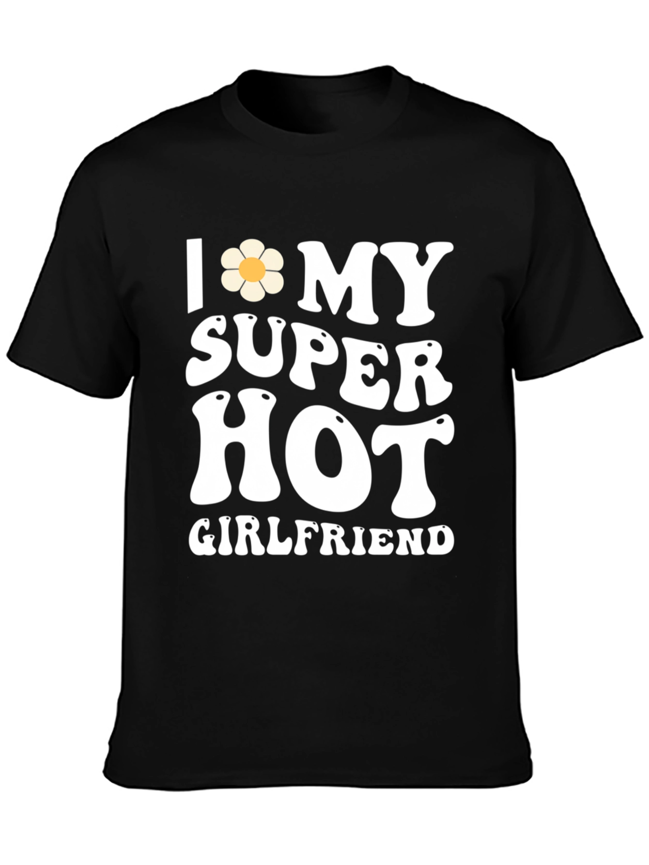 Esta camiseta negra para hombre expresa un afecto audaz y divertido. Presenta una declaración llamativa en letras blancas de estilo retro que dice "I [flor] MY SUPER HOT GIRLFRIEND", donde una margarita estilizada sustituye al corazón. La camiseta parece estar hecha de un material suave y cómodo, ideal para usar a diario. Es perfecta para hombres que desean mostrar su amor con un toque de humor y estilo. Úsala para salidas informales, fiestas o simplemente para relajarte en casa. ¡Deja que el mundo sepa lo orgulloso que estás de tu novia!