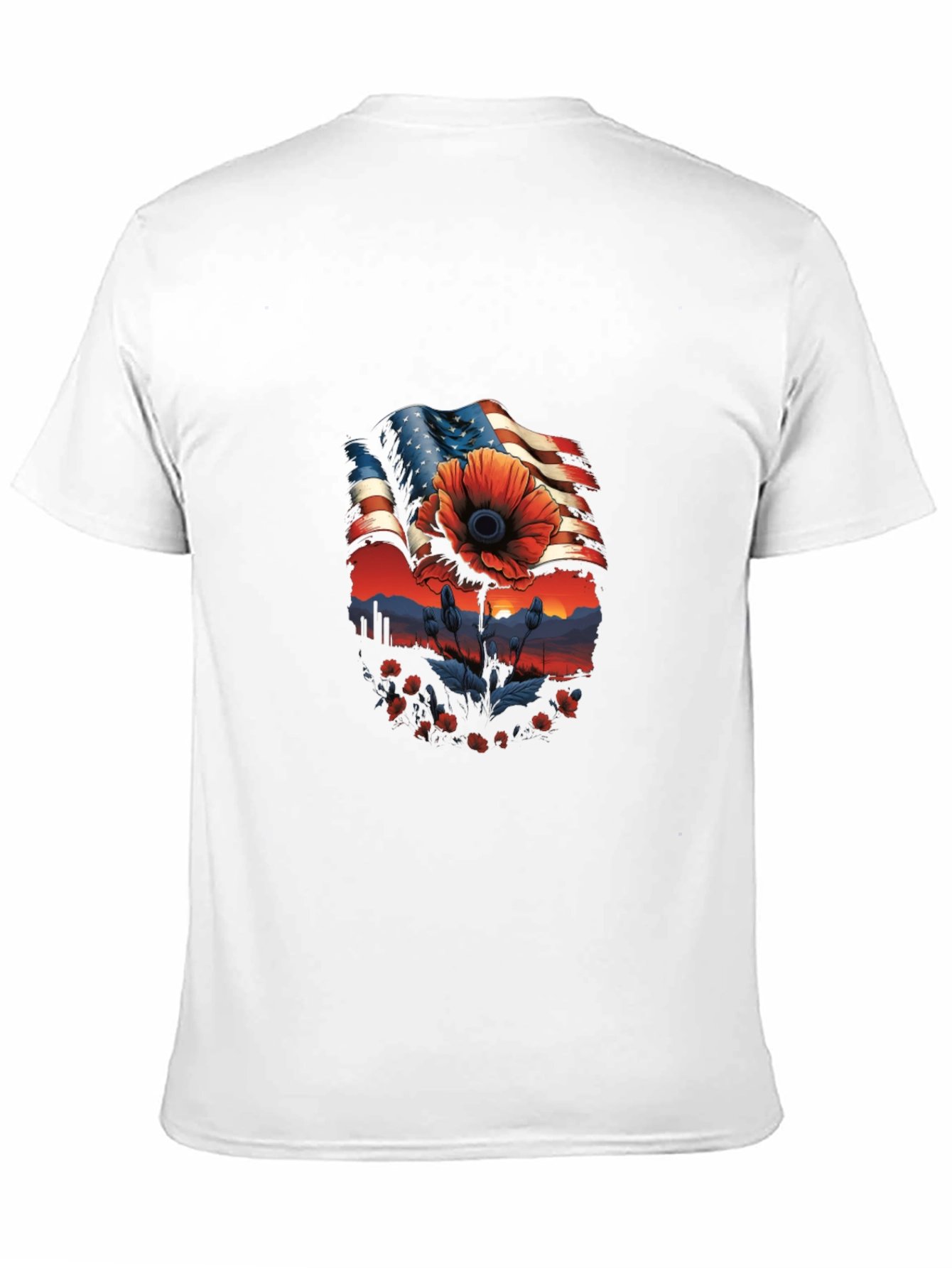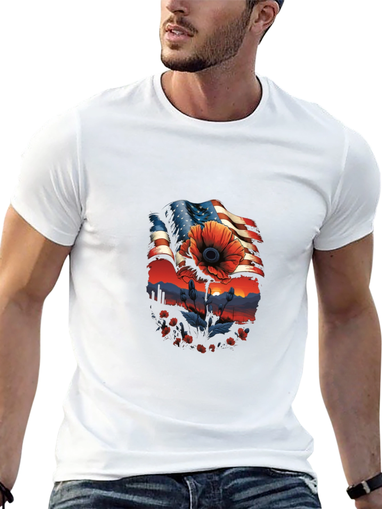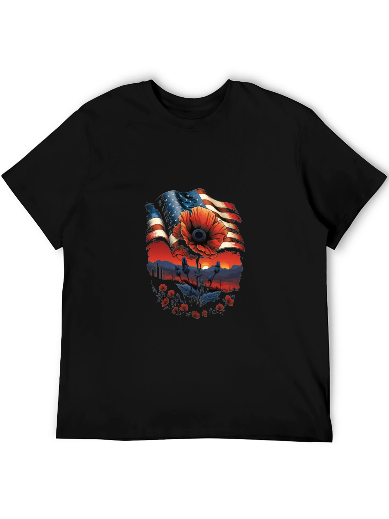 Luce con orgullo esta llamativa camiseta negra para hombre, adornada con un diseño único de la bandera estadounidense fusionada con una vibrante amapola. El diseño presenta colores intensos y detalles intrincados que capturan la esencia patriótica con un toque artístico. Perfecta para expresar tu estilo individual y amor por la libertad. Esta camiseta de manga corta, confeccionada en un tejido suave y cómodo, es ideal para cualquier ocasión casual, desde reuniones con amigos hasta eventos al aire libre. Combina fácilmente con jeans, pantalones cortos o joggers para un look relajado y a la moda. ¡Añade un toque de originalidad a tu guardarropa con esta prenda imprescindible!