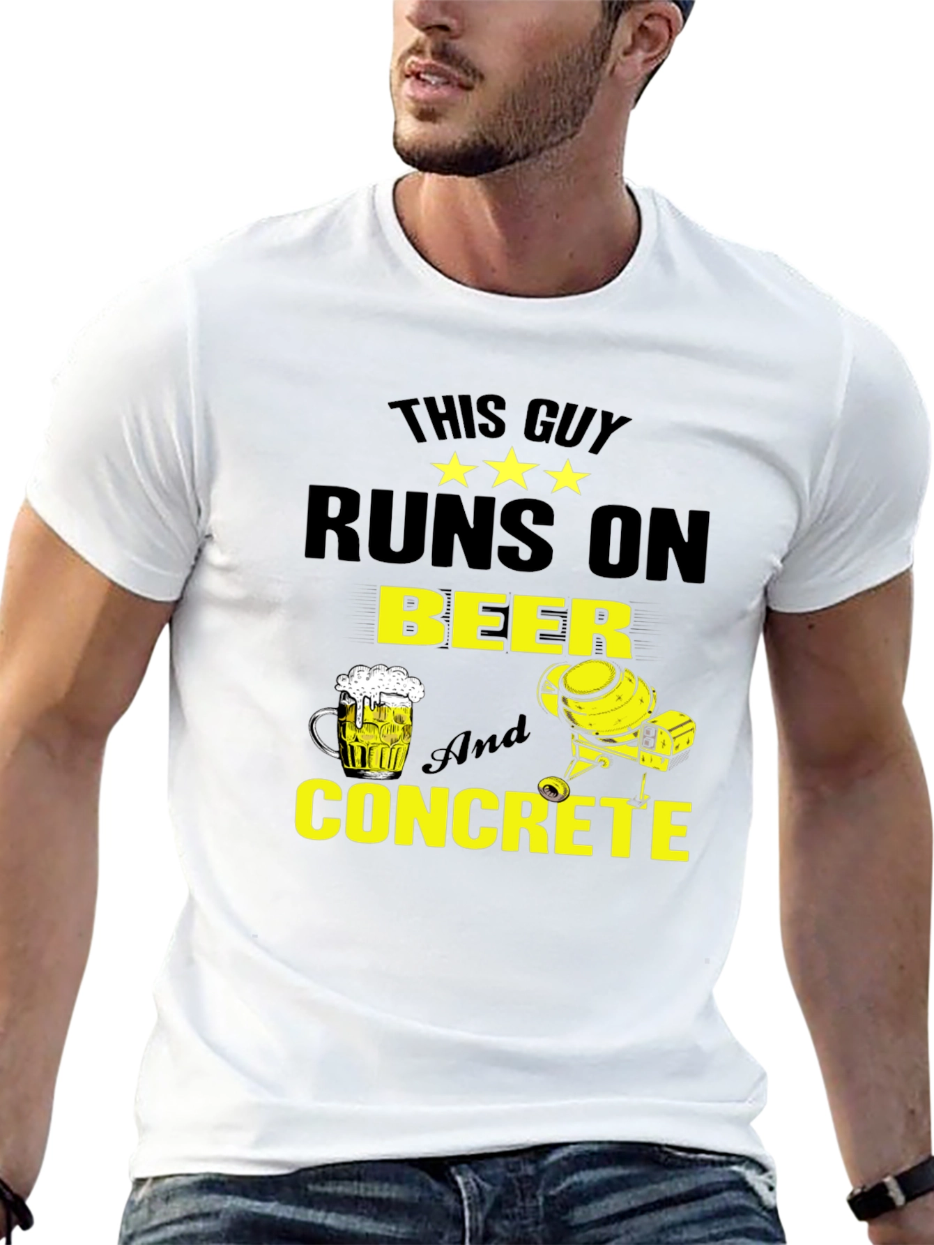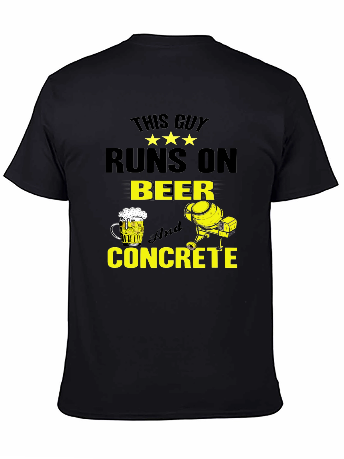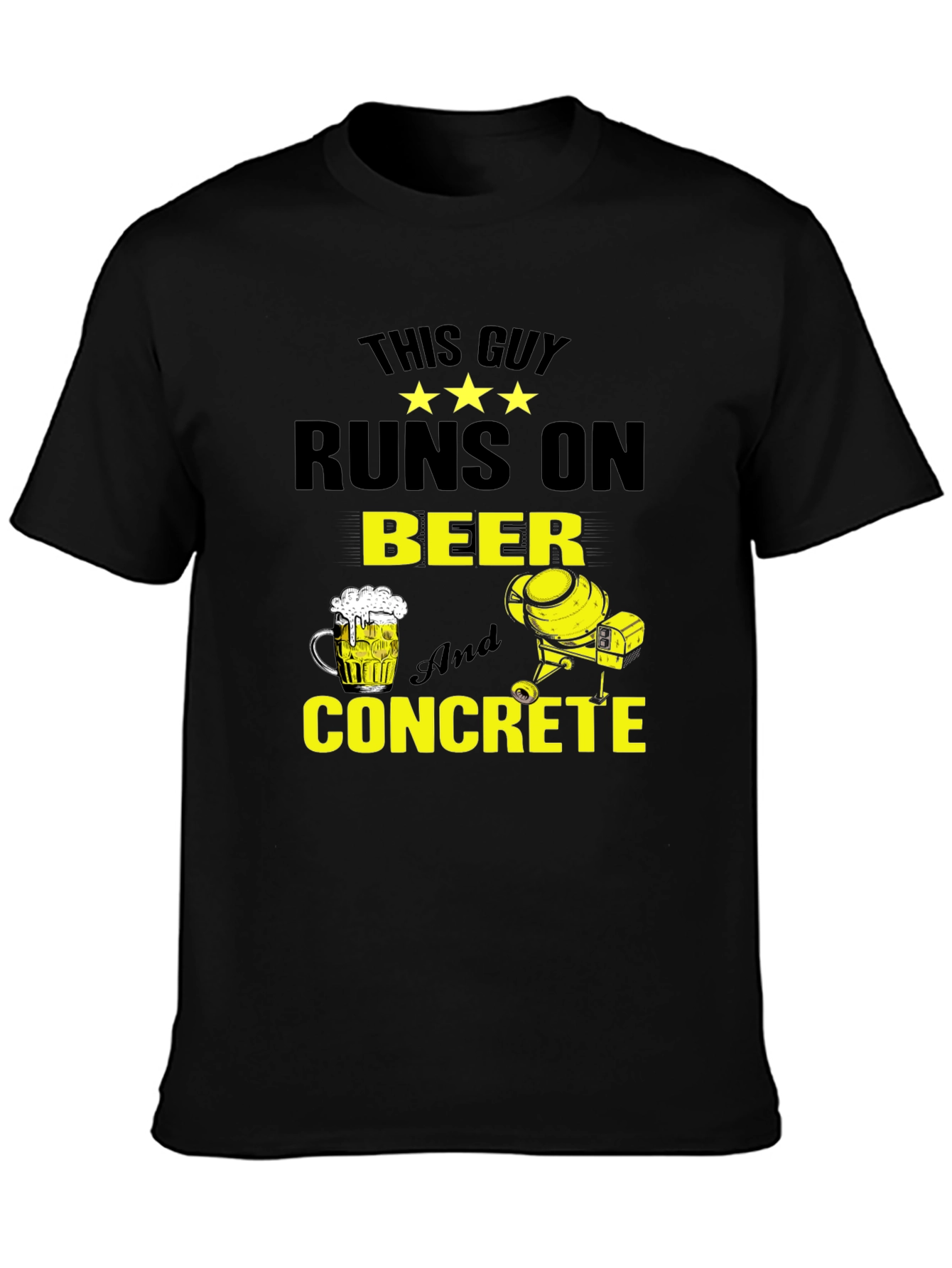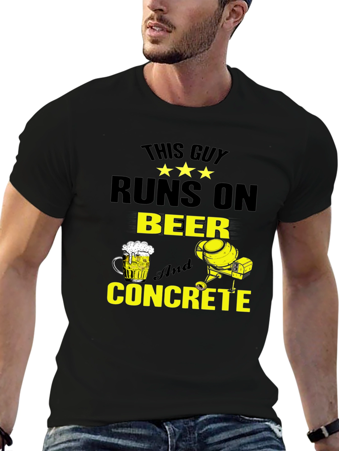 Esta camiseta negra para hombre presenta un diseño llamativo y divertido. El estampado, en tonos amarillos y negros, proclama "This Guy Runs on Beer and Concrete" (Este tipo funciona con cerveza y concreto), ideal para aquellos que disfrutan de una buena cerveza después de un día de trabajo duro. Una jarra de cerveza espumosa y un mezclador de concreto ilustran la frase, añadiendo un toque humorístico. Hecha de un material suave y cómodo, esta camiseta de manga corta es perfecta para usarla en un ambiente casual, ya sea en casa, en un bar con amigos, o incluso en el trabajo si el código de vestimenta lo permite. Es una excelente opción para expresar tu personalidad y sentido del humor.