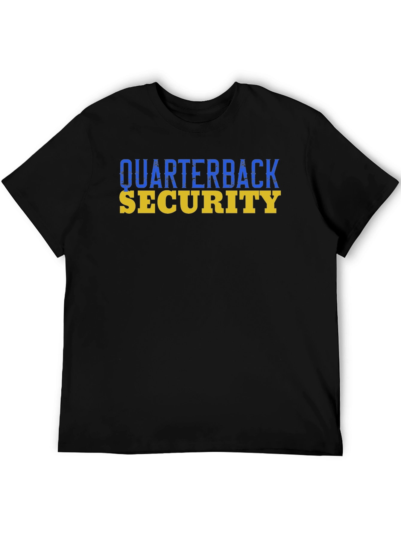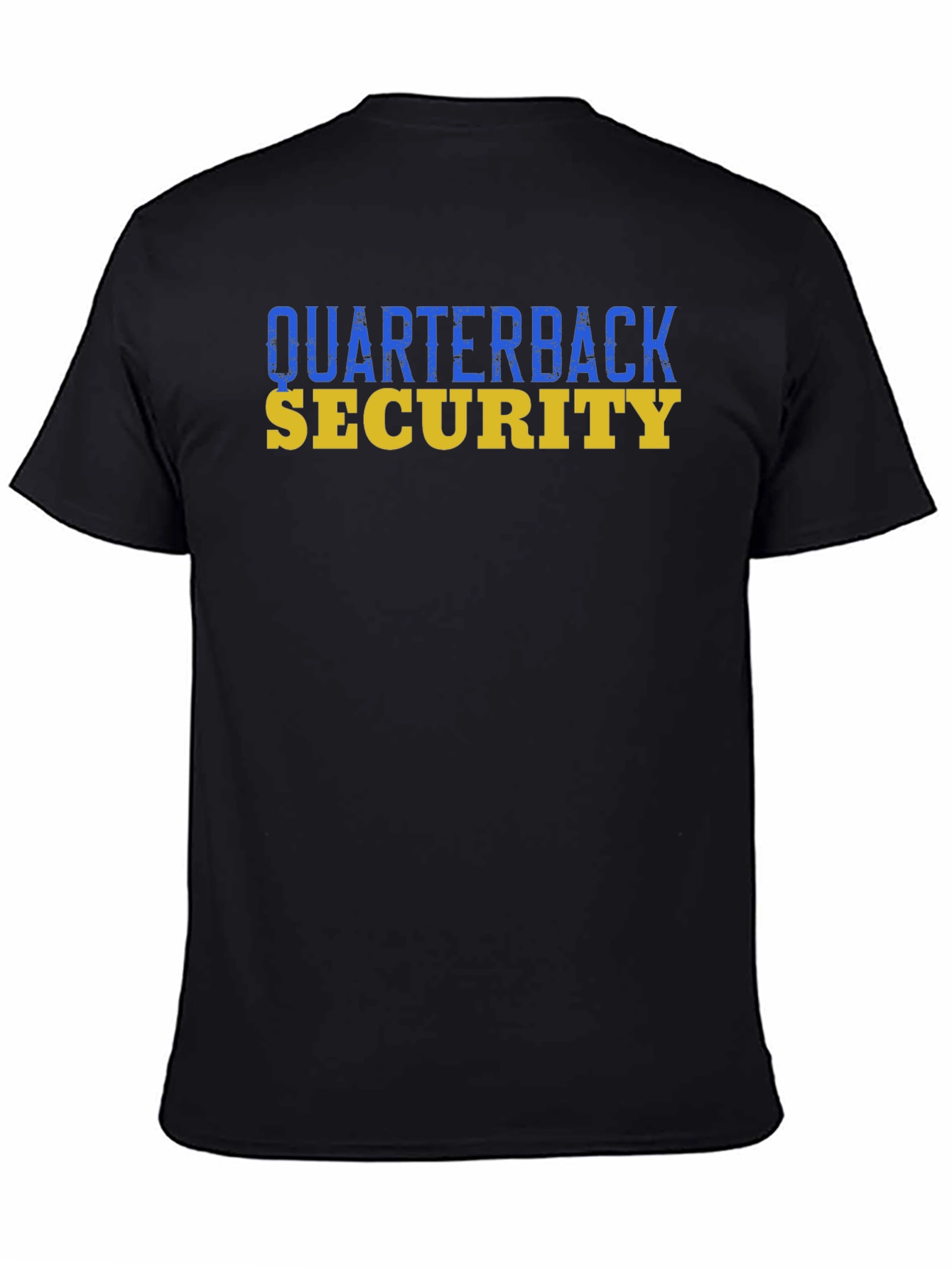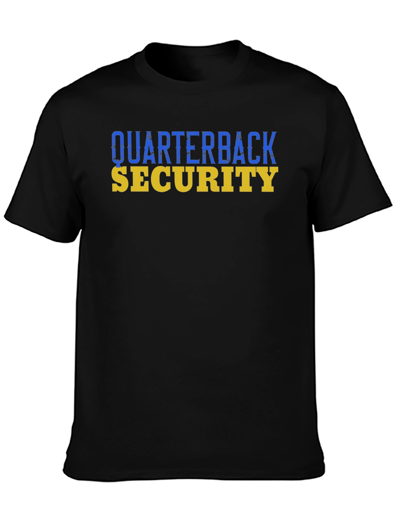 Esta camiseta para hombre presenta un diseño llamativo con las palabras "QUARTERBACK SECURITY" en negrita. La palabra "QUARTERBACK" está en azul, mientras que "SECURITY" se destaca en amarillo, creando un contraste vibrante. La camiseta es de color negro, lo que hace que el diseño resalte aún más. Ideal para fanáticos del fútbol americano o para aquellos que buscan una prenda con un toque de humor. Confeccionada con materiales cómodos, esta camiseta es perfecta para usar en eventos deportivos, salidas casuales o simplemente para relajarse en casa. ¡Muestra tu estilo único con esta camiseta llamativa y original!