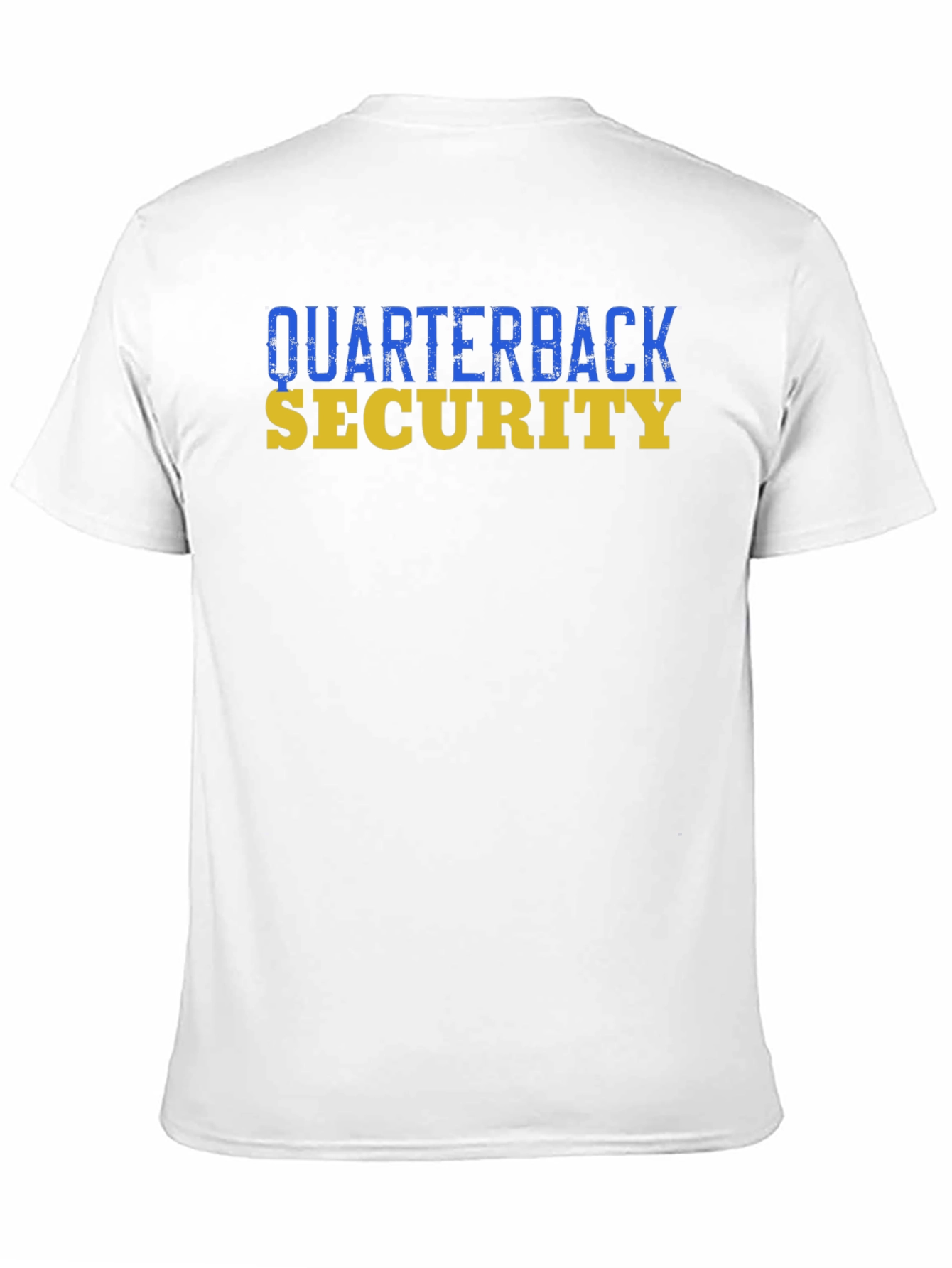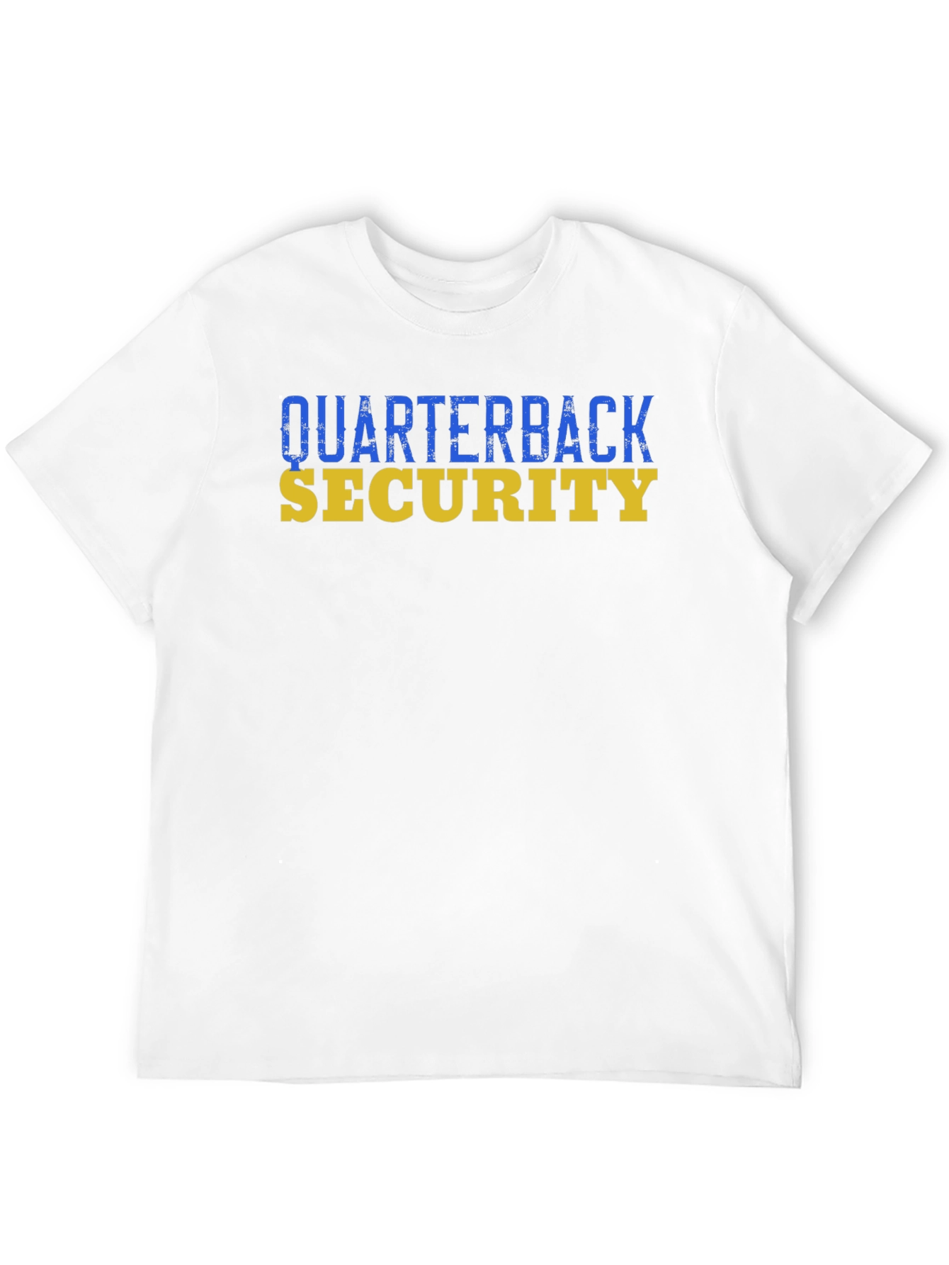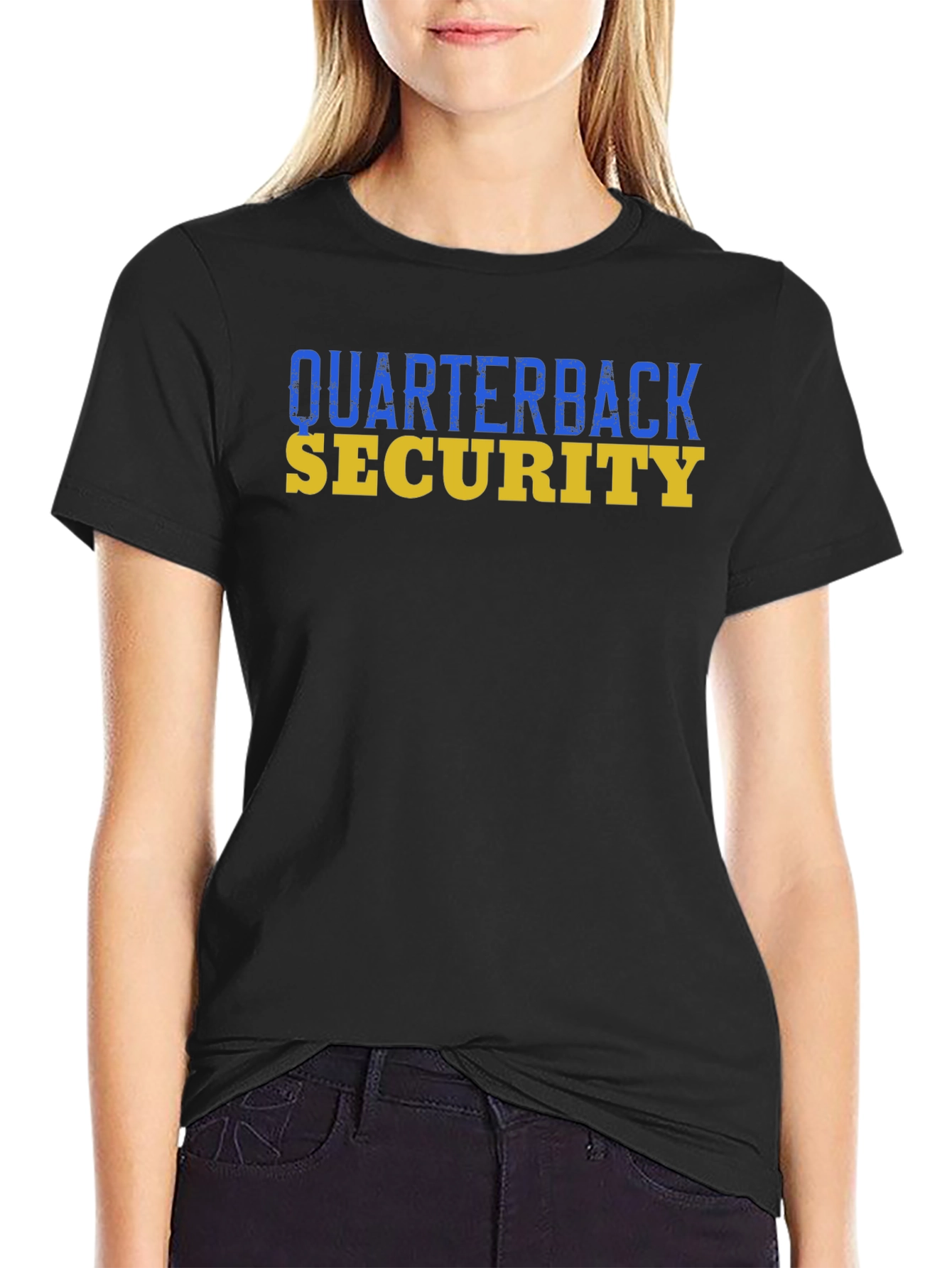 Esta camiseta para hombre presenta un diseño llamativo con las palabras "QUARTERBACK SECURITY" en negrita. La palabra "QUARTERBACK" está en azul, mientras que "SECURITY" se destaca en amarillo, creando un contraste vibrante. La camiseta es de color negro, lo que hace que el diseño resalte aún más. Ideal para fanáticos del fútbol americano o para aquellos que buscan una prenda con un toque de humor. Confeccionada con materiales cómodos, esta camiseta es perfecta para usar en eventos deportivos, salidas casuales o simplemente para relajarse en casa. ¡Muestra tu estilo único con esta camiseta llamativa y original!